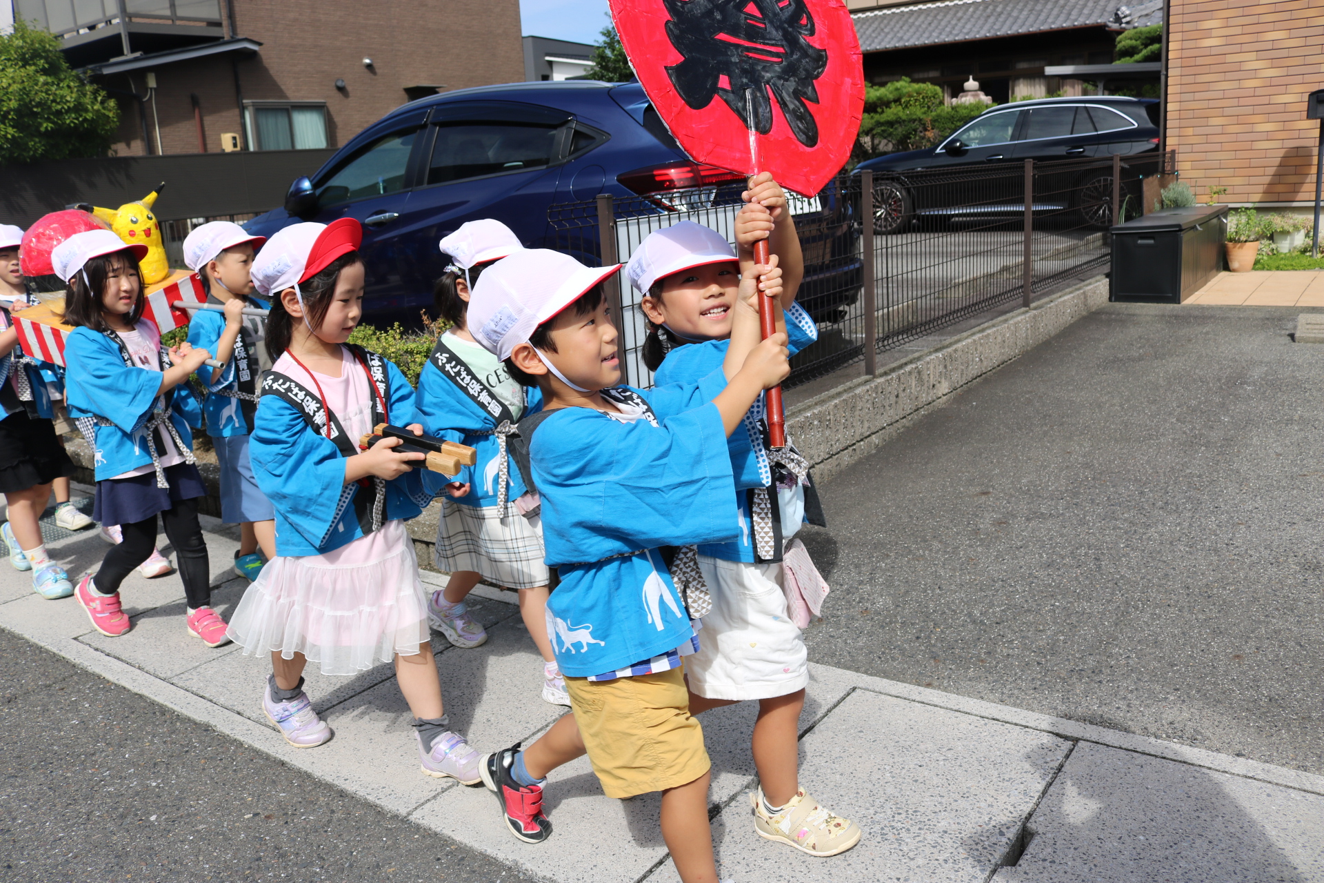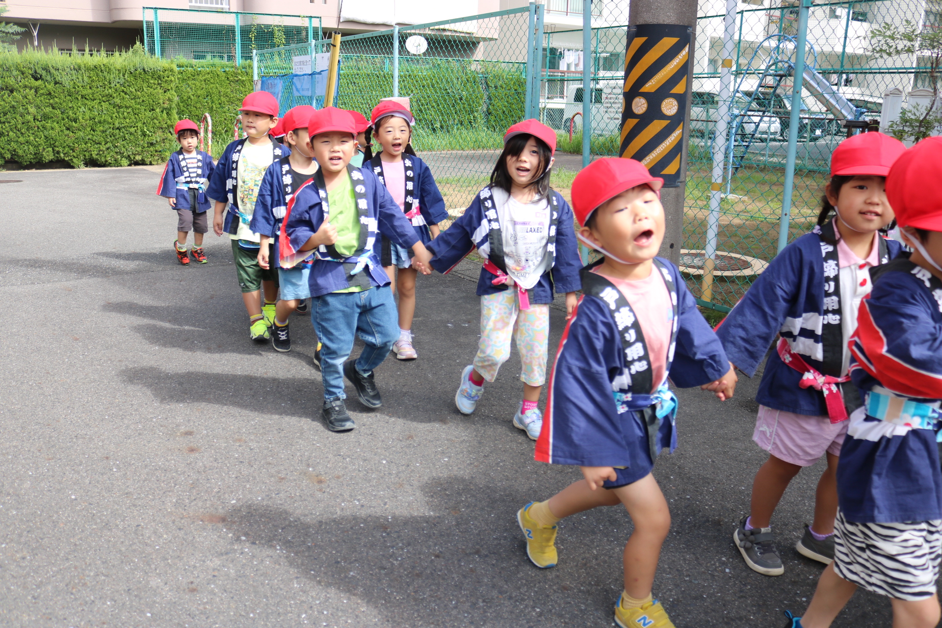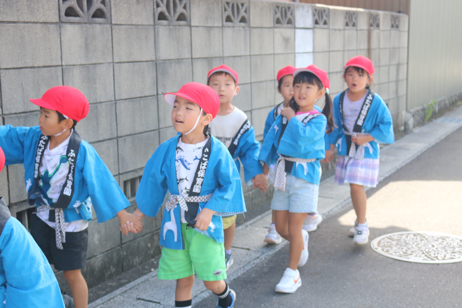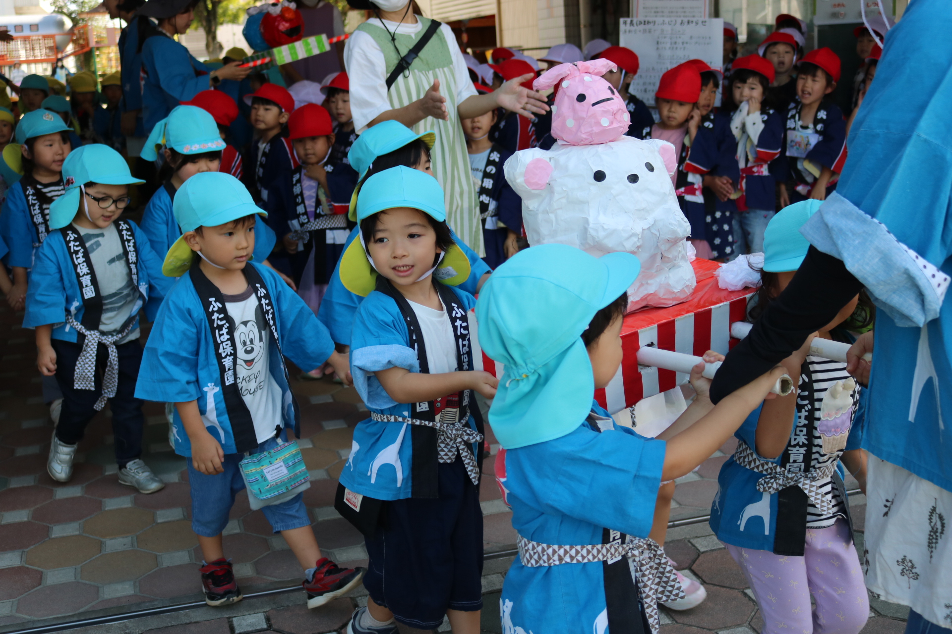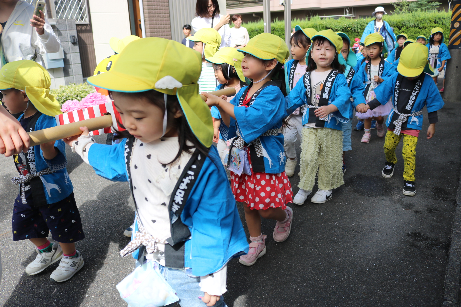 お祭りごっこを楽しんだ子どもたち。お神輿を担いで、近所を歩いてまわりましたよ😊