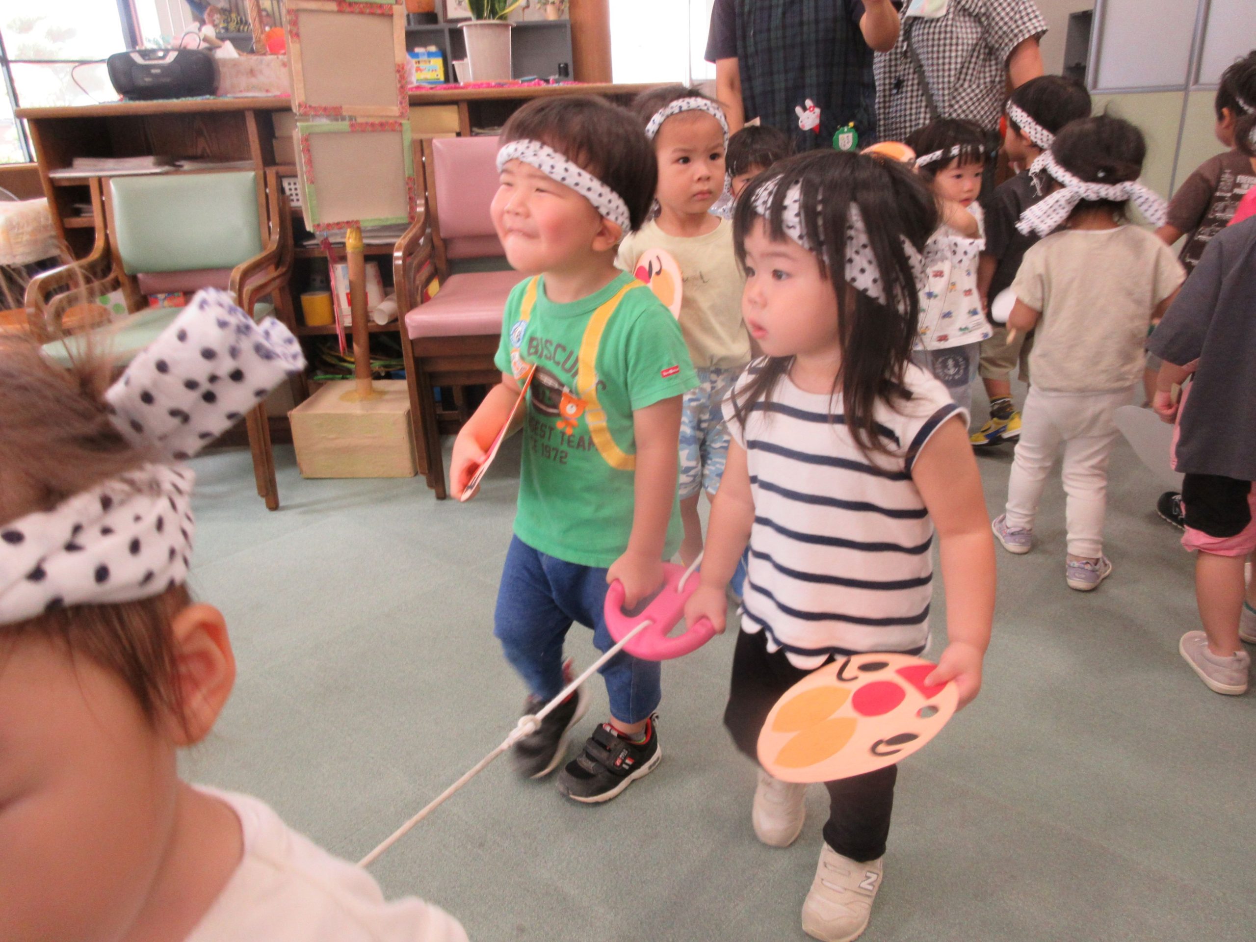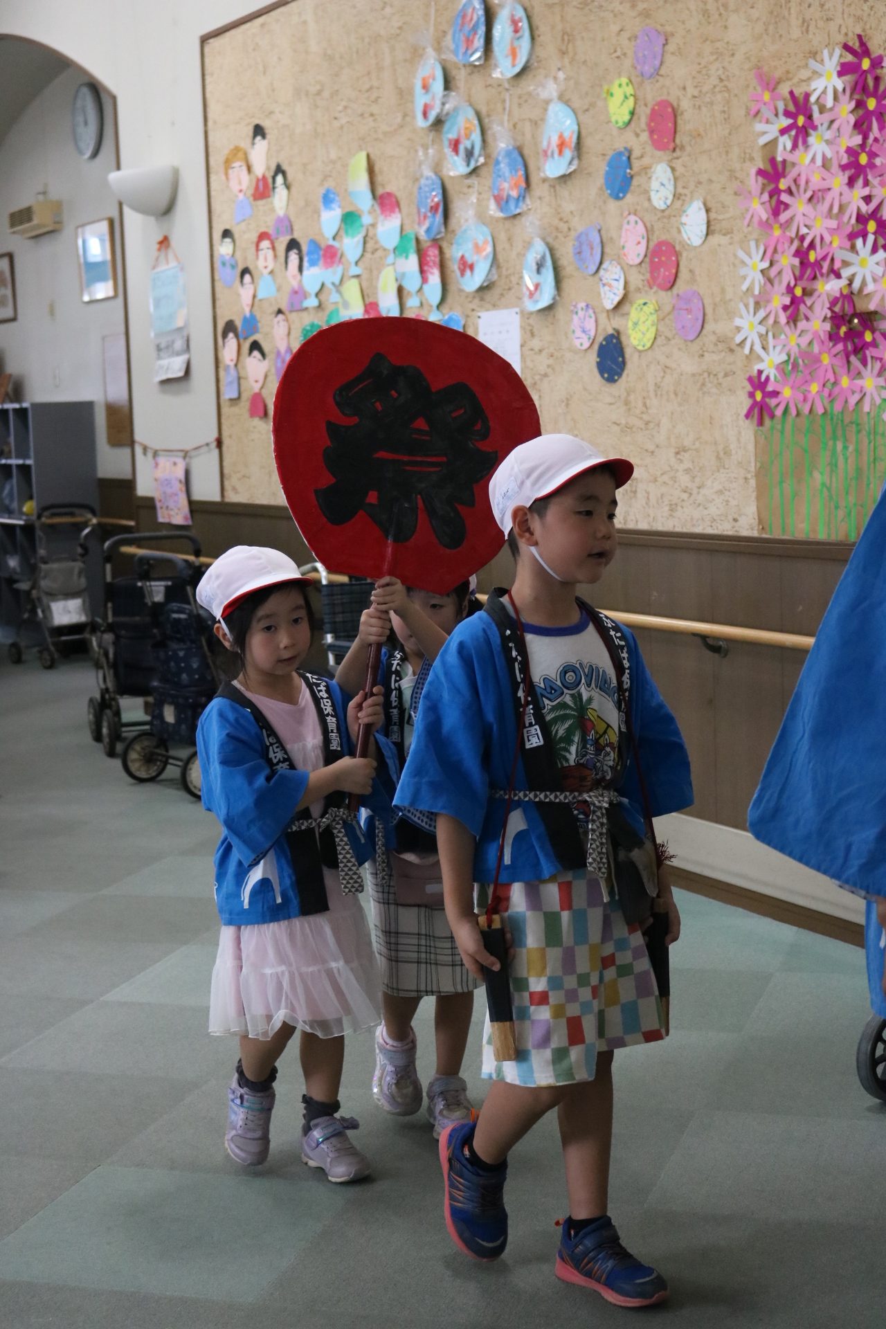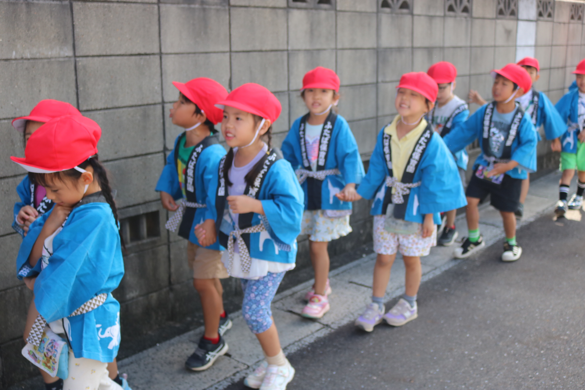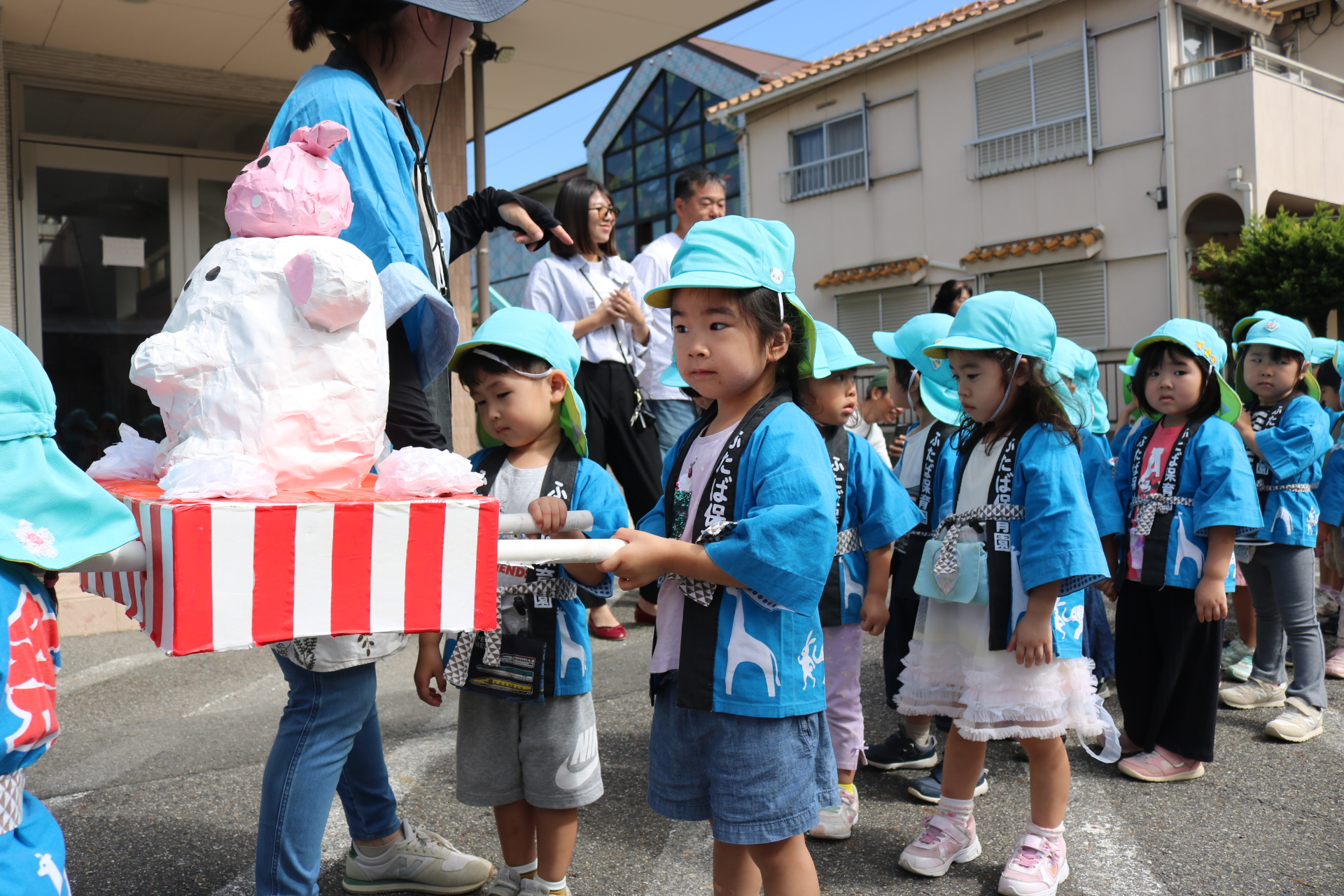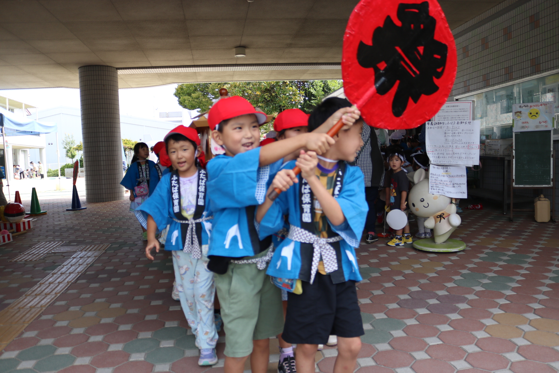 お祭りごっこを楽しんだ子どもたち。お神輿を担いで、近所を歩いてまわりましたよ😊