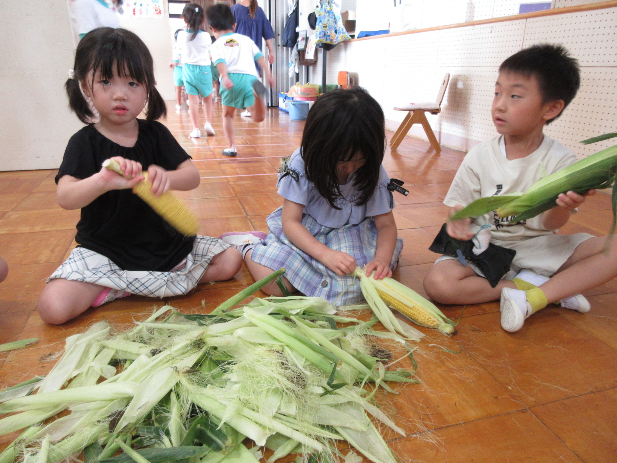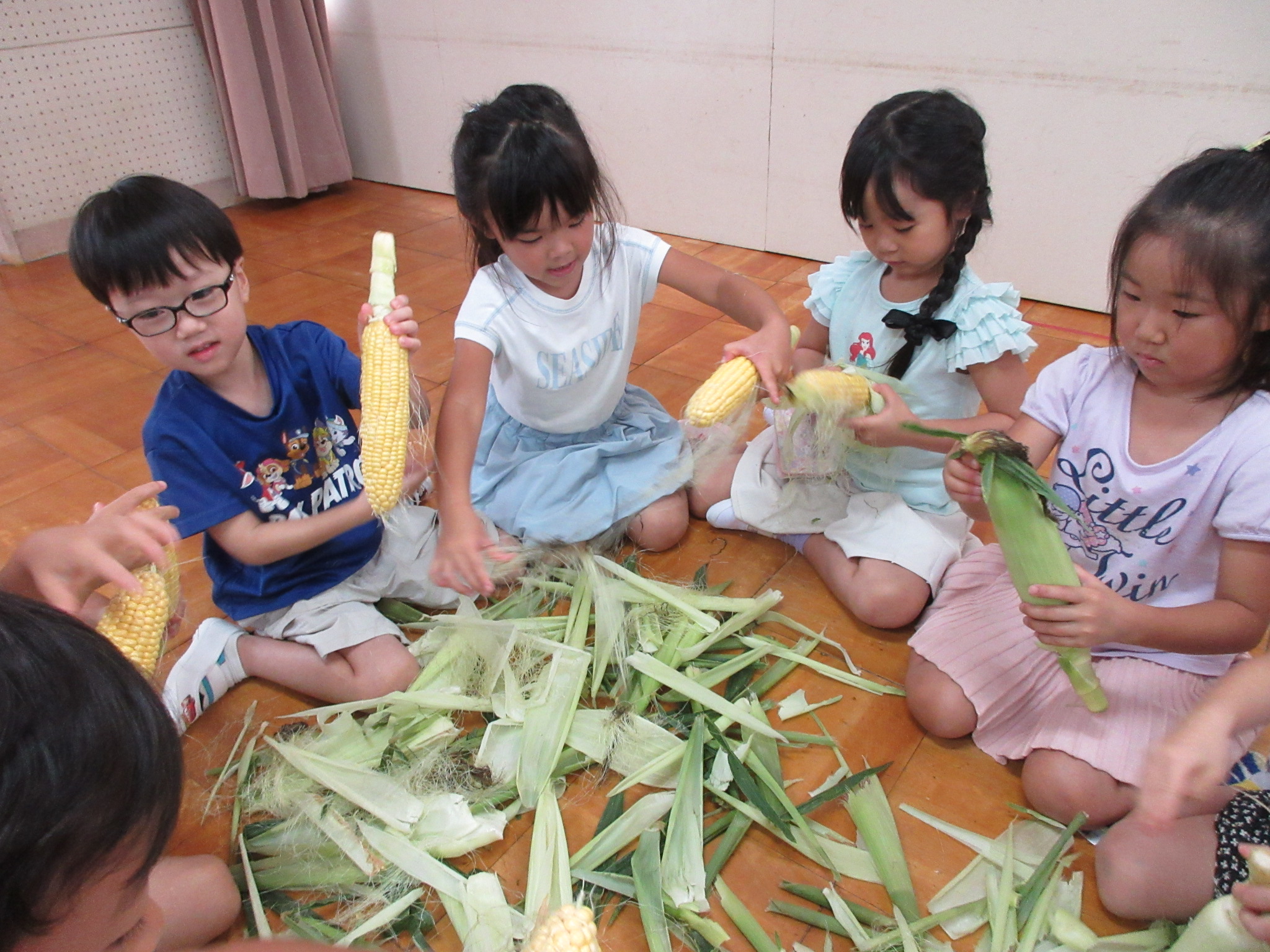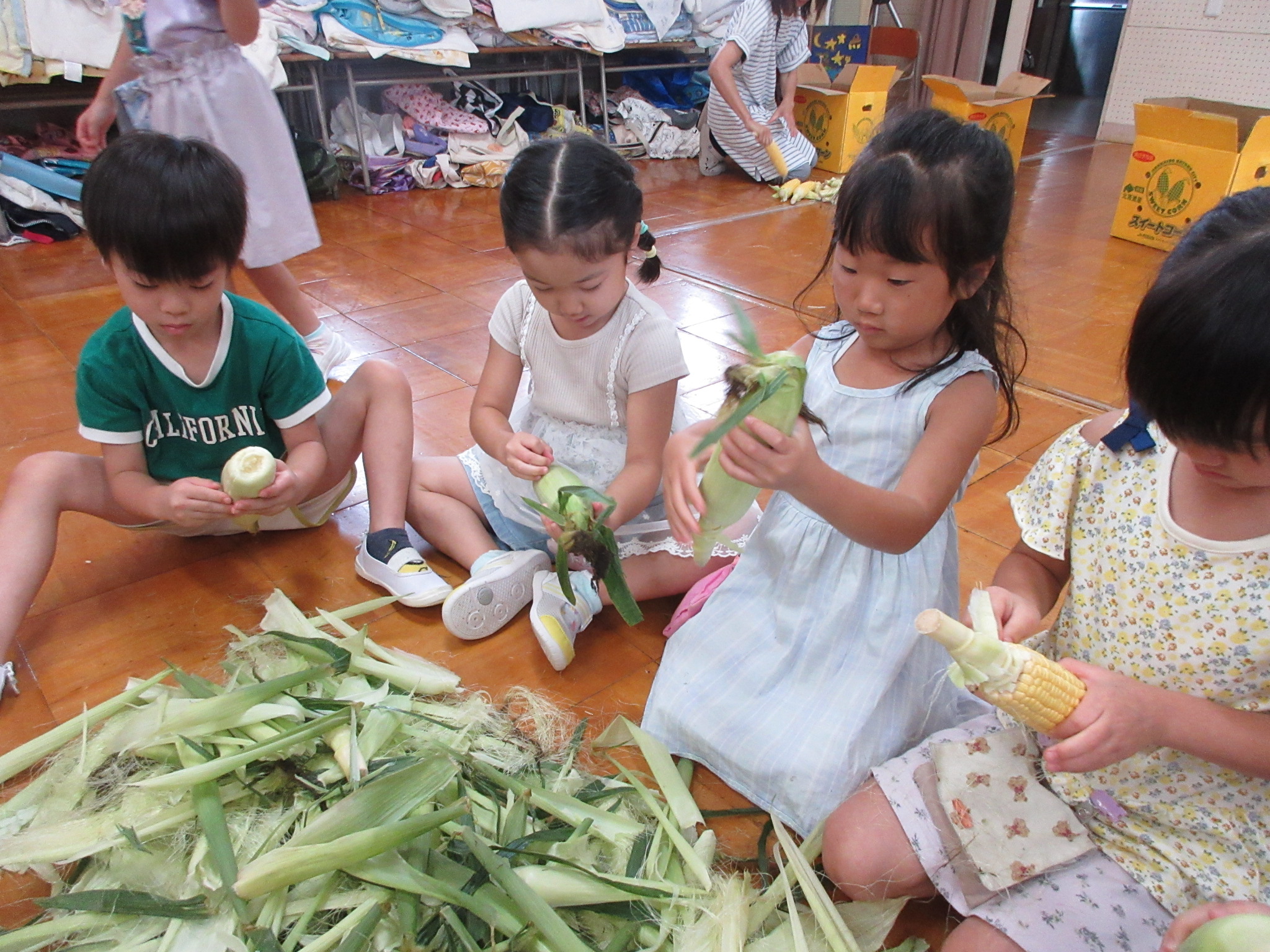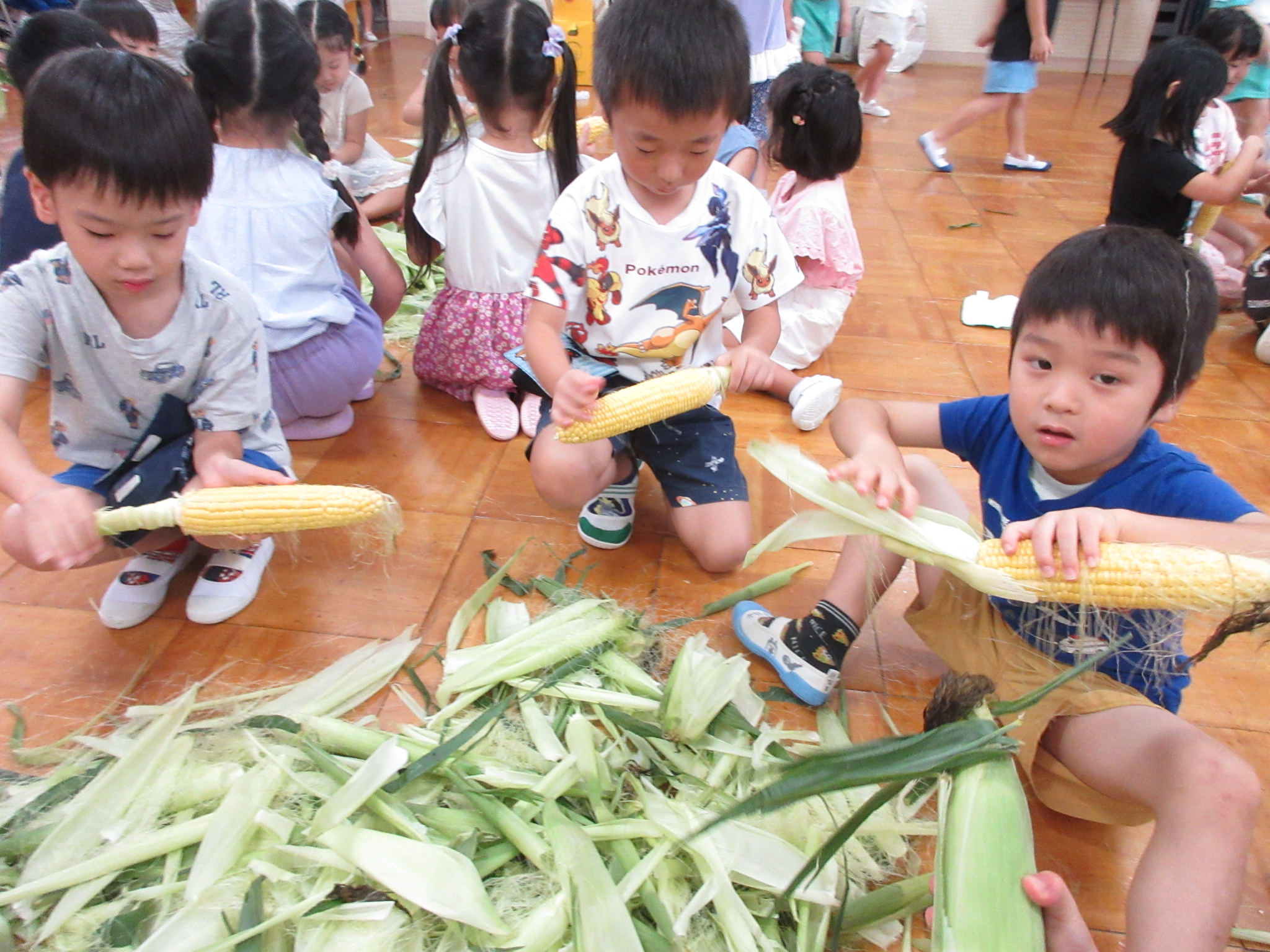 おやつに出すとうもろこしの皮むきを年長さんがしてくれました😊