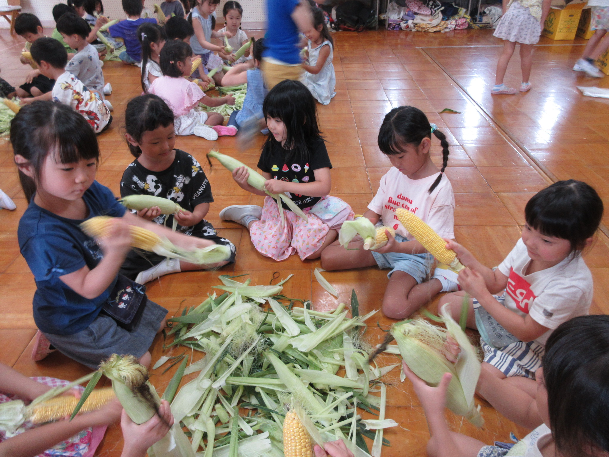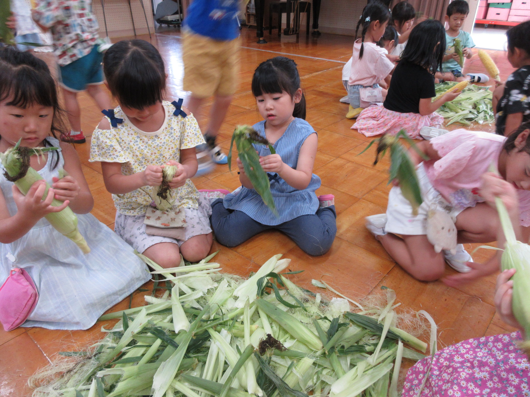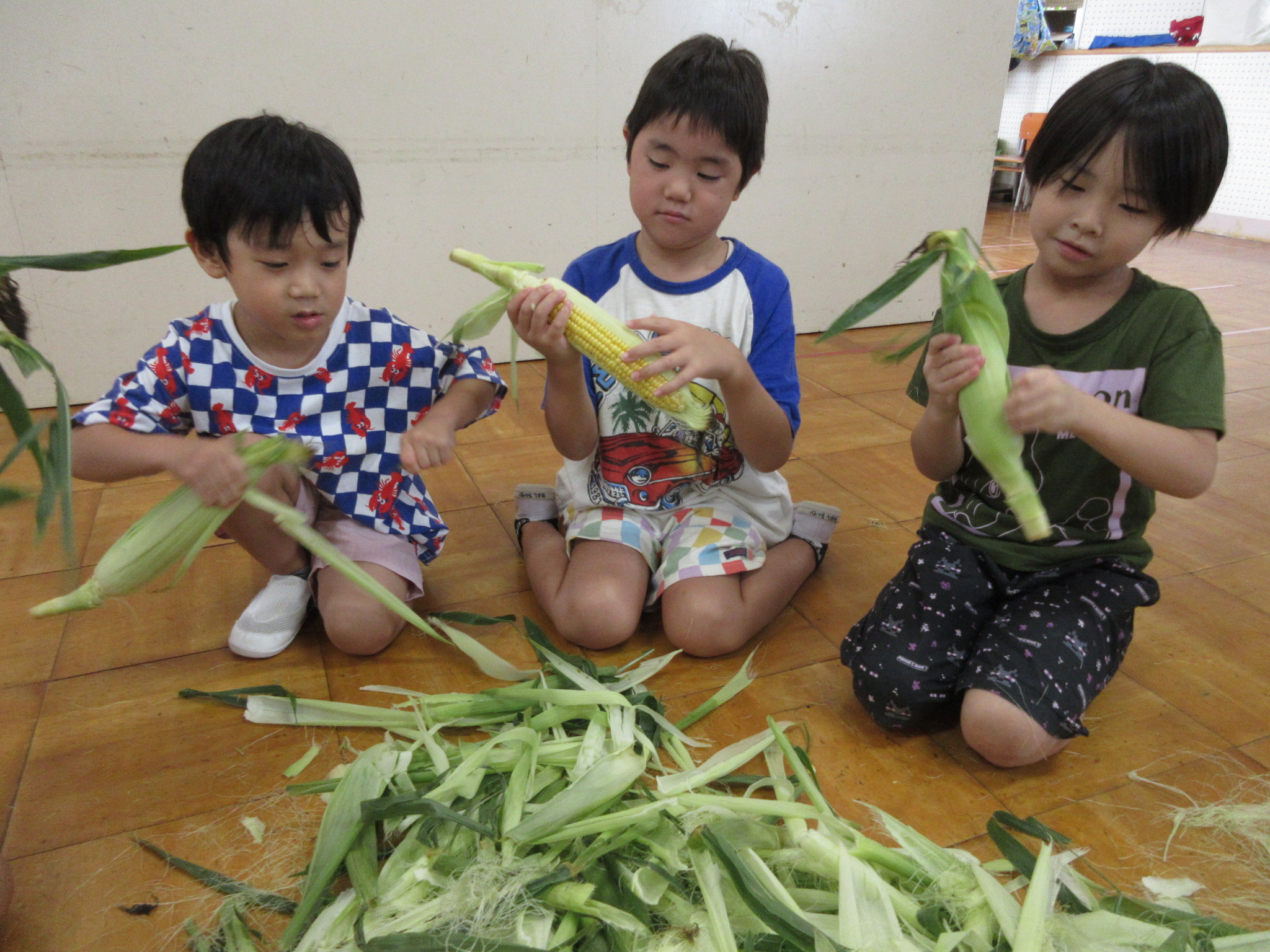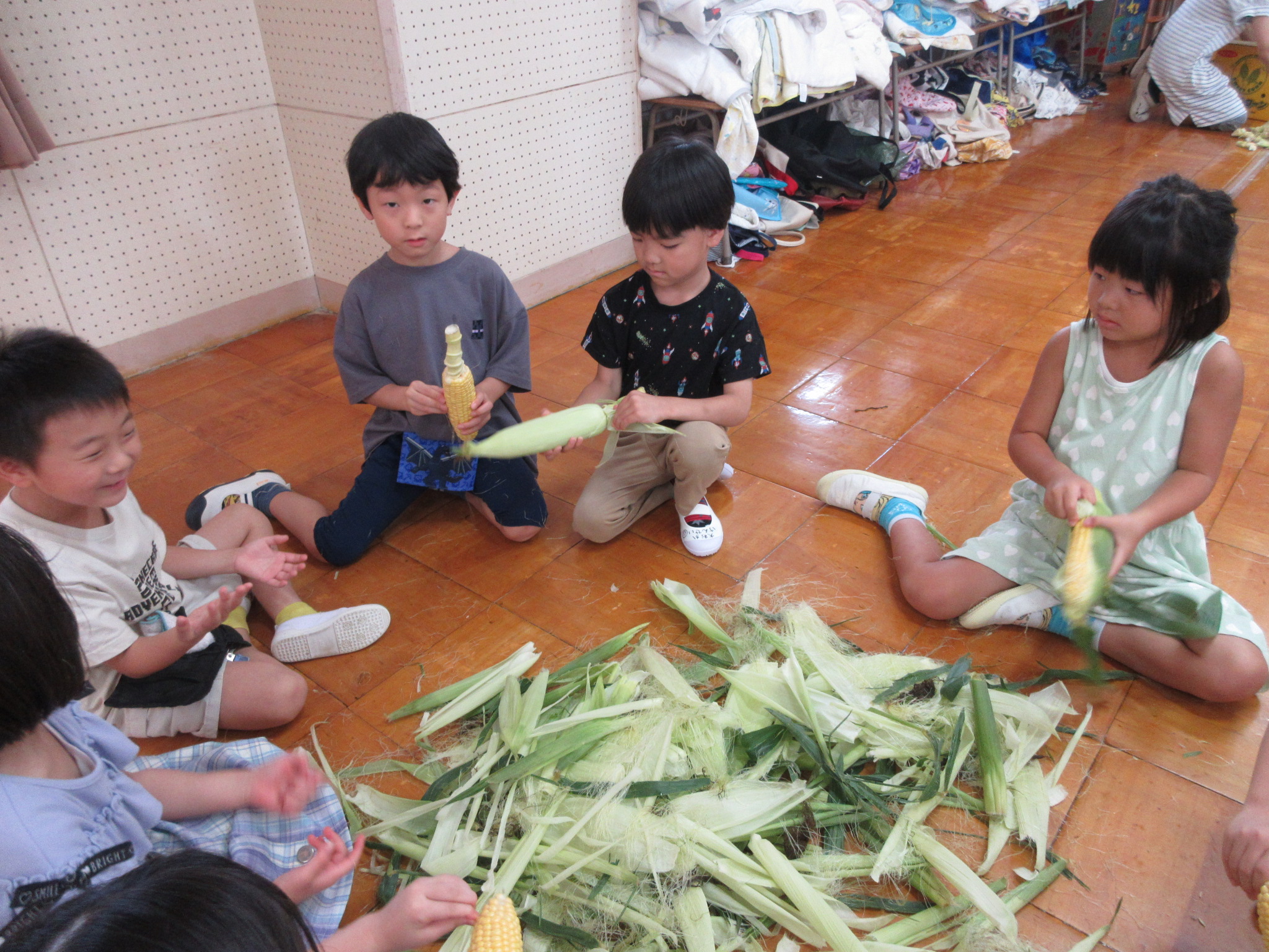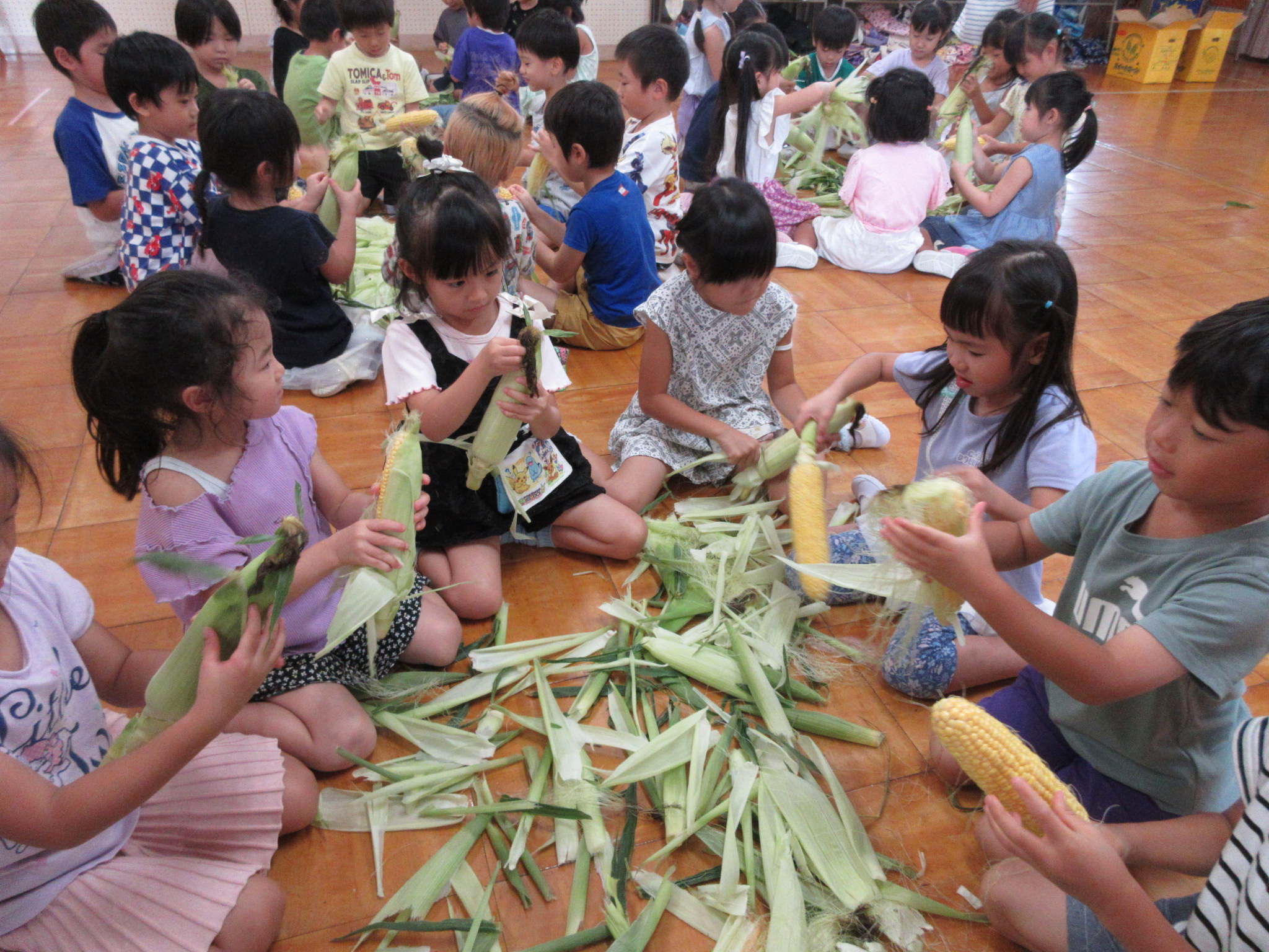 おやつに出すとうもろこしの皮むきを年長さんがしてくれました😊