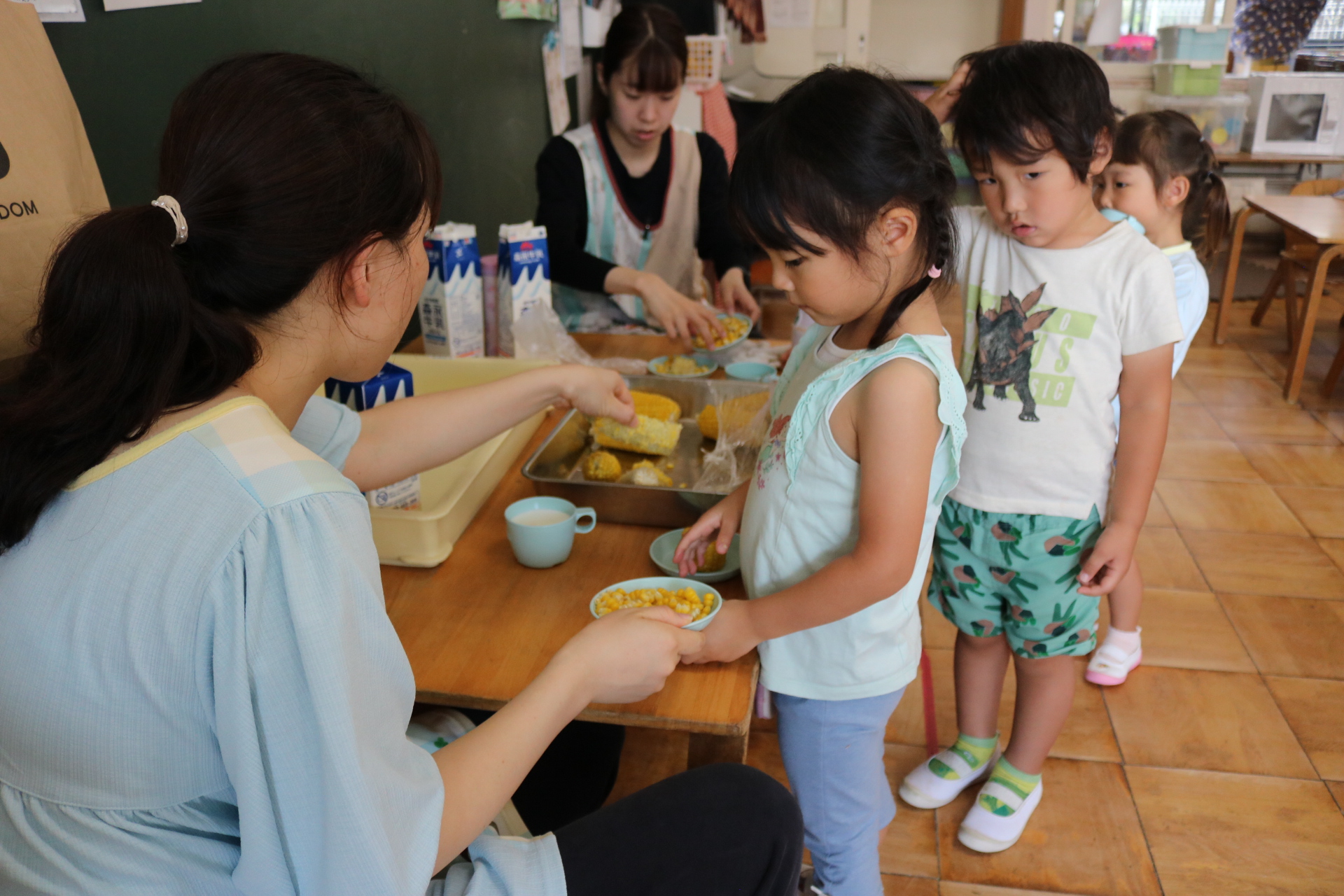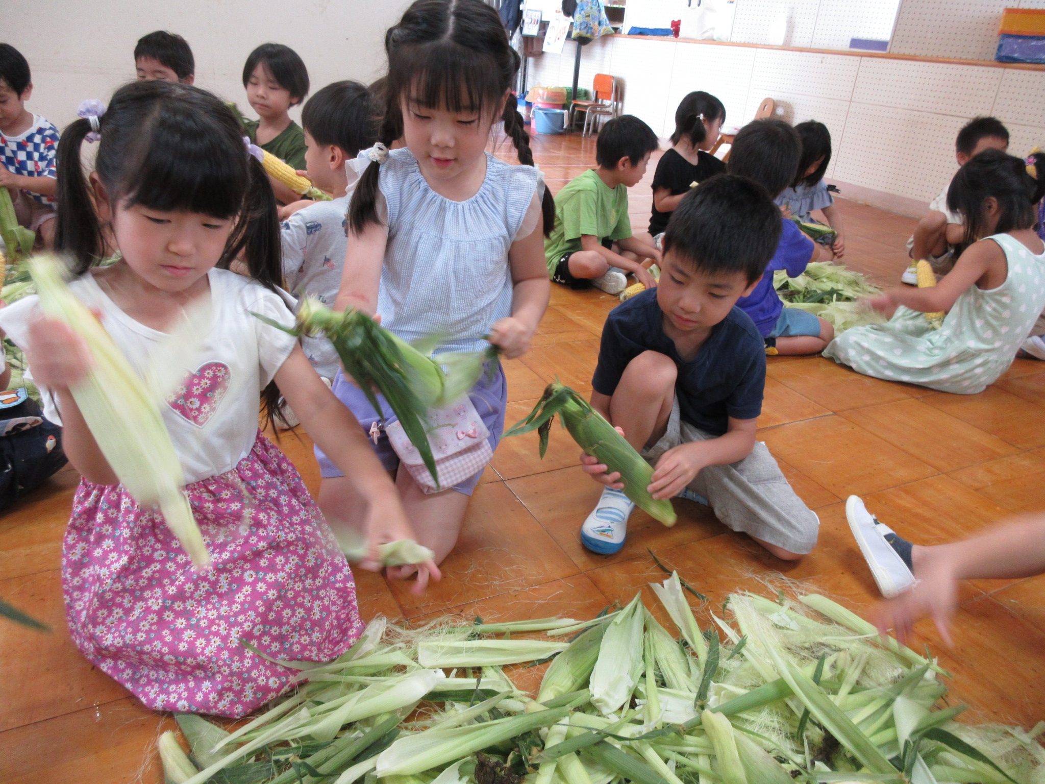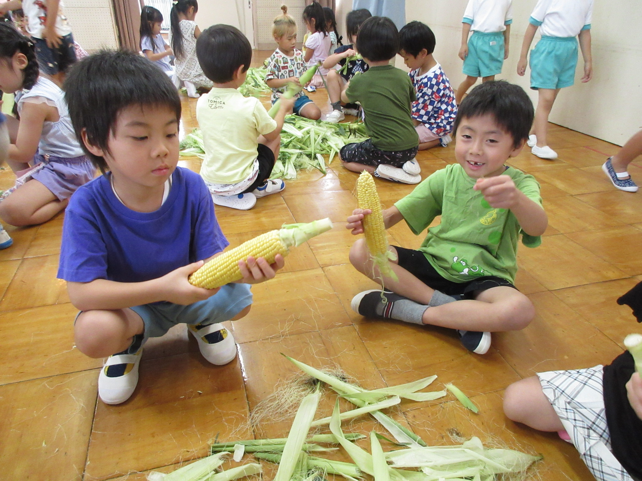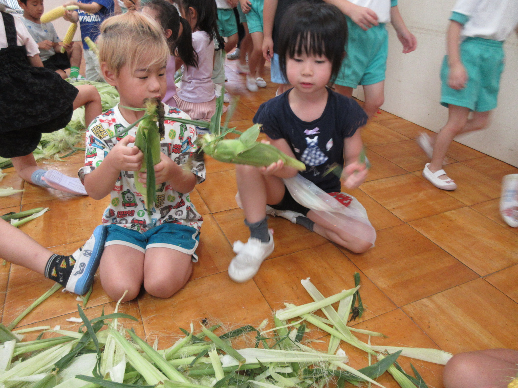 おやつに出すとうもろこしの皮むきを年長さんがしてくれました😊