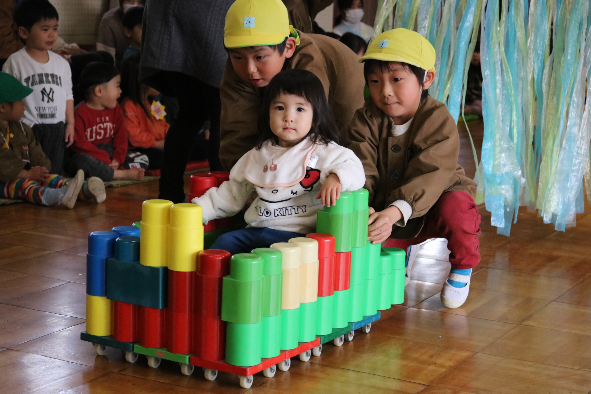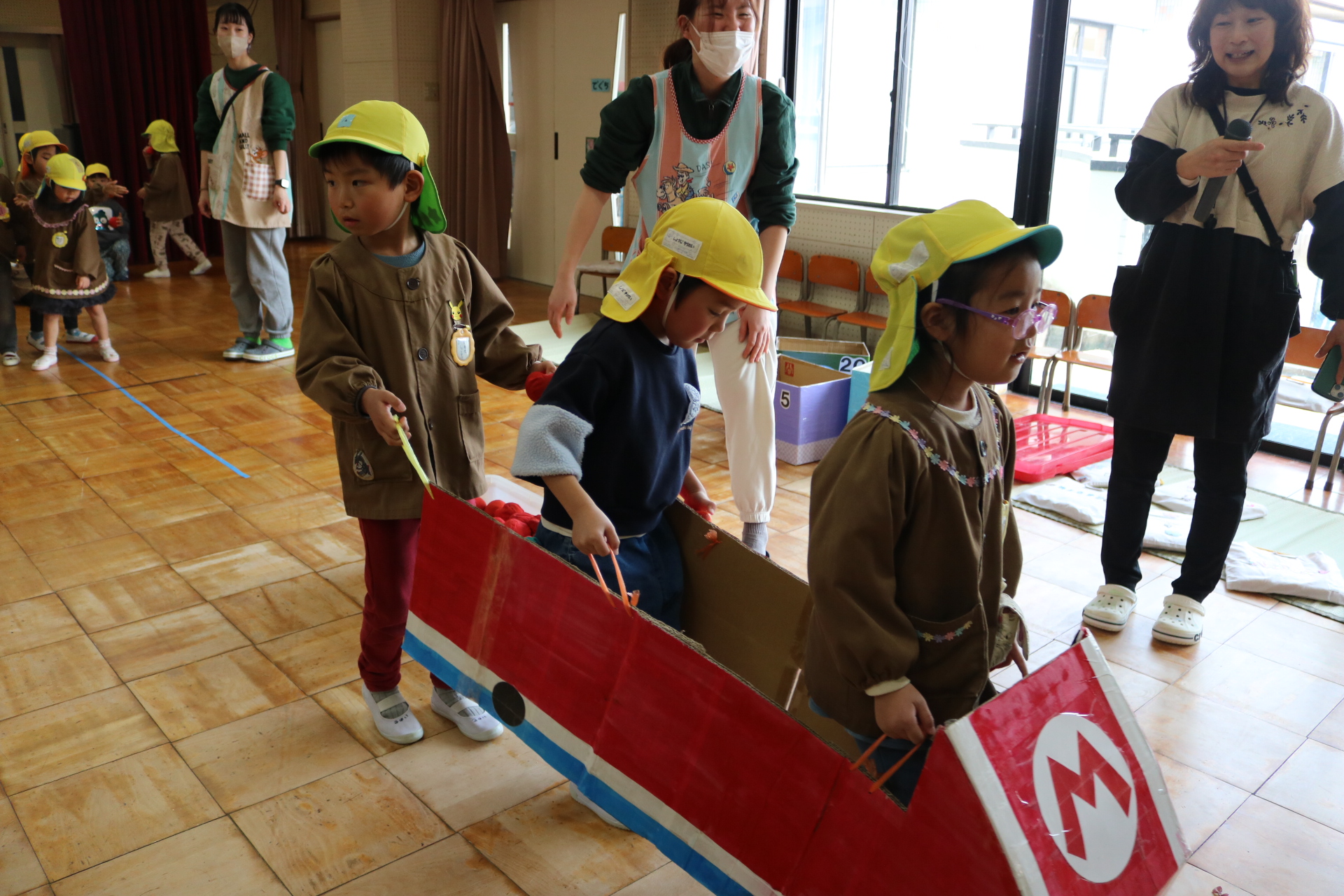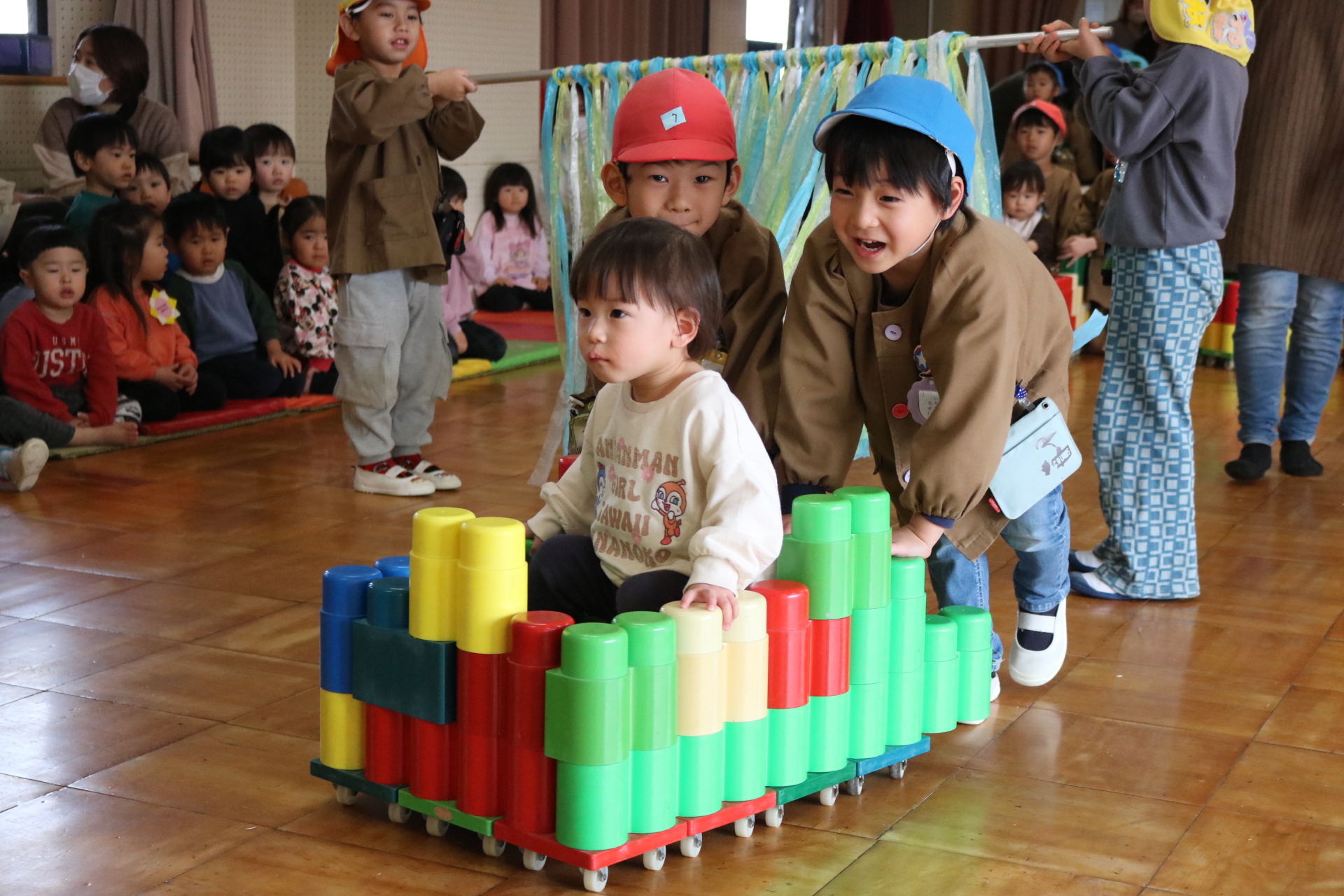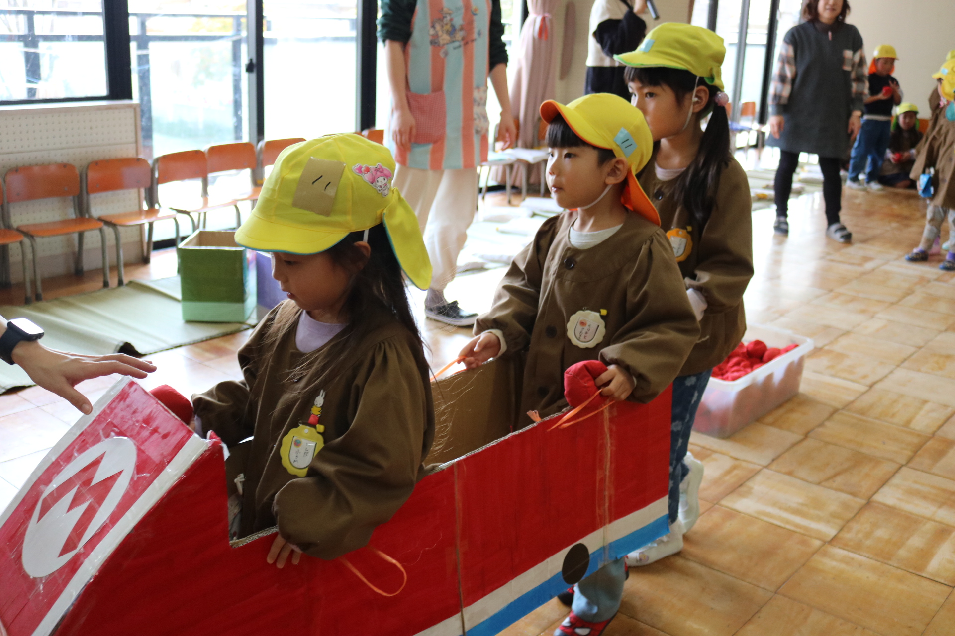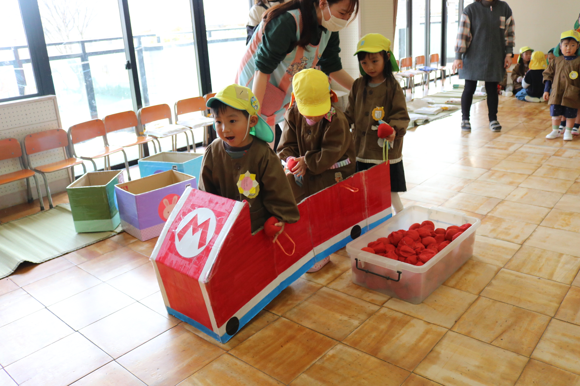 電車や車に乗ったり、玉入れやボール運びなどいろんなゲームを楽しみましたよ😆