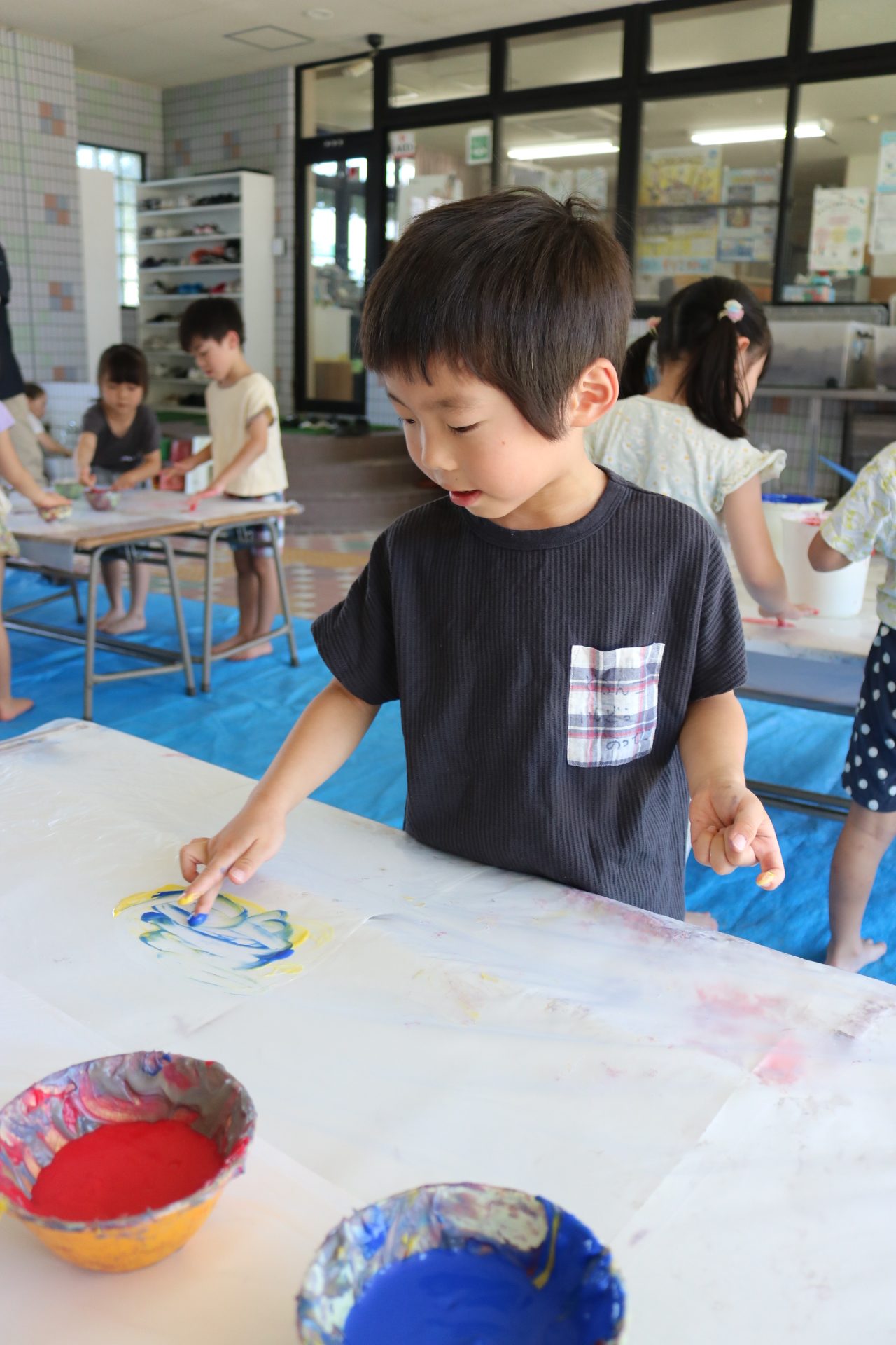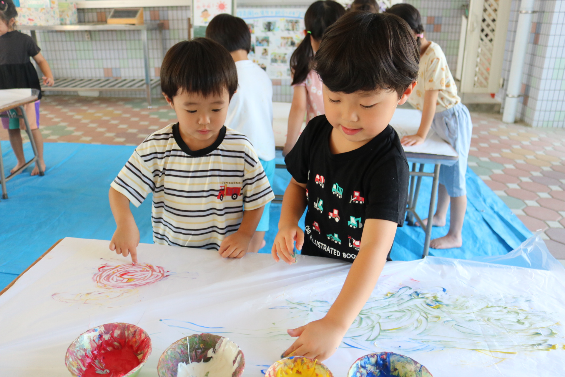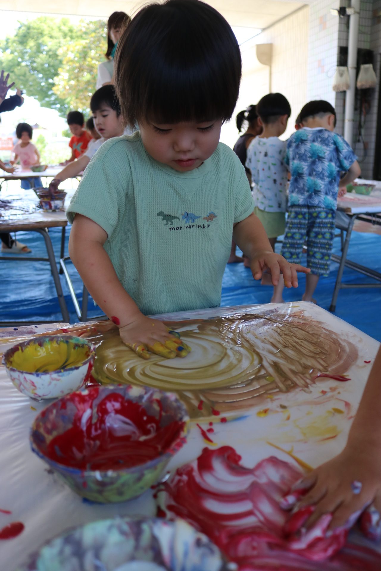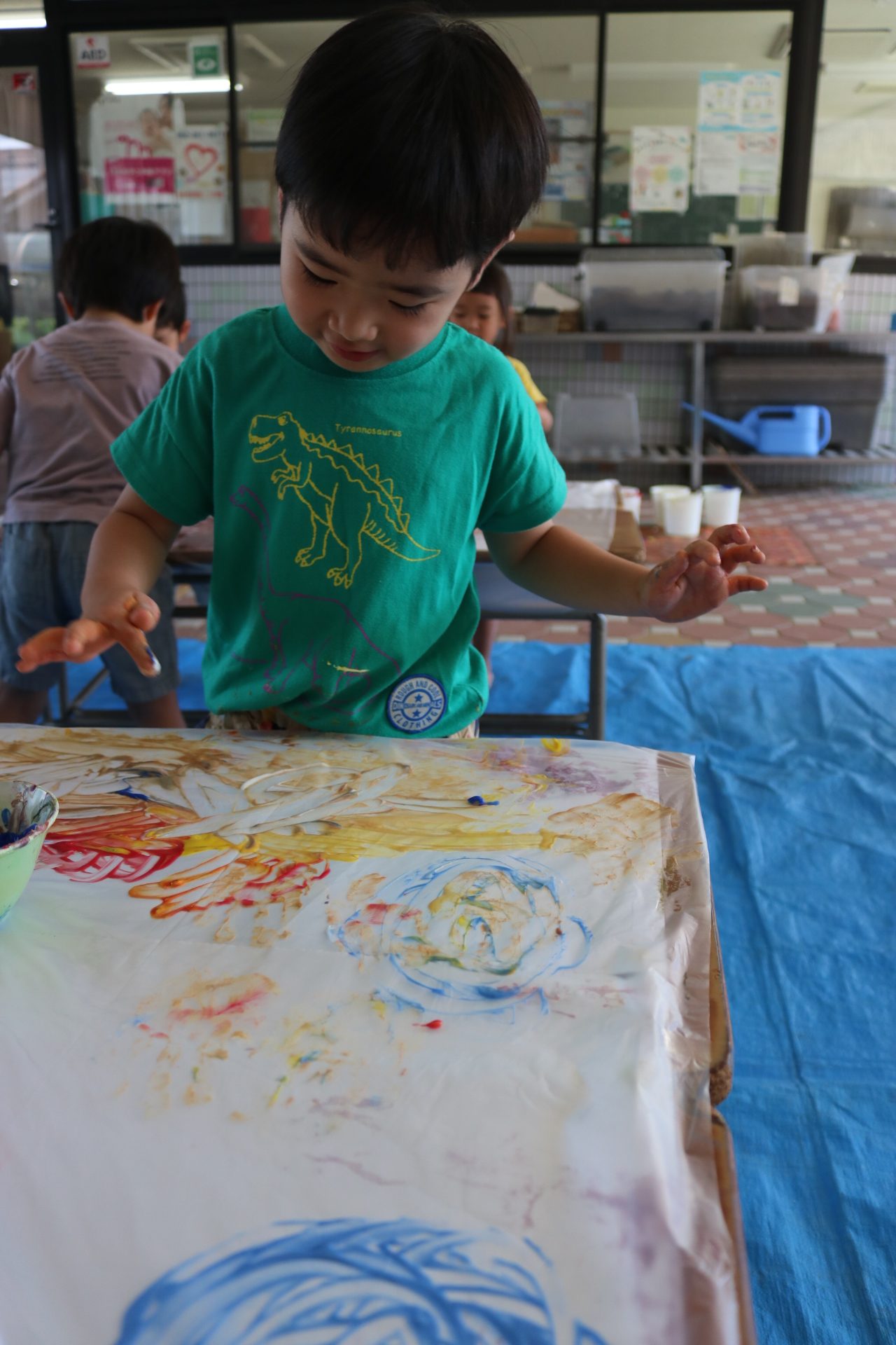 ダイナミックに感触を楽しんでフィンガーをする子どもたち。色の混ぜ方も上手でした😊
