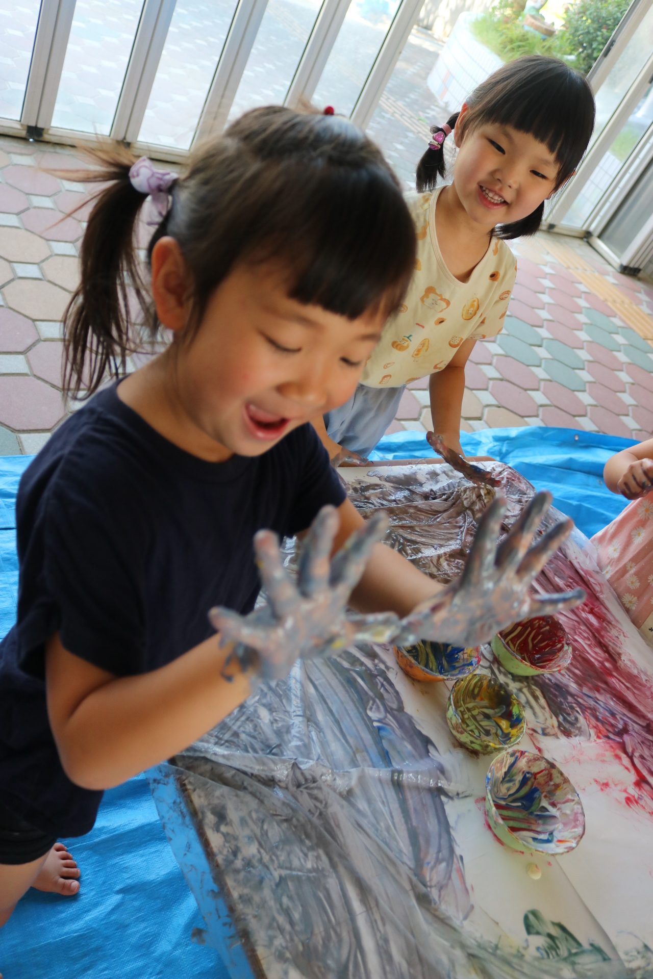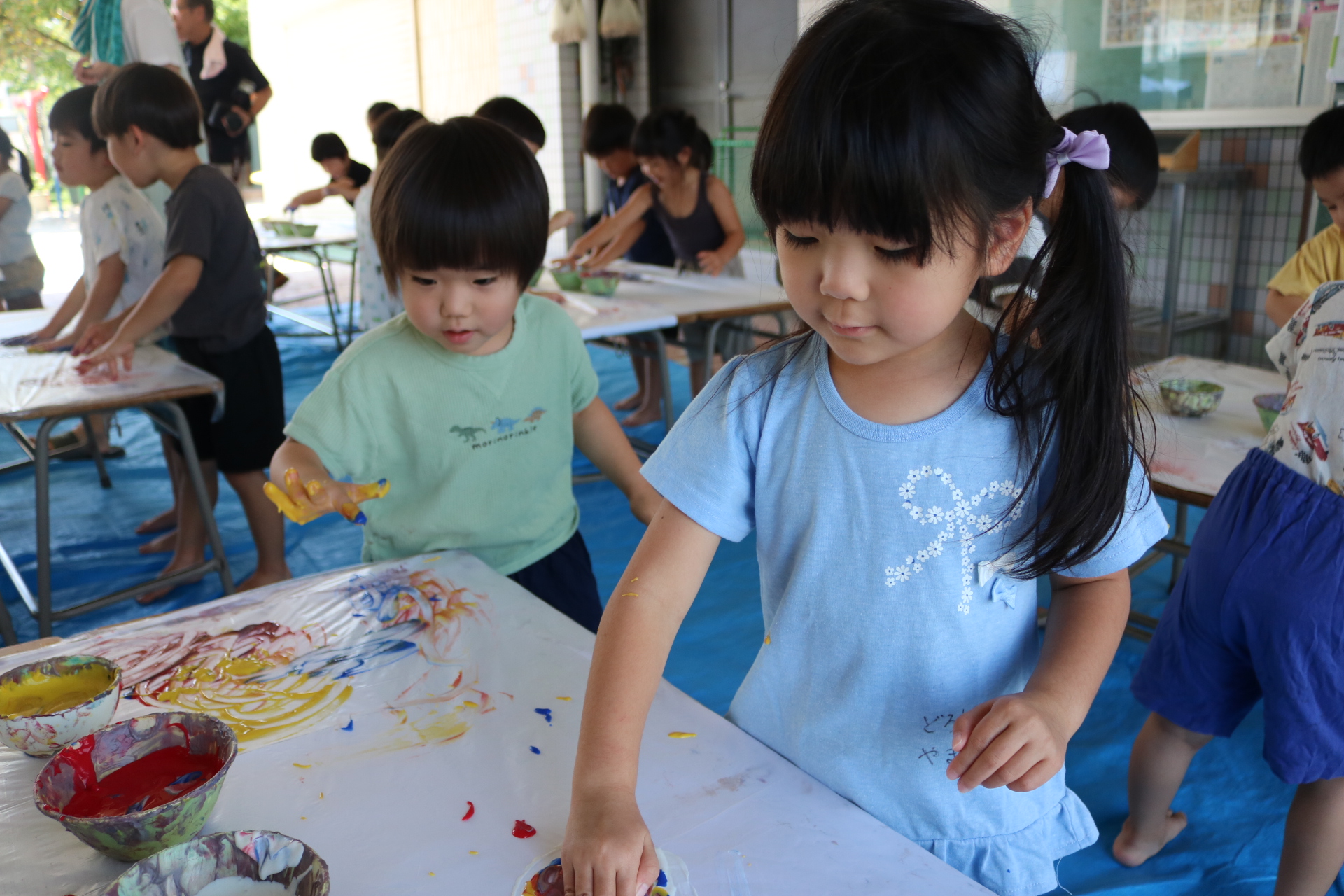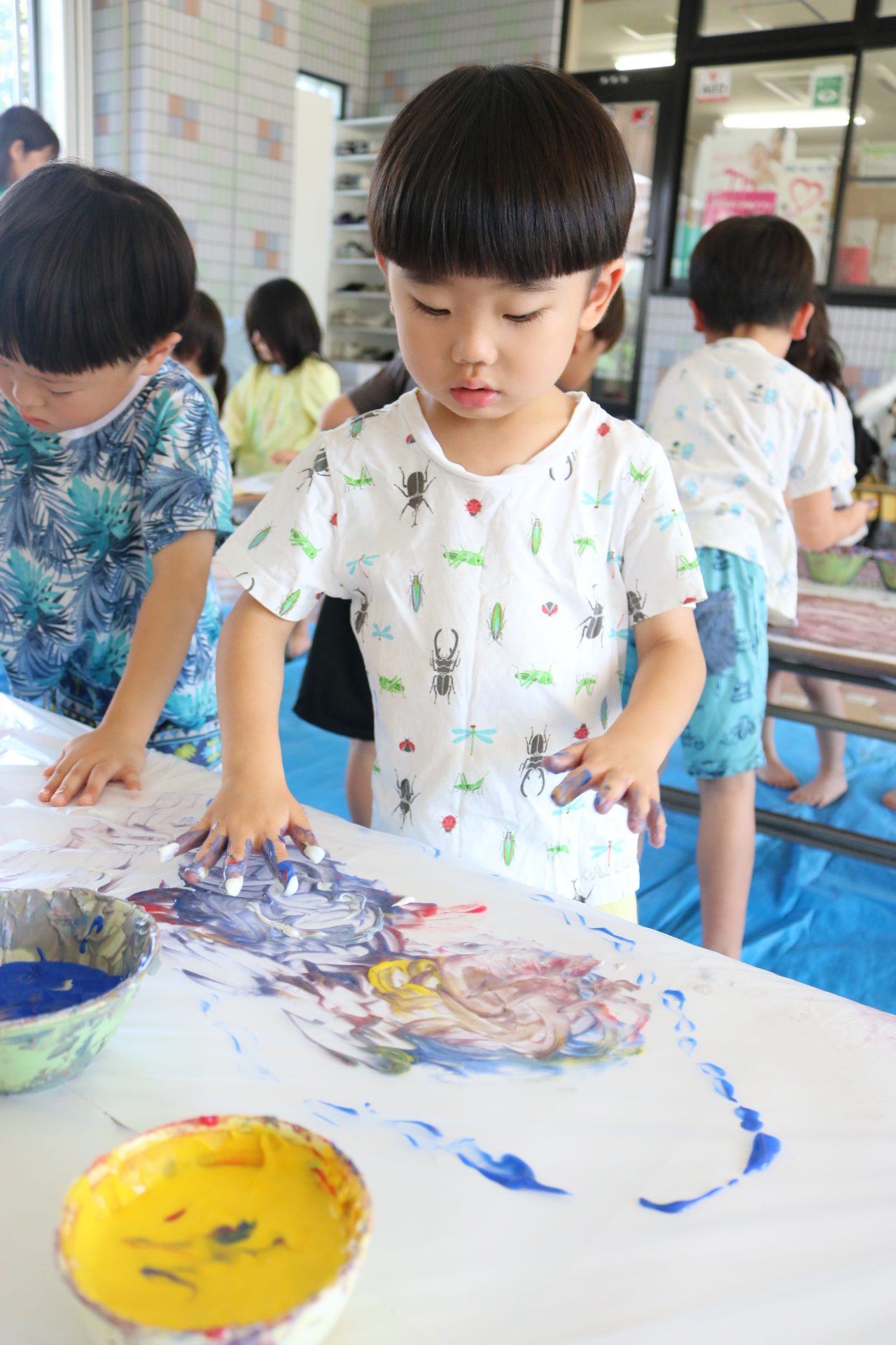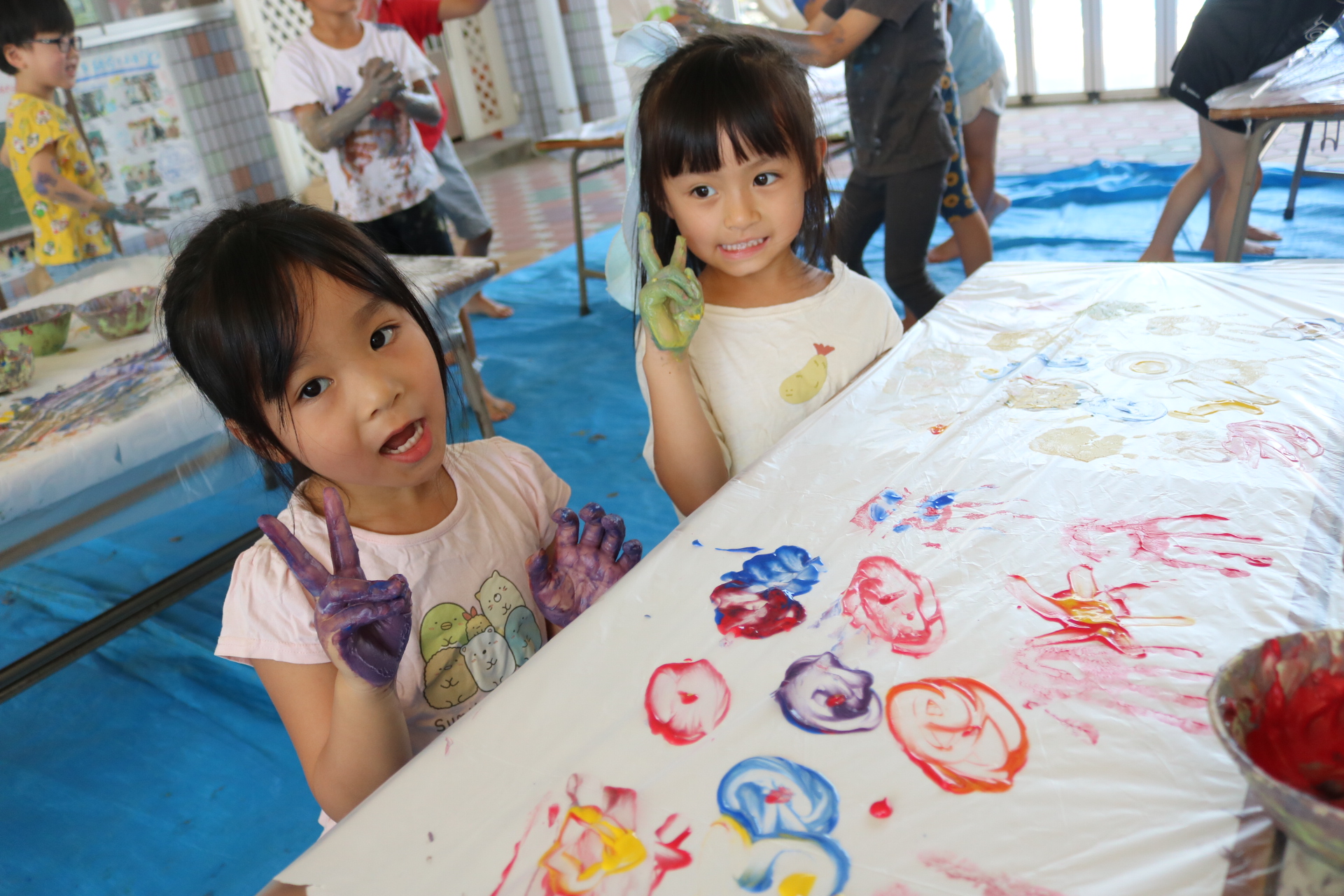 ダイナミックに感触を楽しんでフィンガーをする子どもたち。色の混ぜ方も上手でした😊