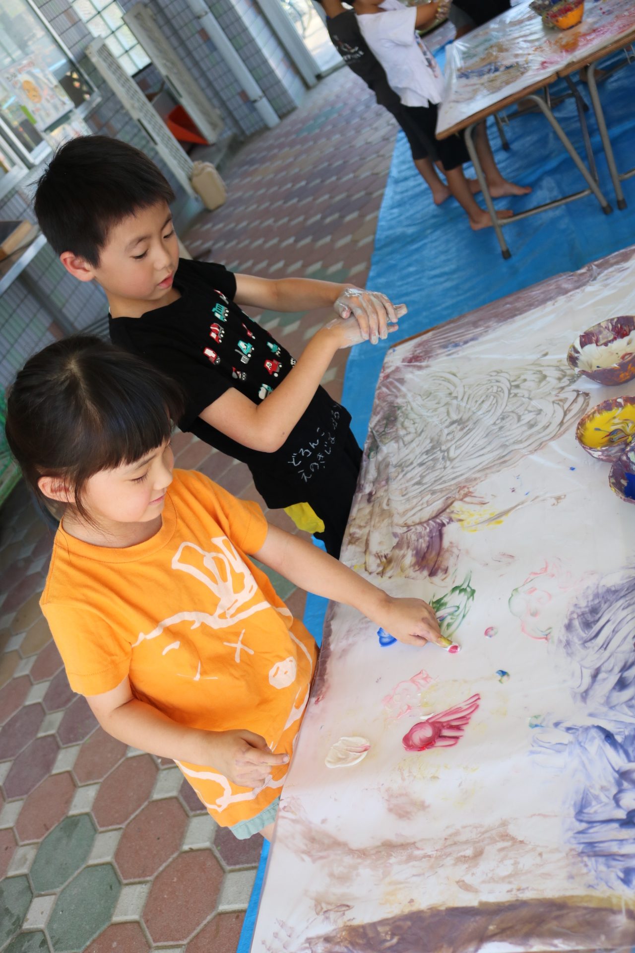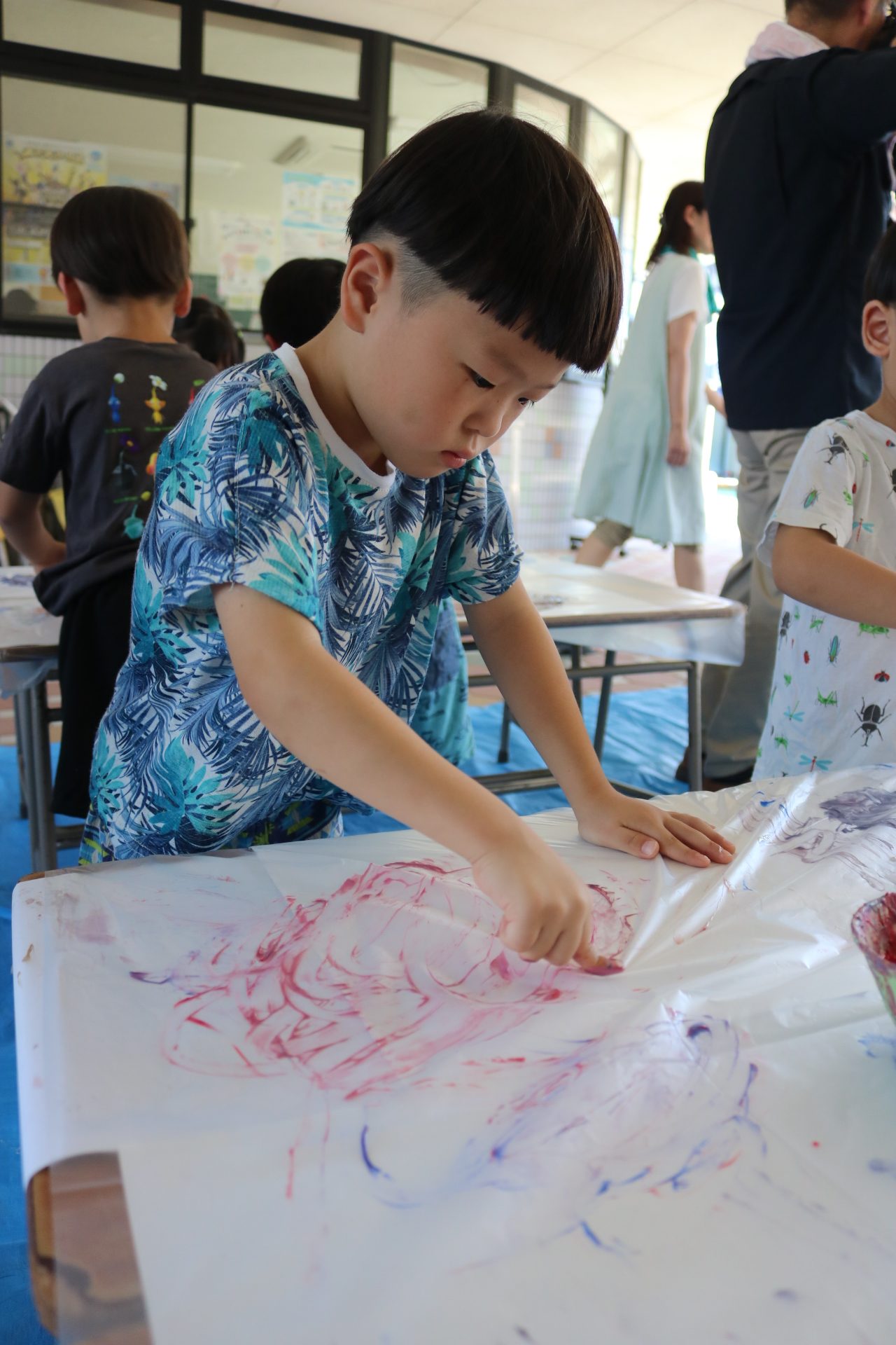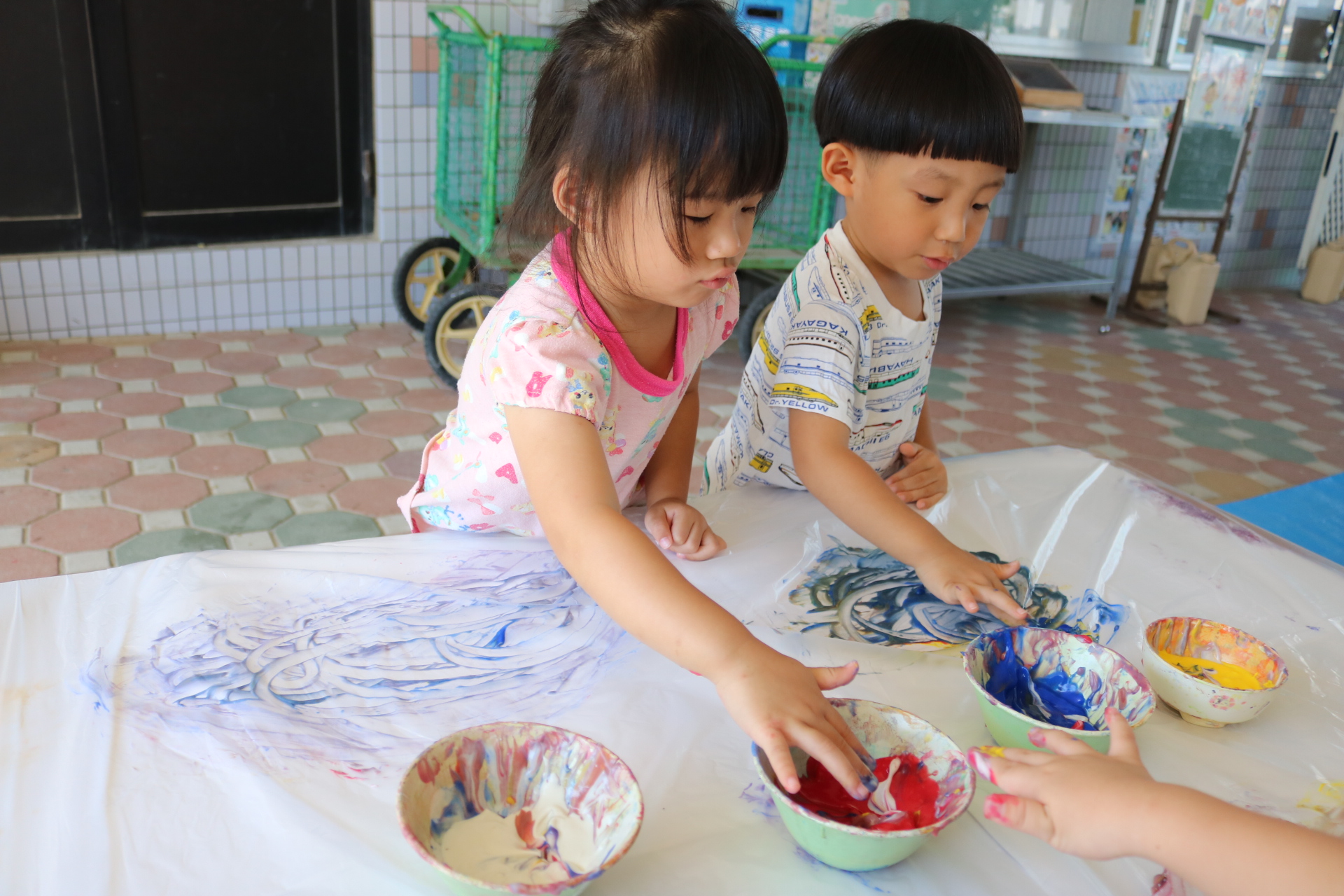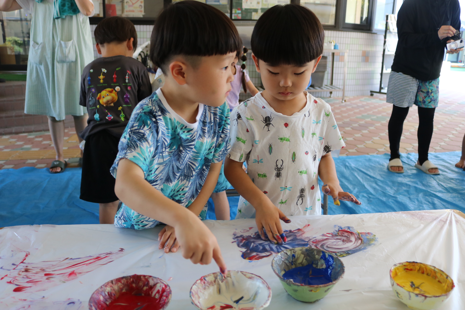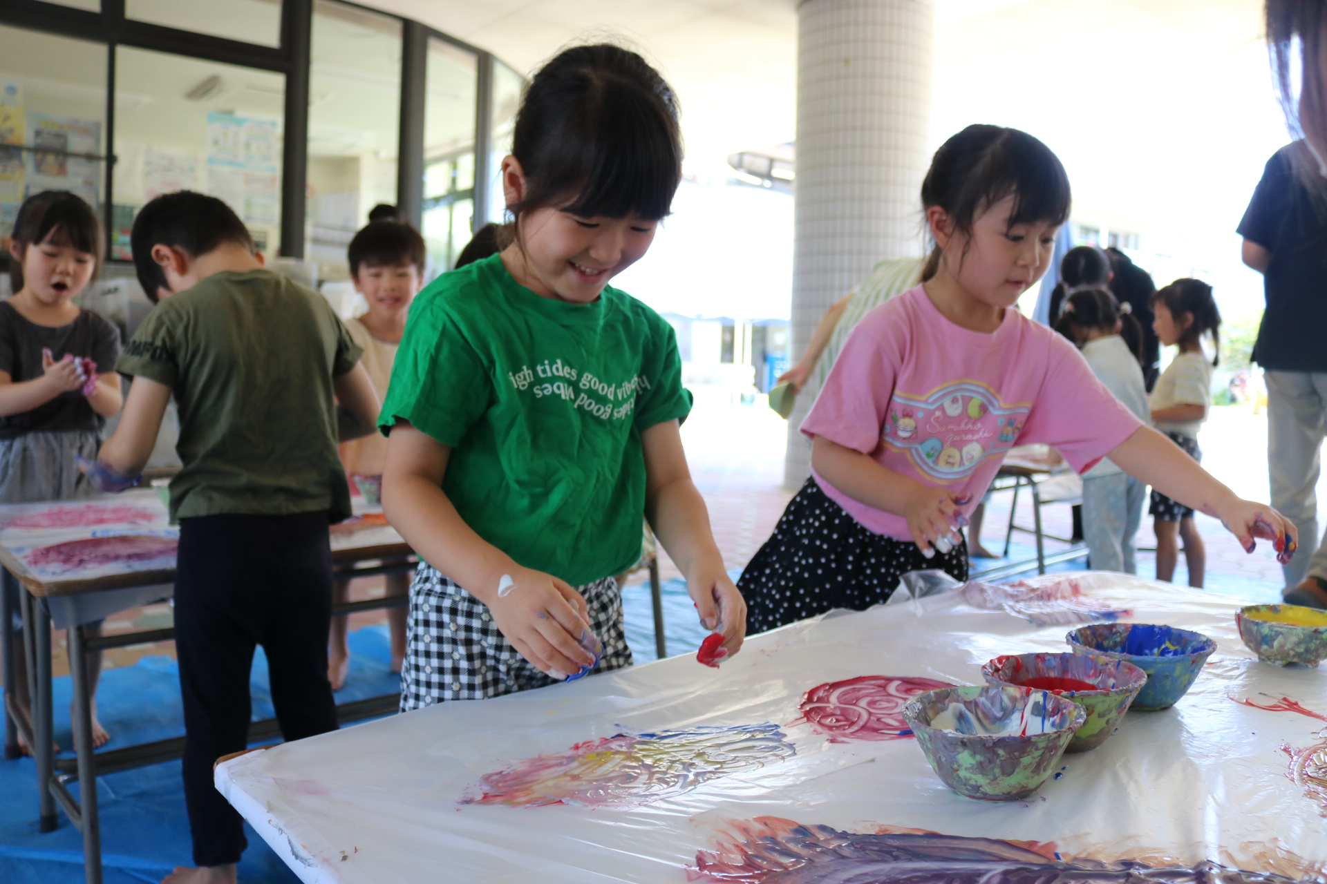 ダイナミックに感触を楽しんでフィンガーをする子どもたち。色の混ぜ方も上手でした😊