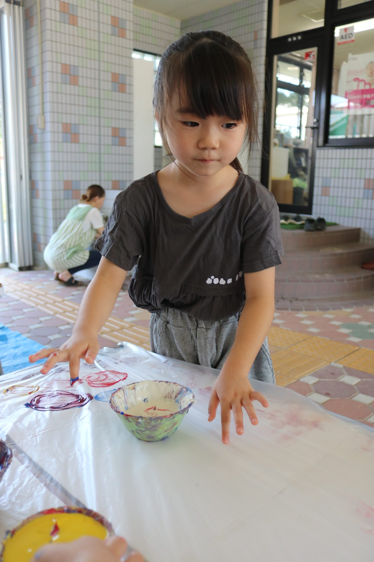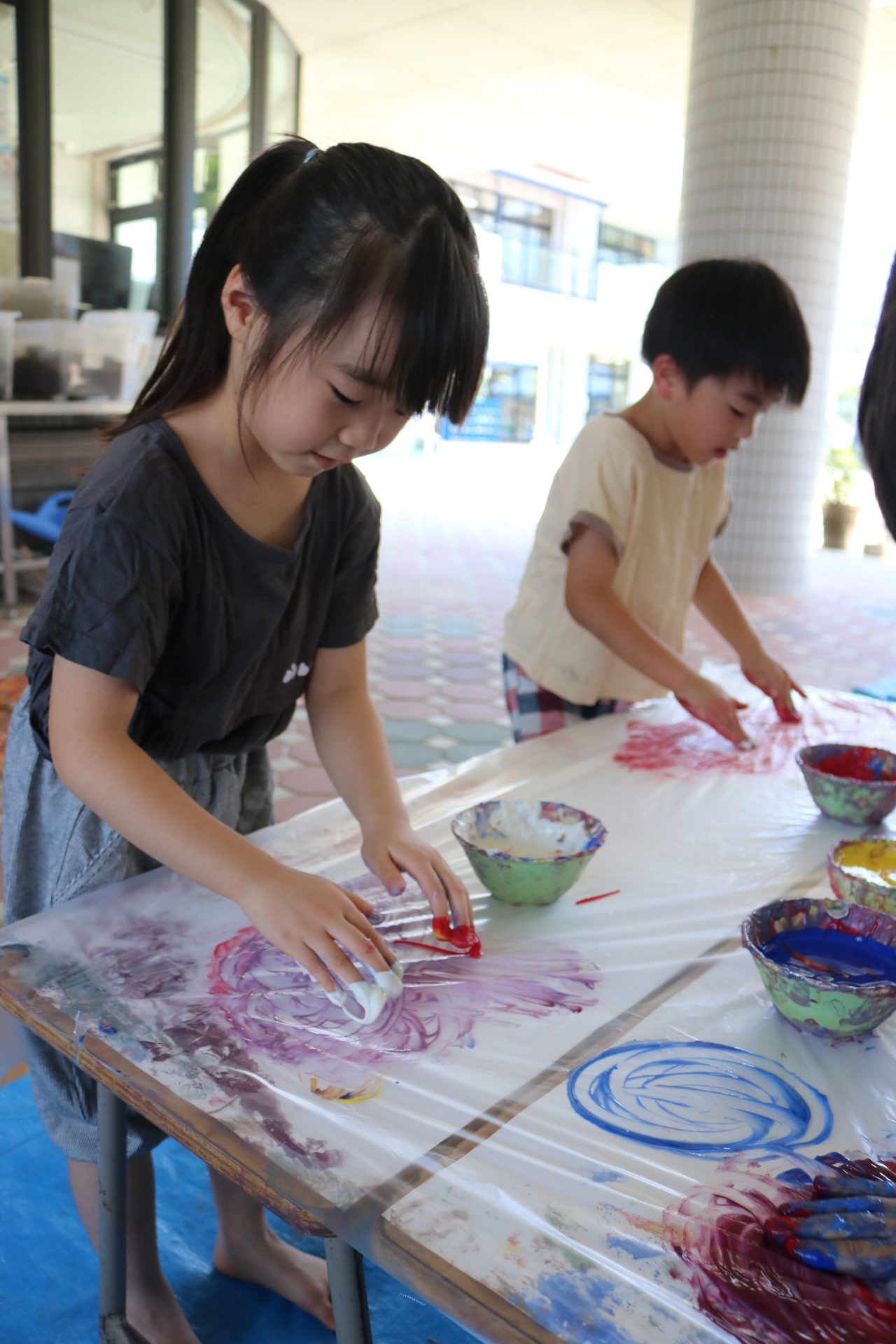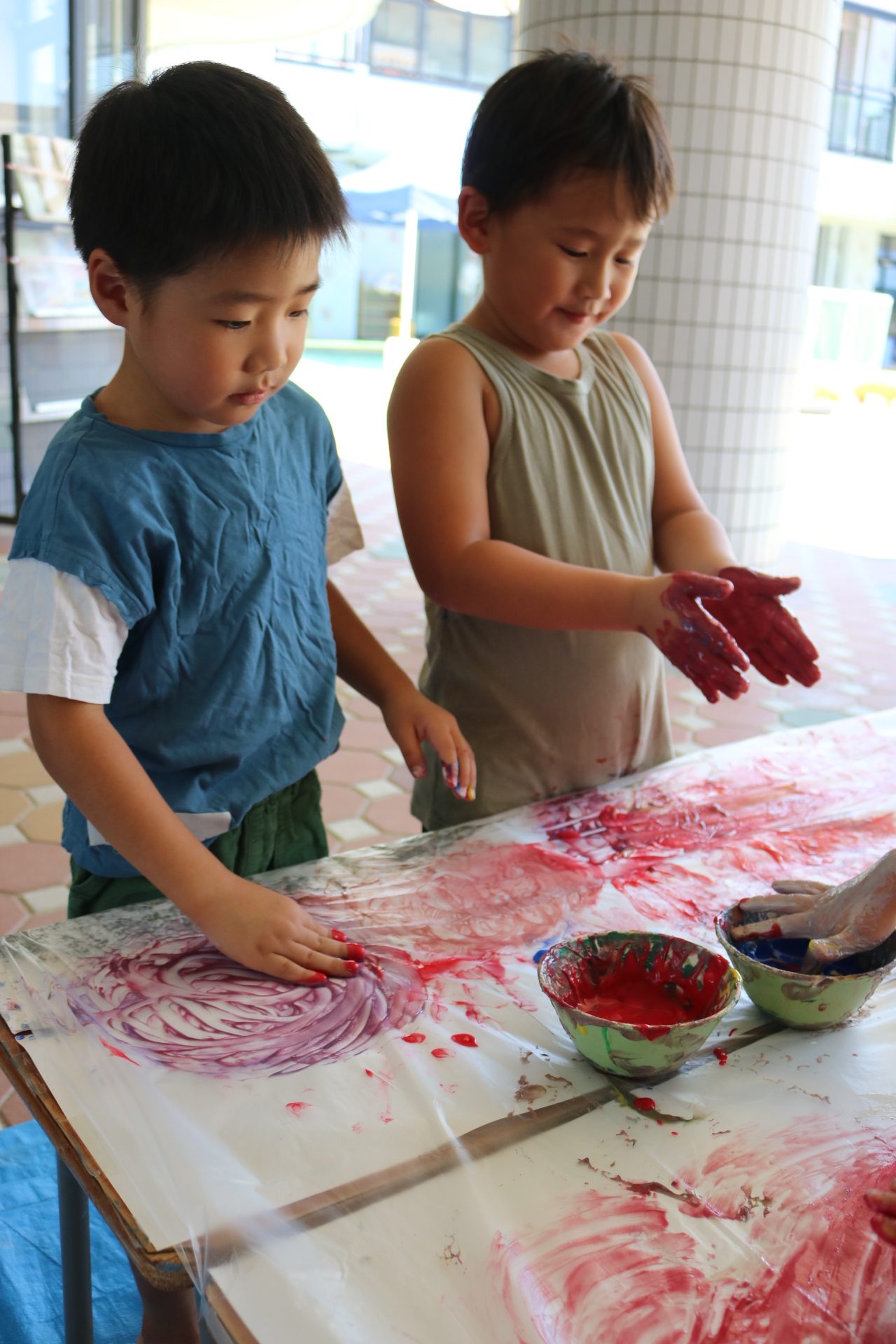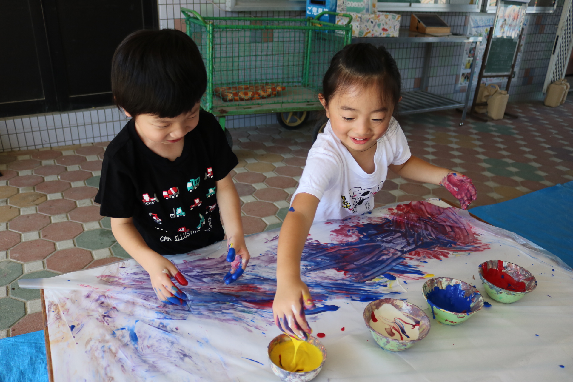 ダイナミックに感触を楽しんでフィンガーをする子どもたち。色の混ぜ方も上手でした😊