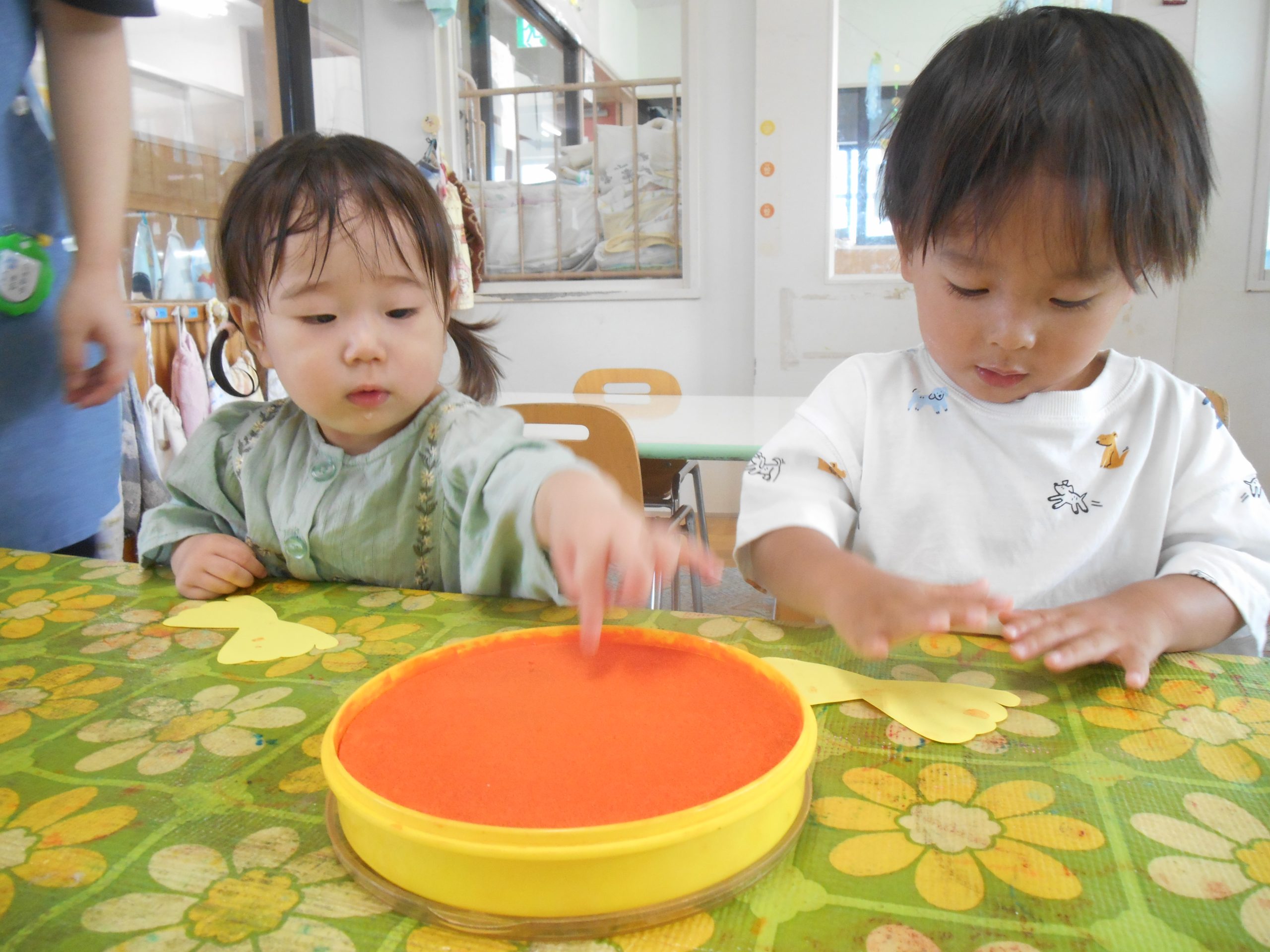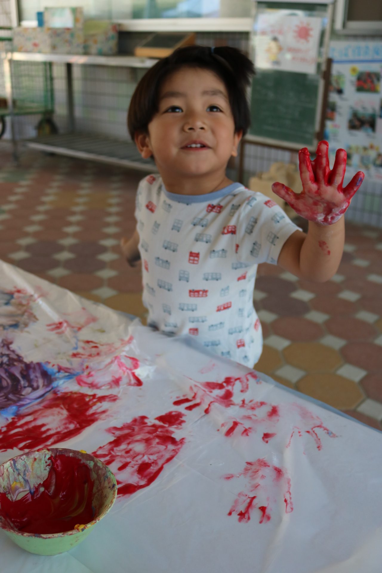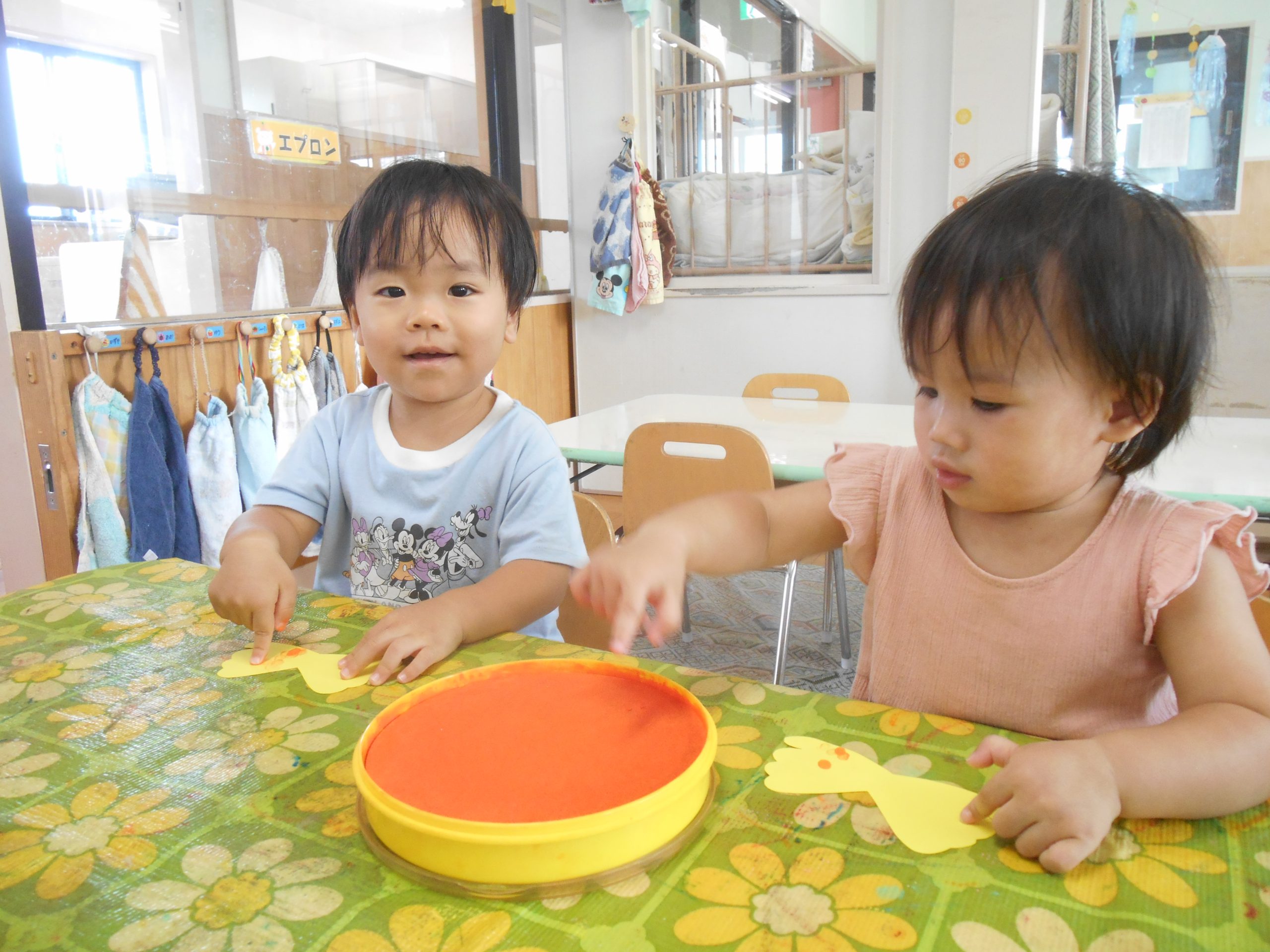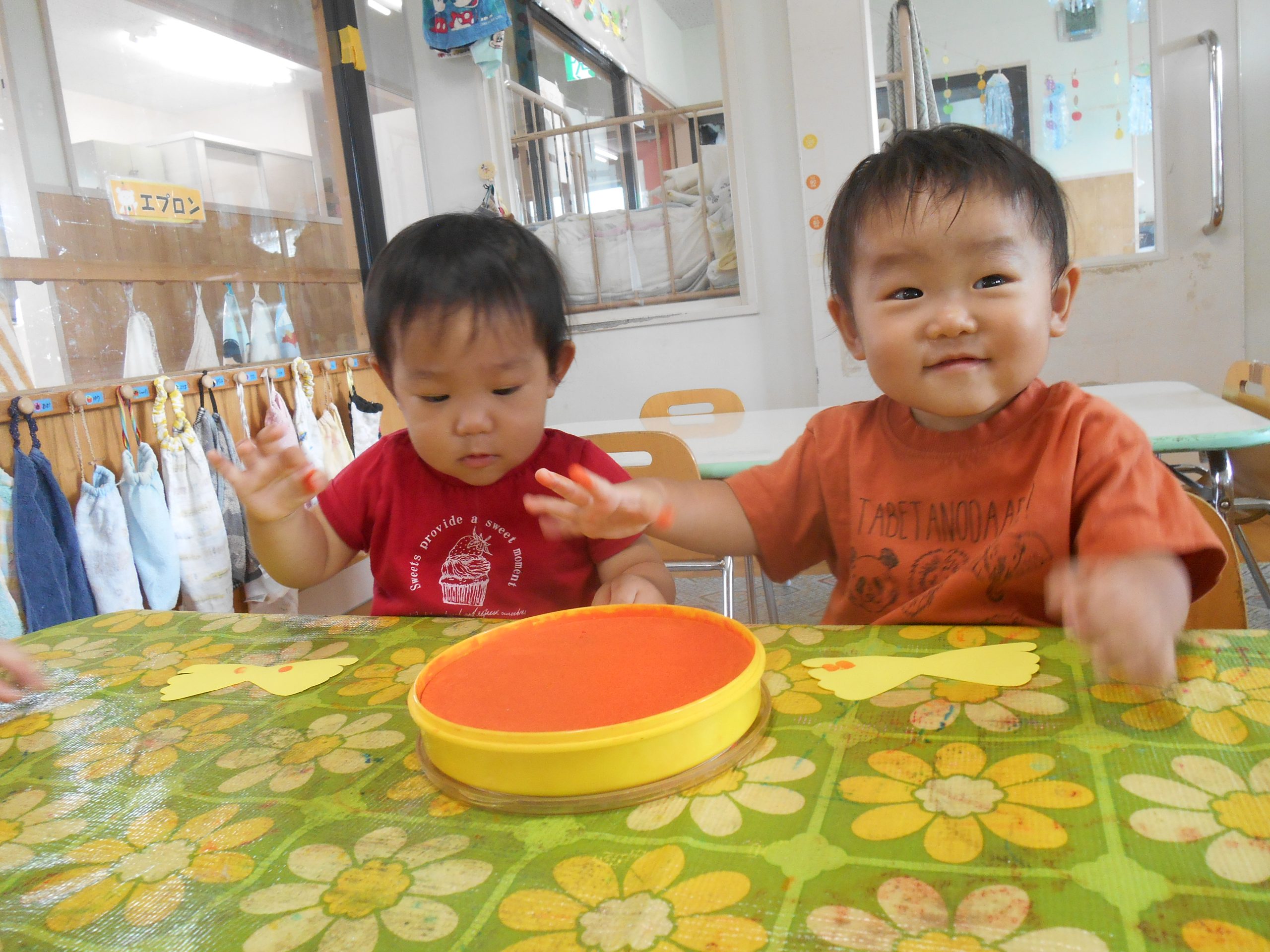 2歳児クラスのお友だちが、フィンガーペイントを楽しみましたよ😊