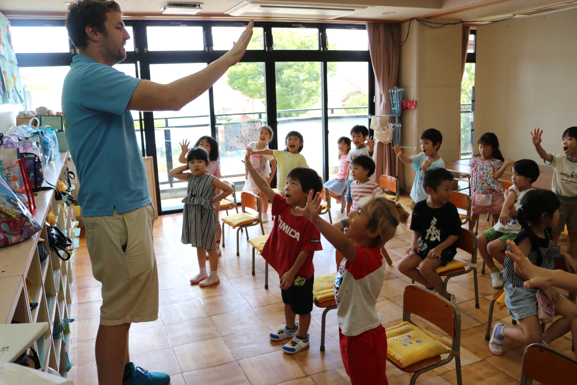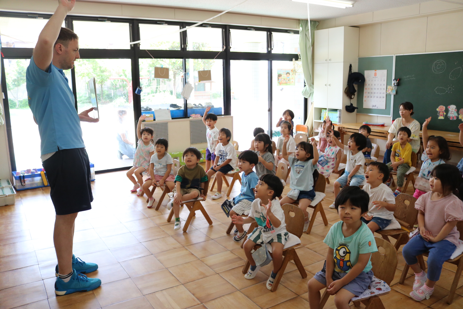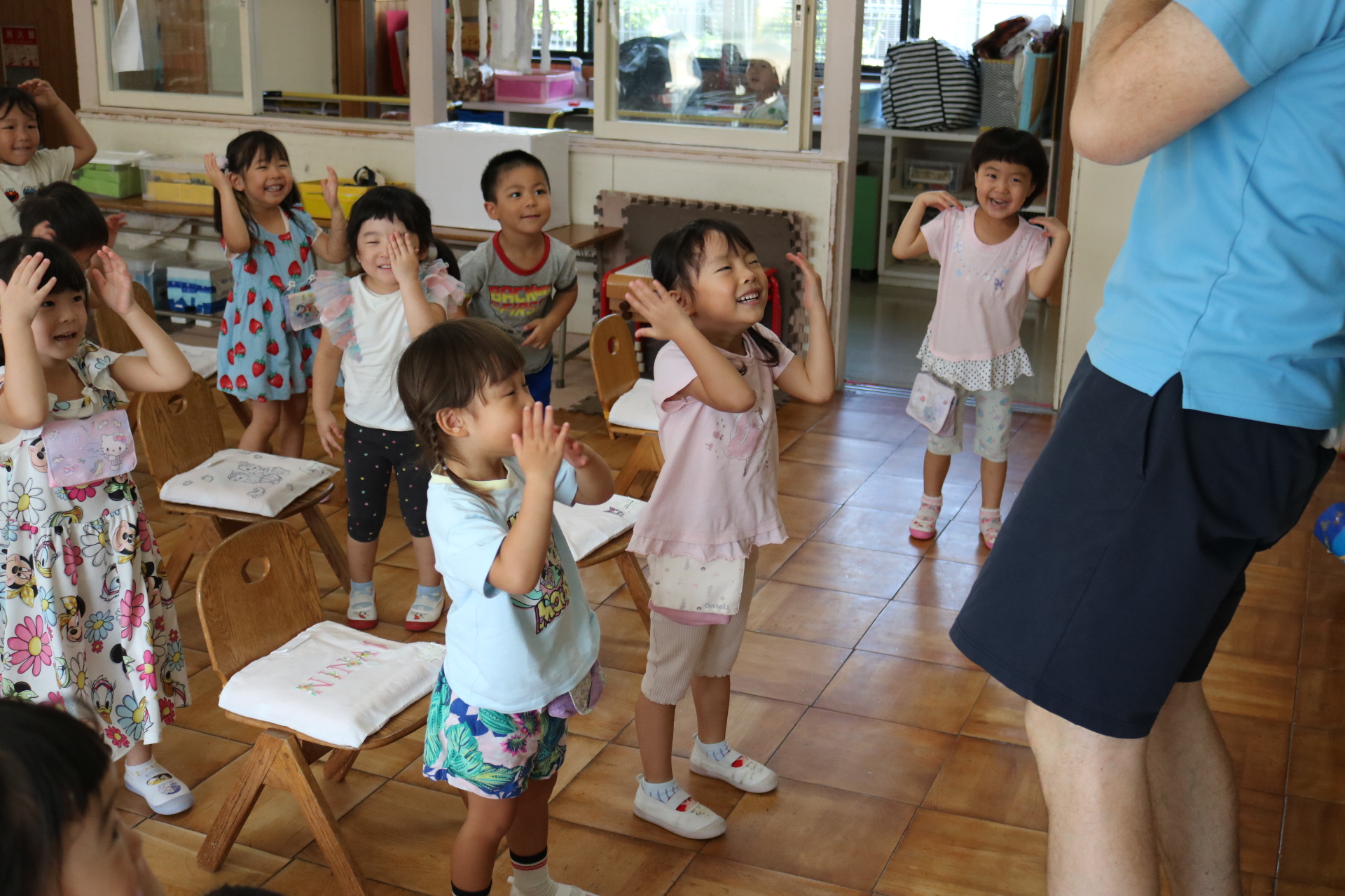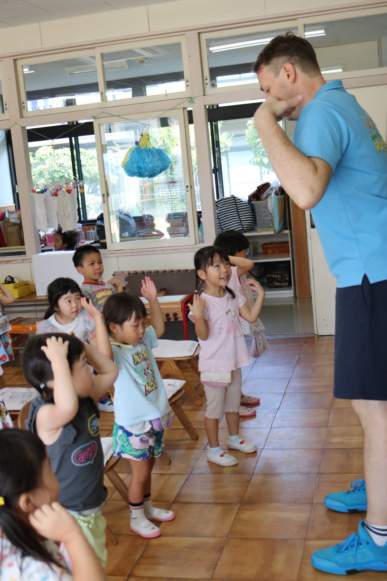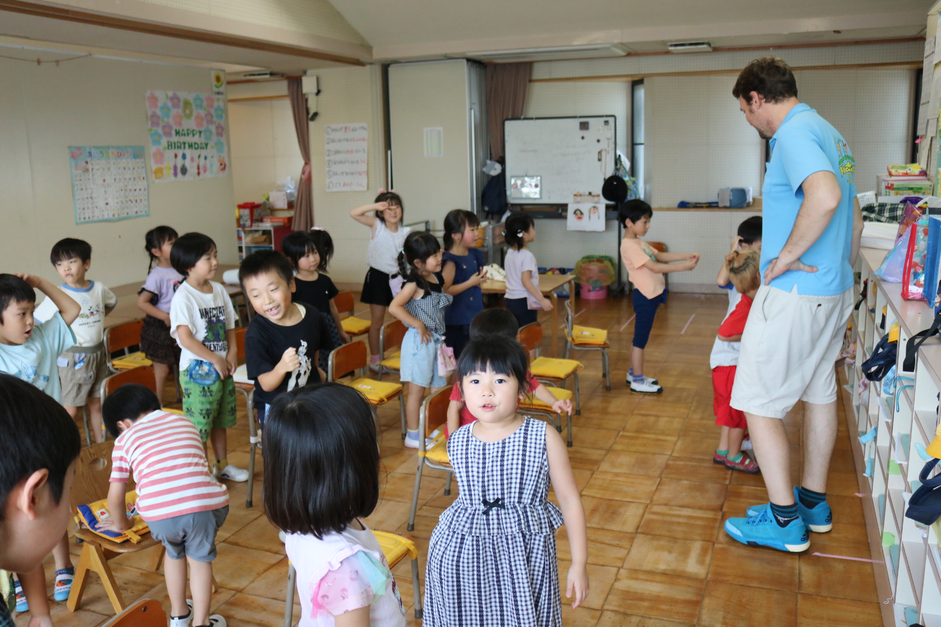 クリス先生と曲に合わせて踊ったり、英語を発音したり・・・