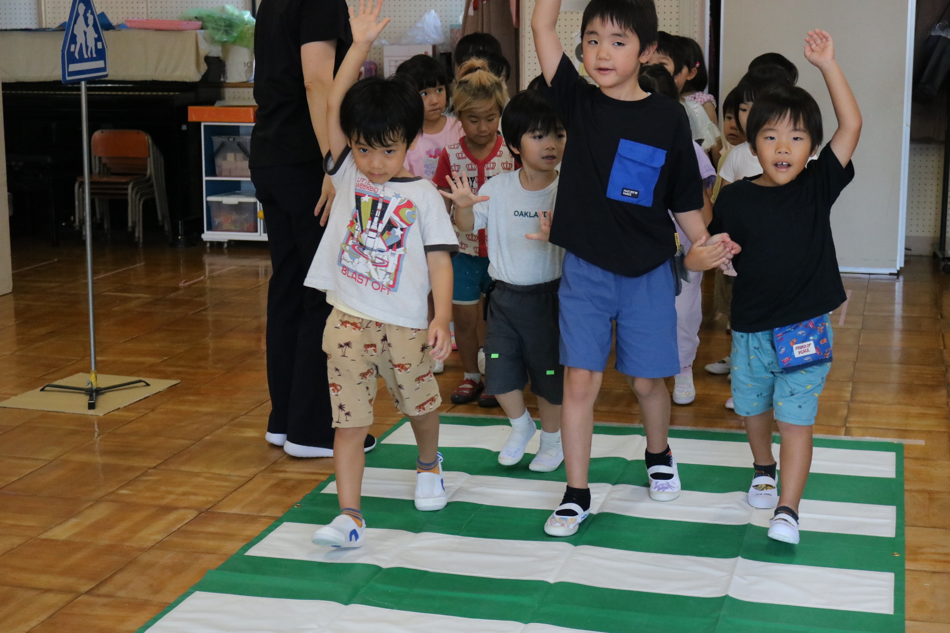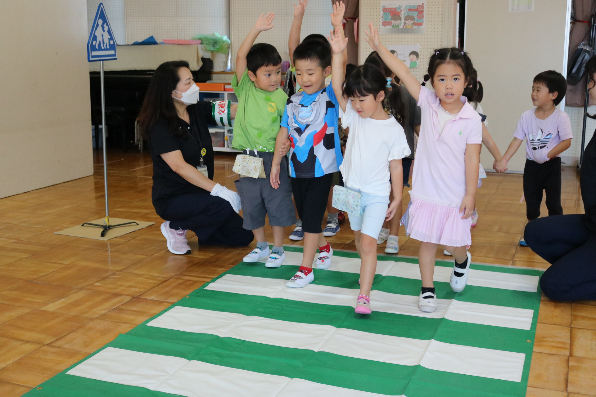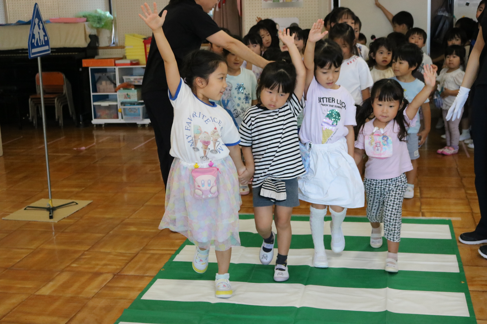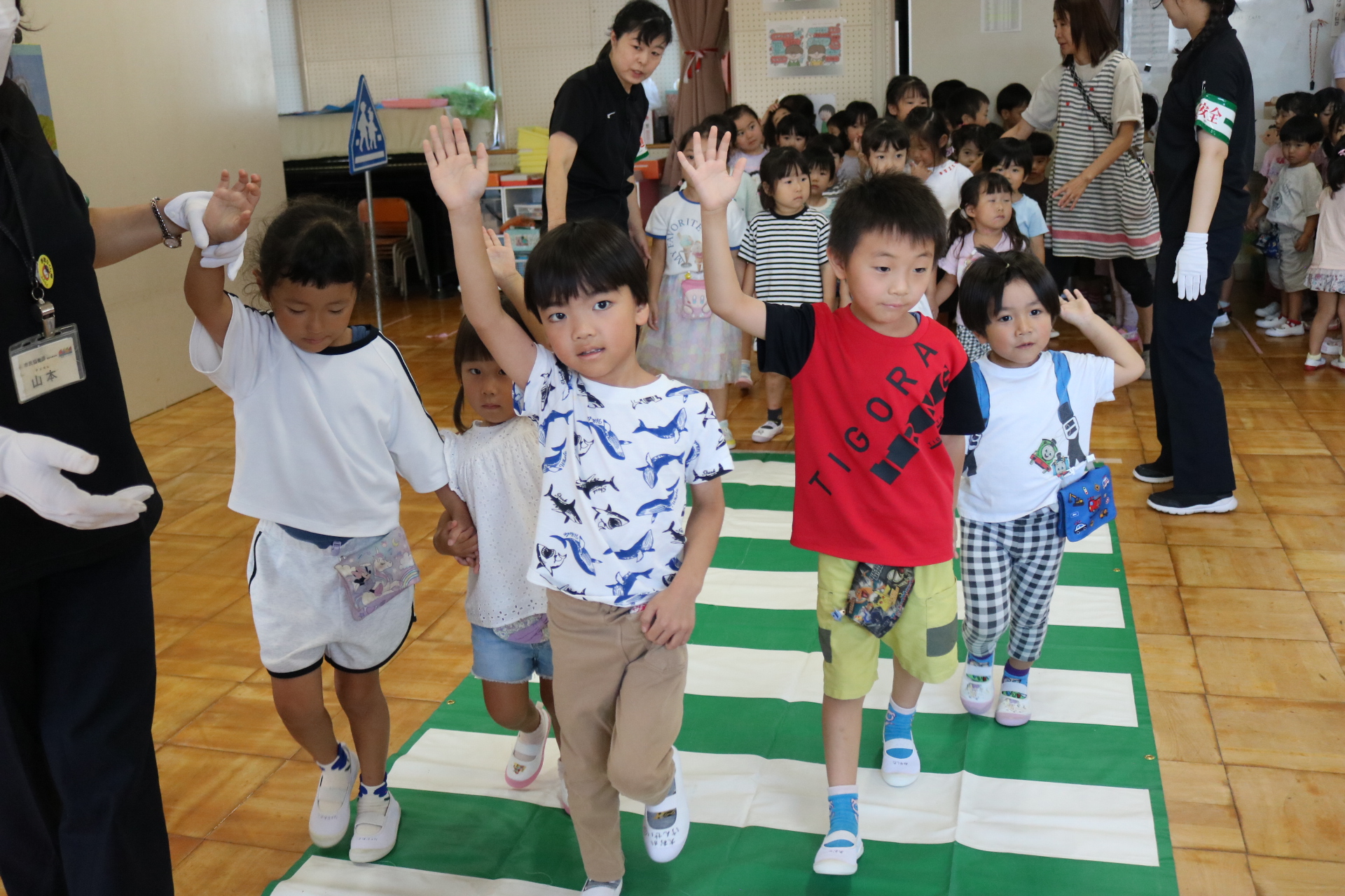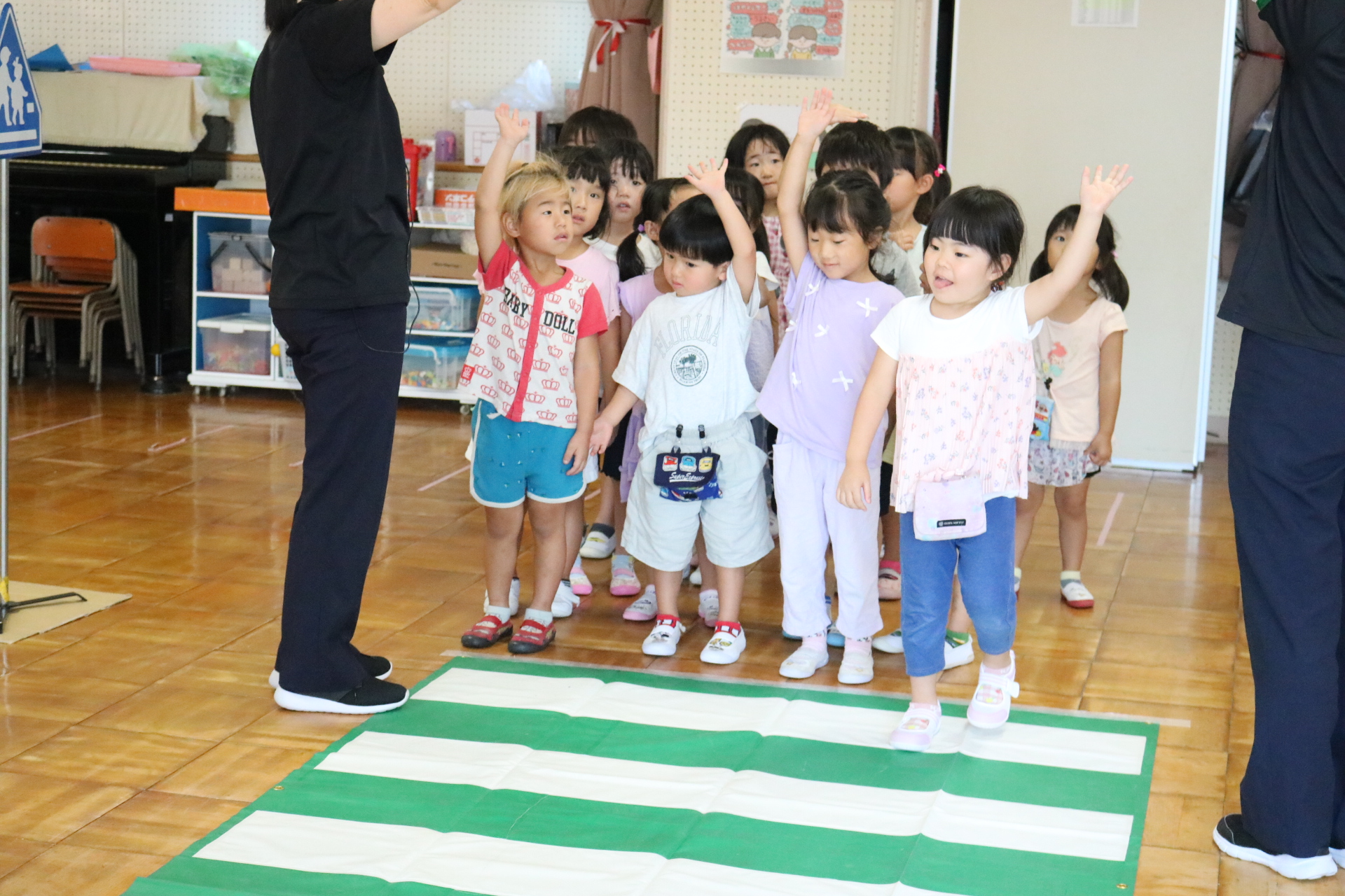 交通安全教室で交通ルールについての話を聞きました。横断歩道を歩く模擬練習もしましたよ😊