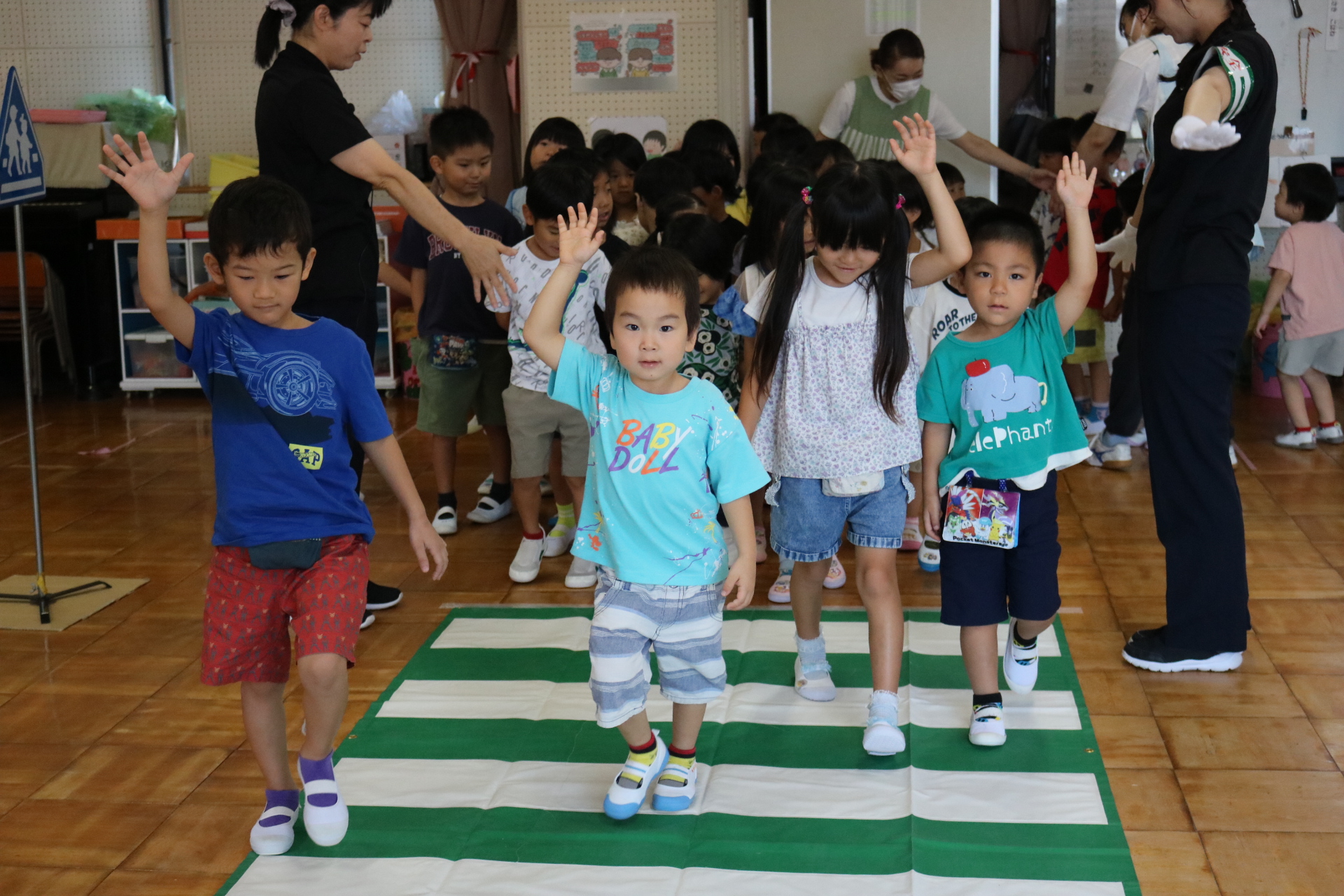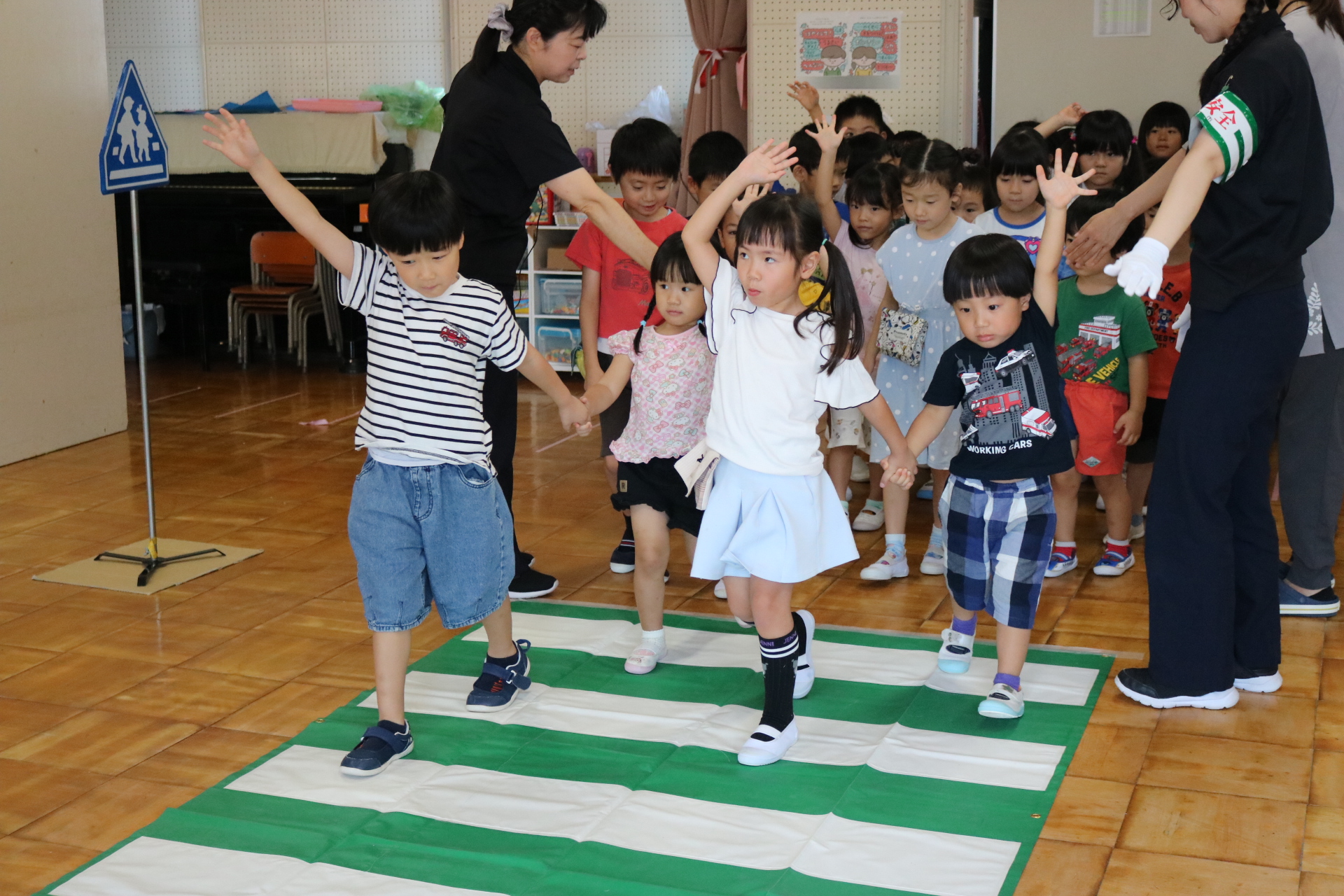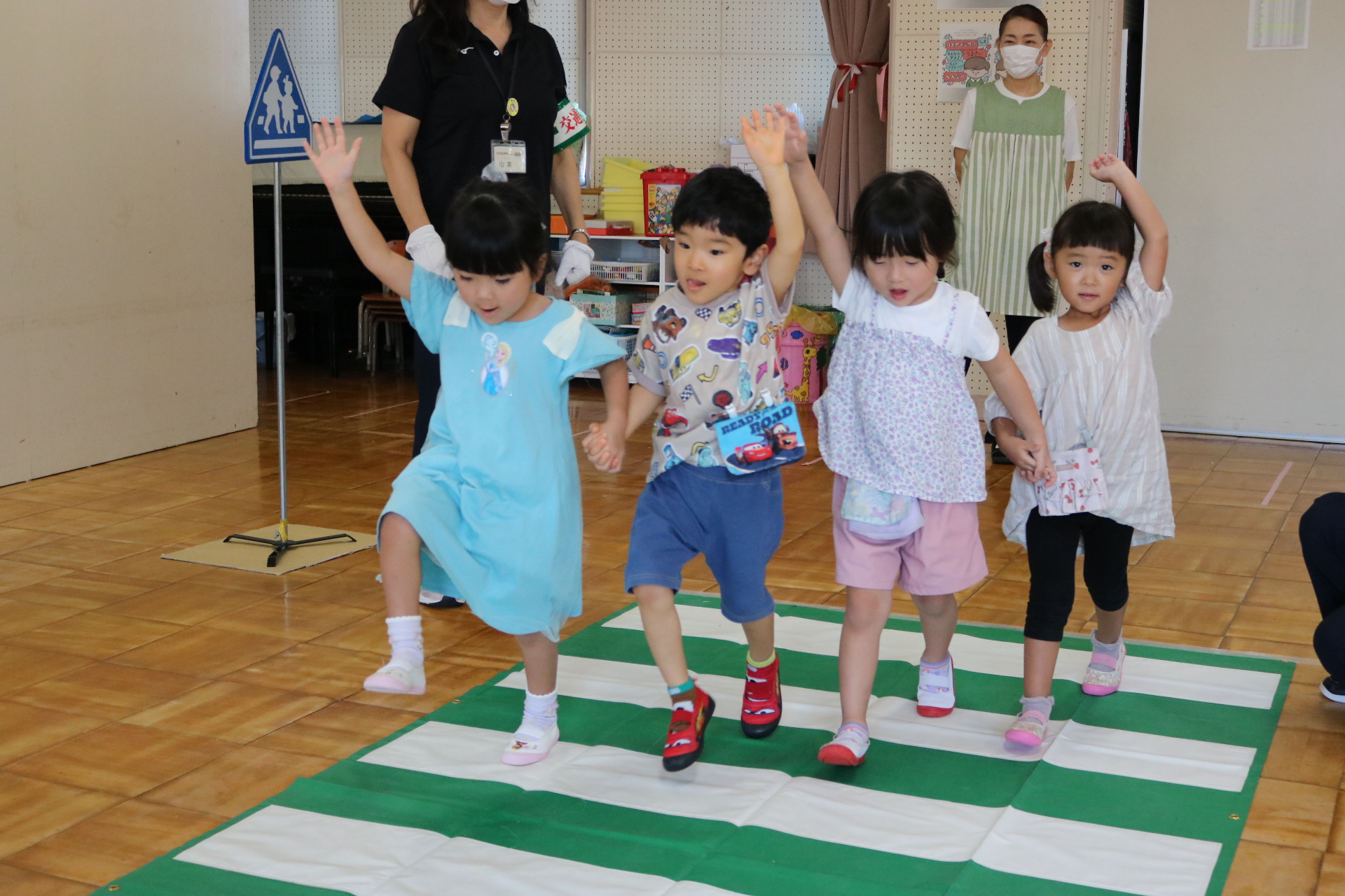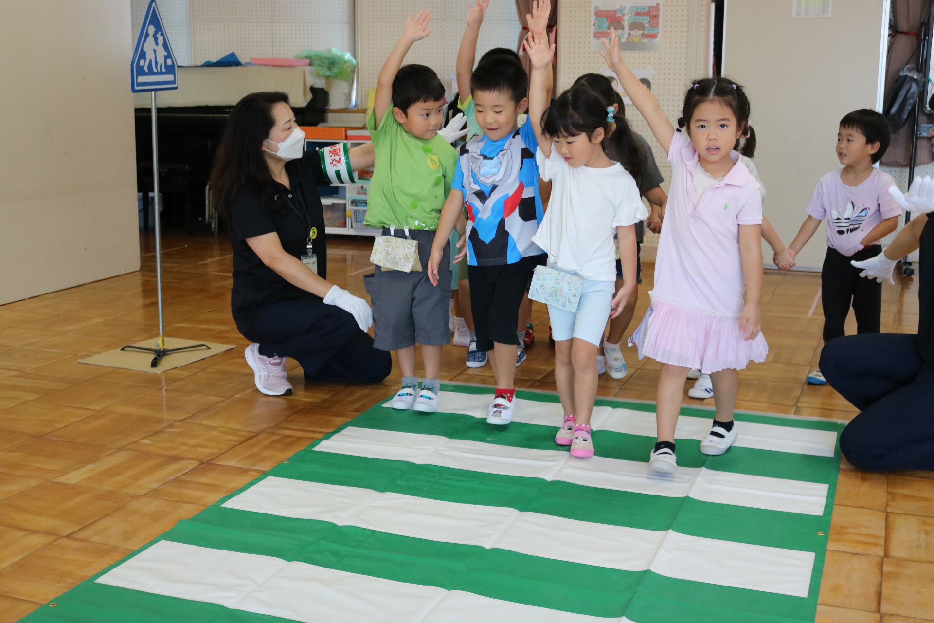 交通安全教室で交通ルールについての話を聞きました。横断歩道を歩く模擬練習もしましたよ😊