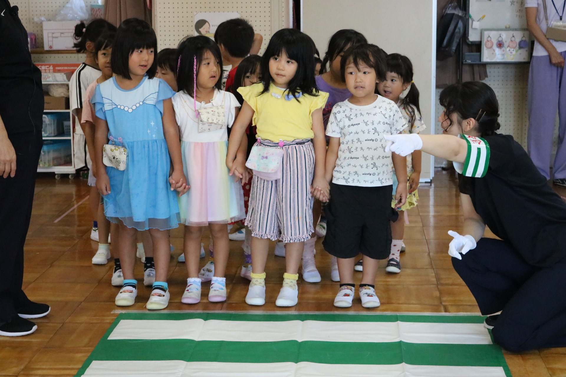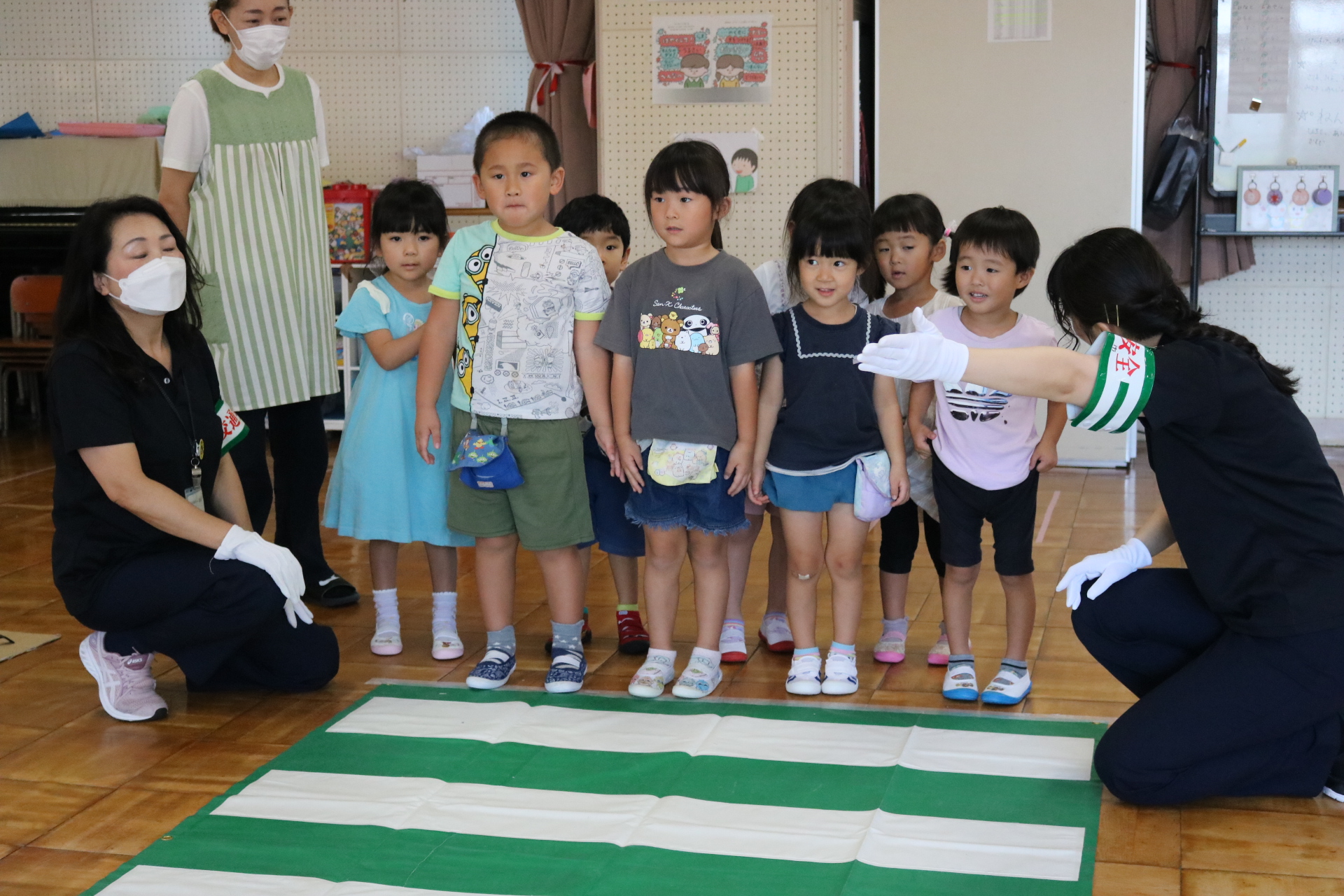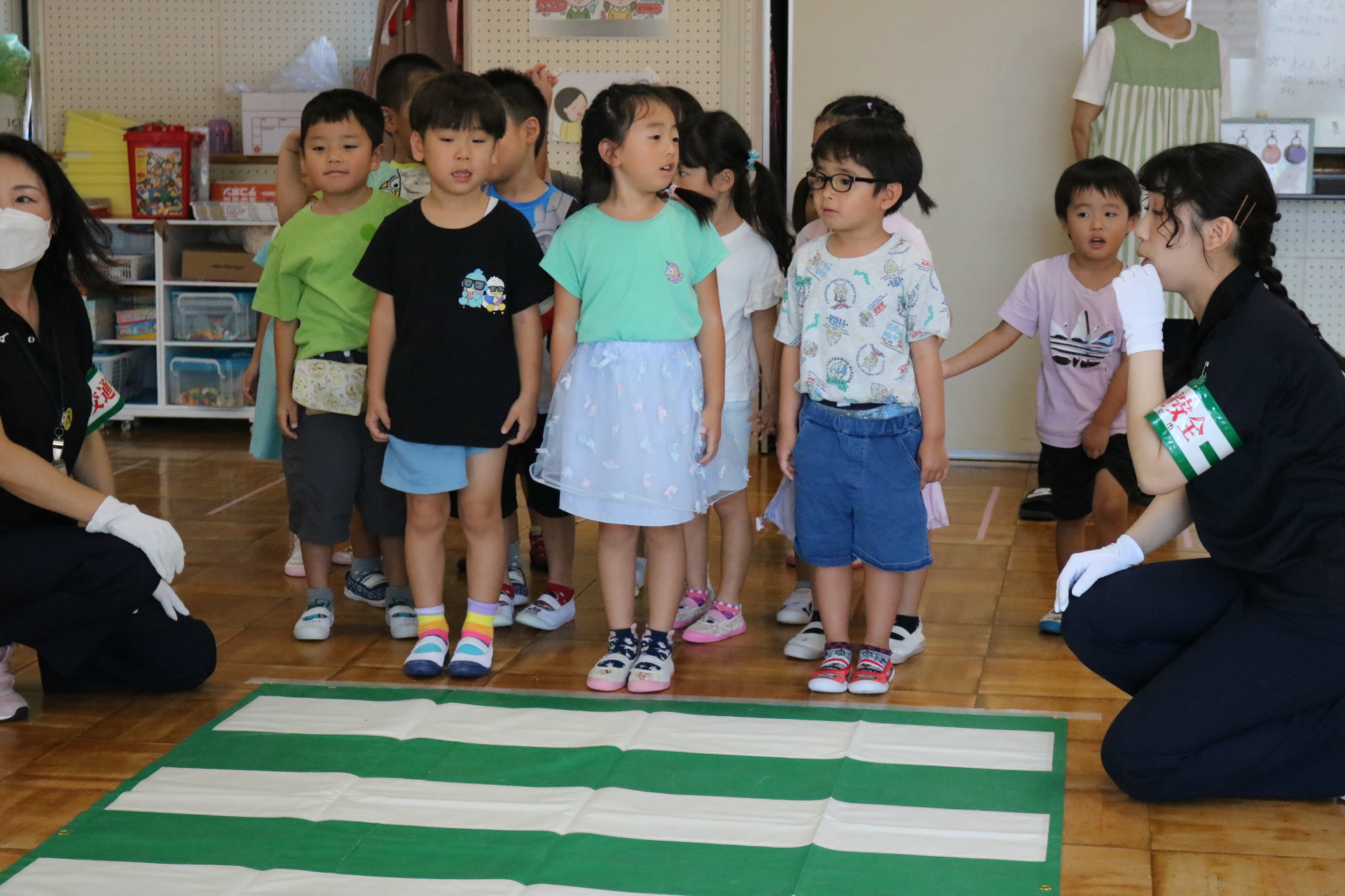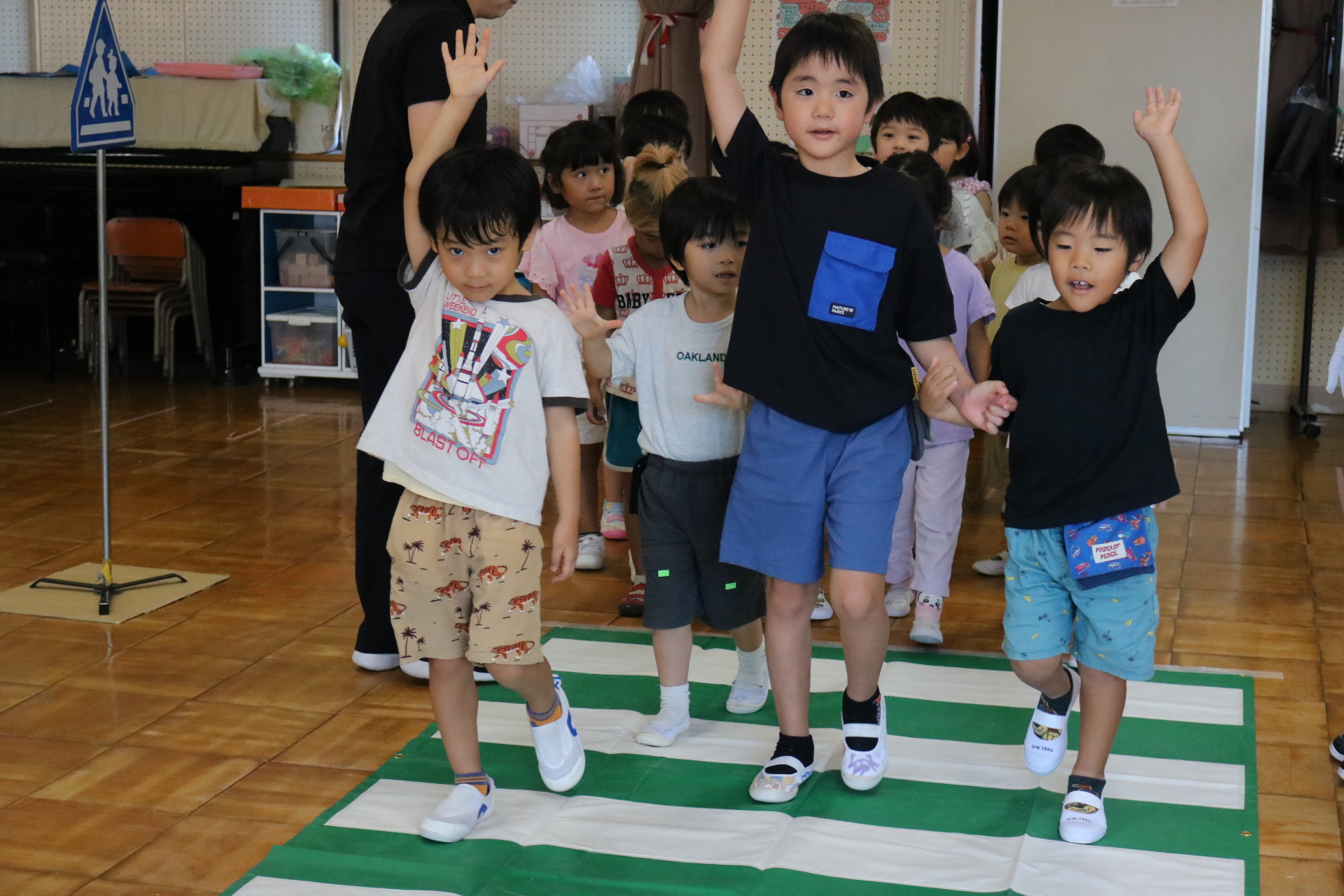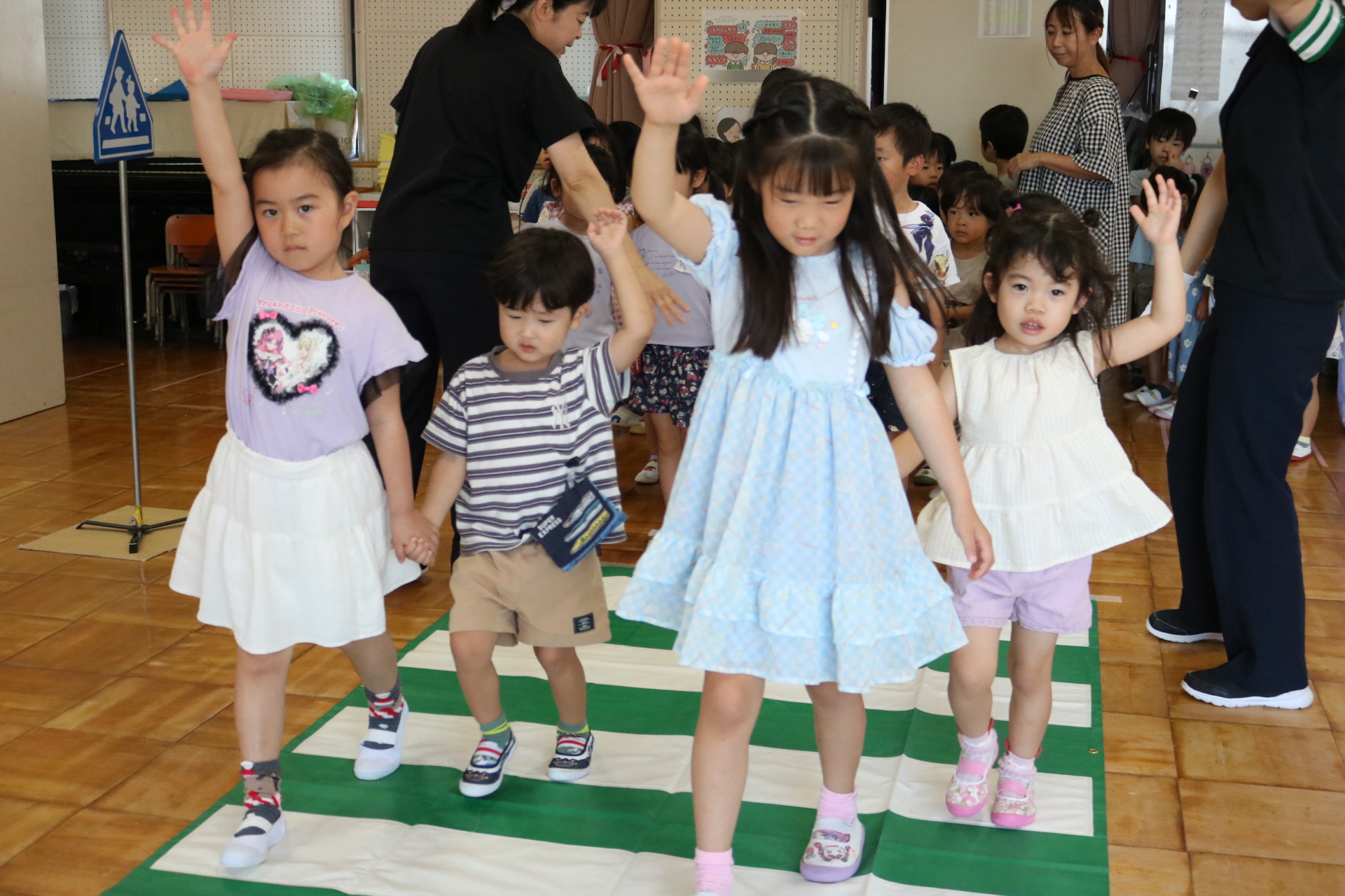 交通安全教室で交通ルールについての話を聞きました。横断歩道を歩く模擬練習もしましたよ😊