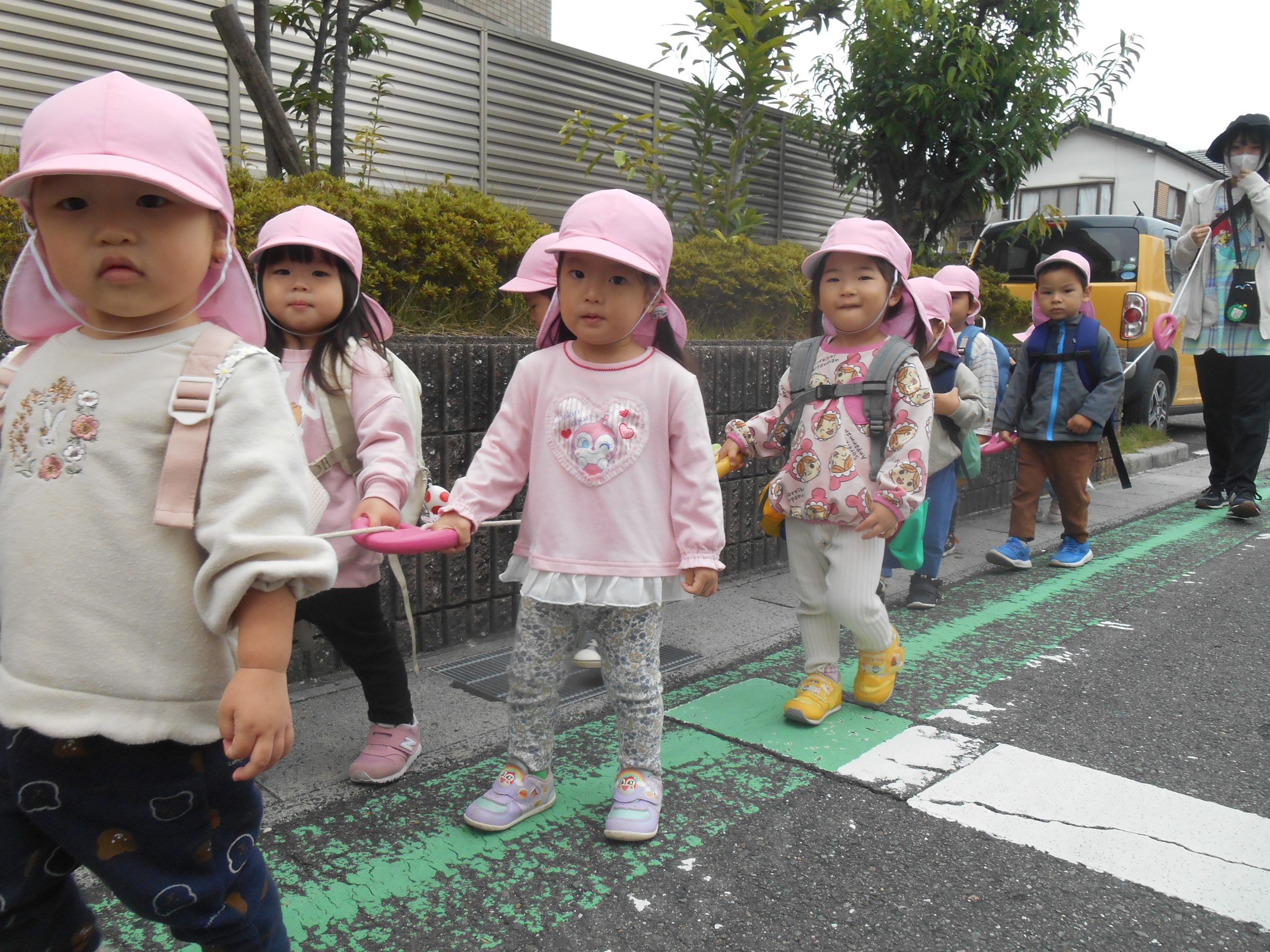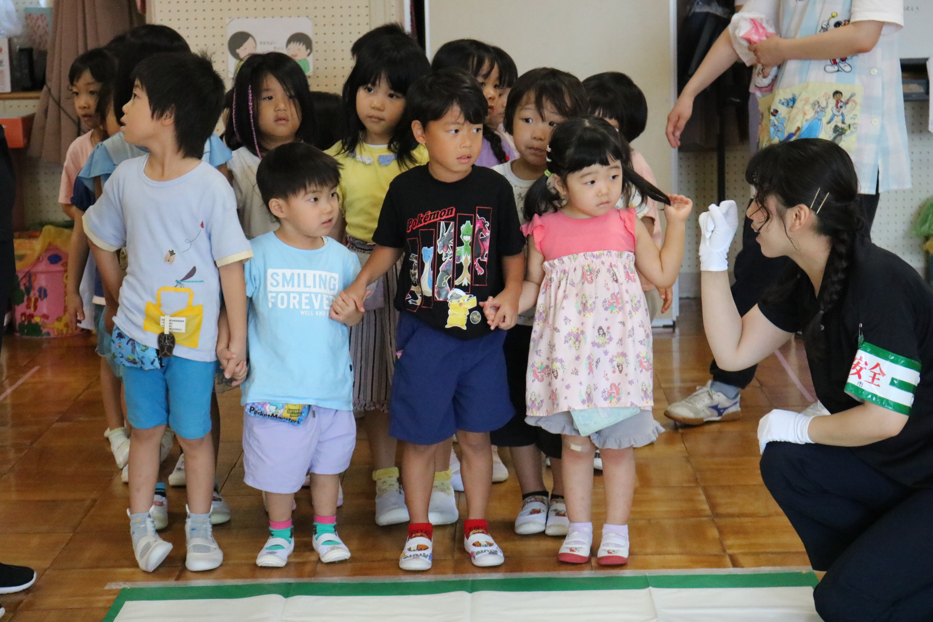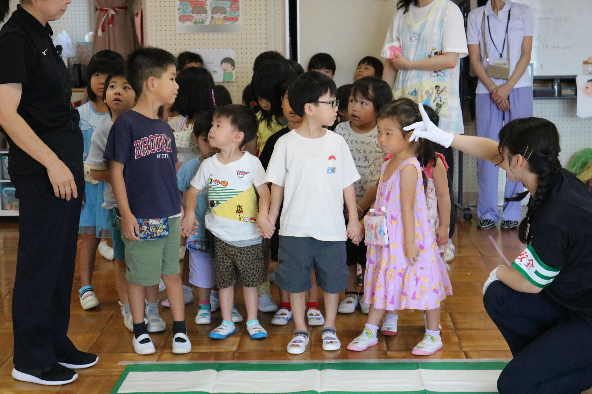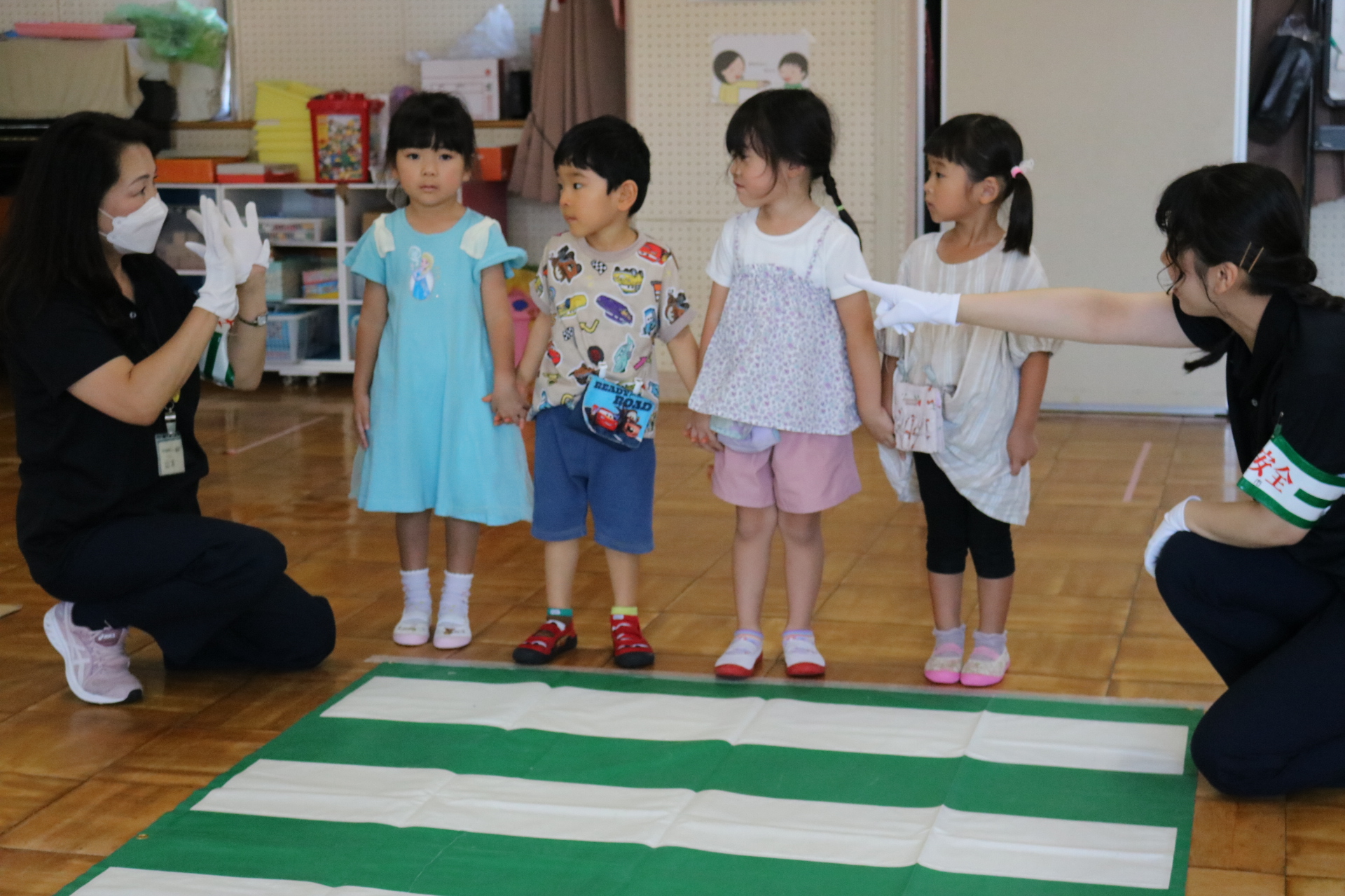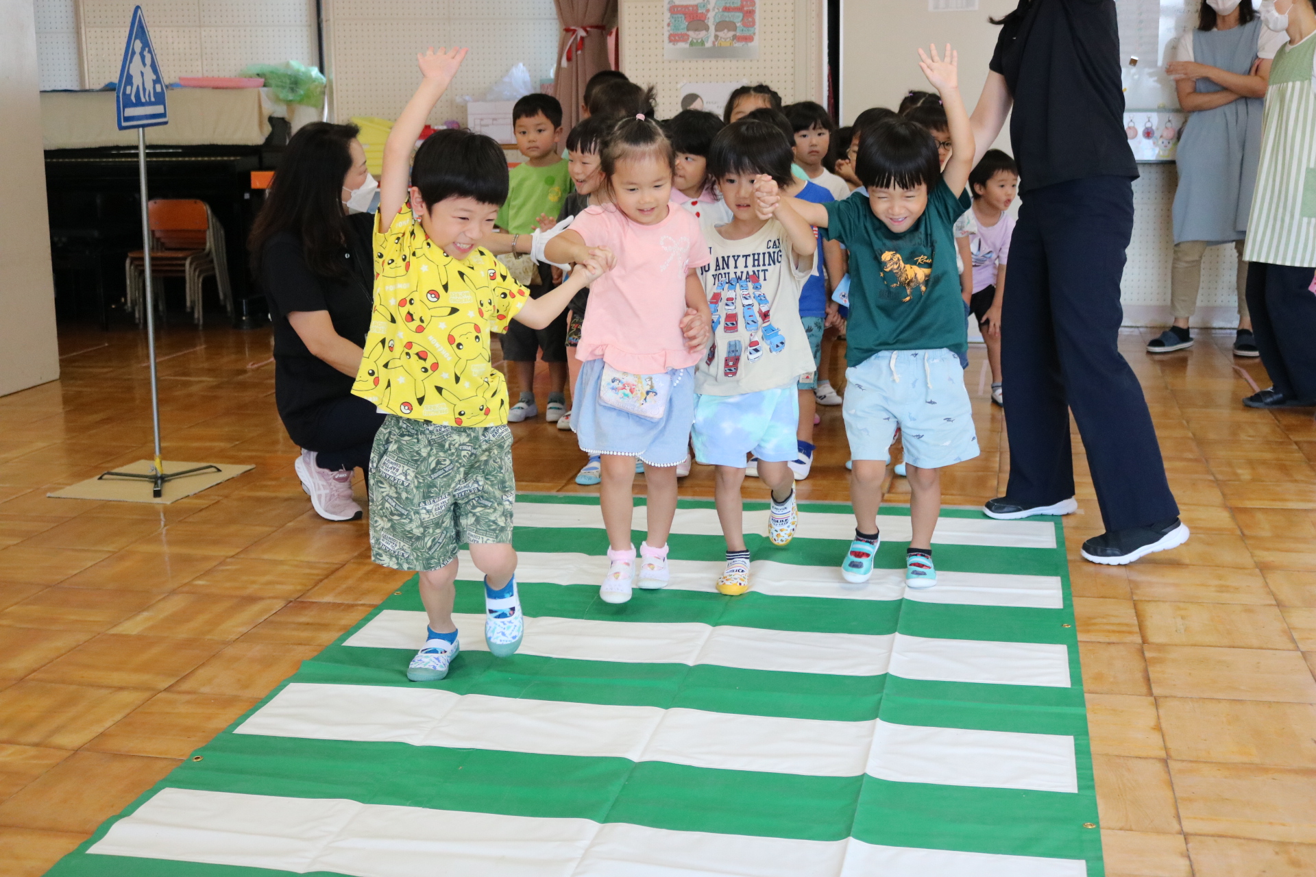 交通安全教室で交通ルールについての話を聞きました。横断歩道を歩く模擬練習もしましたよ😊