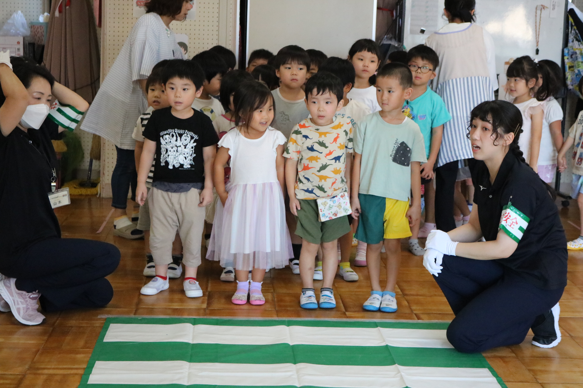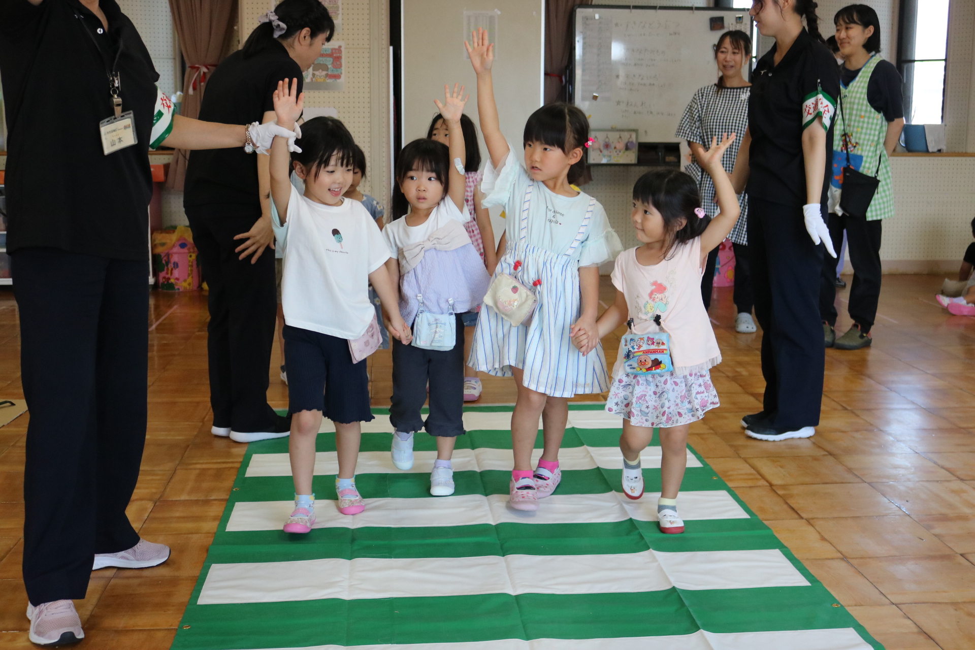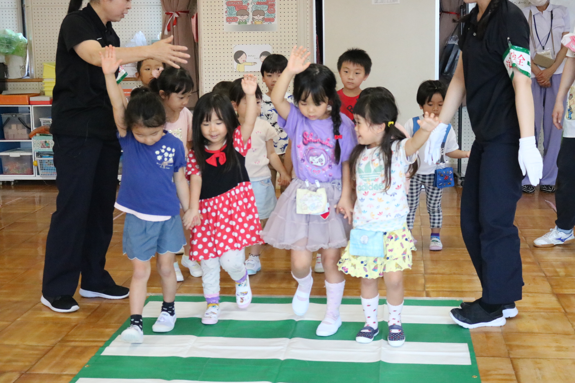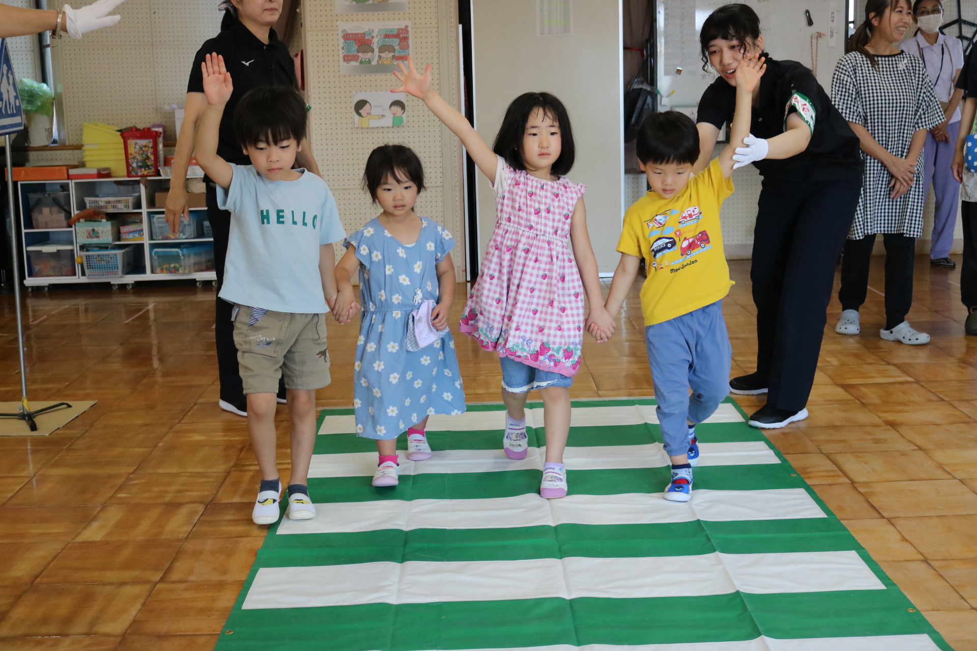 交通安全教室で交通ルールについての話を聞きました。横断歩道を歩く模擬練習もしましたよ😊