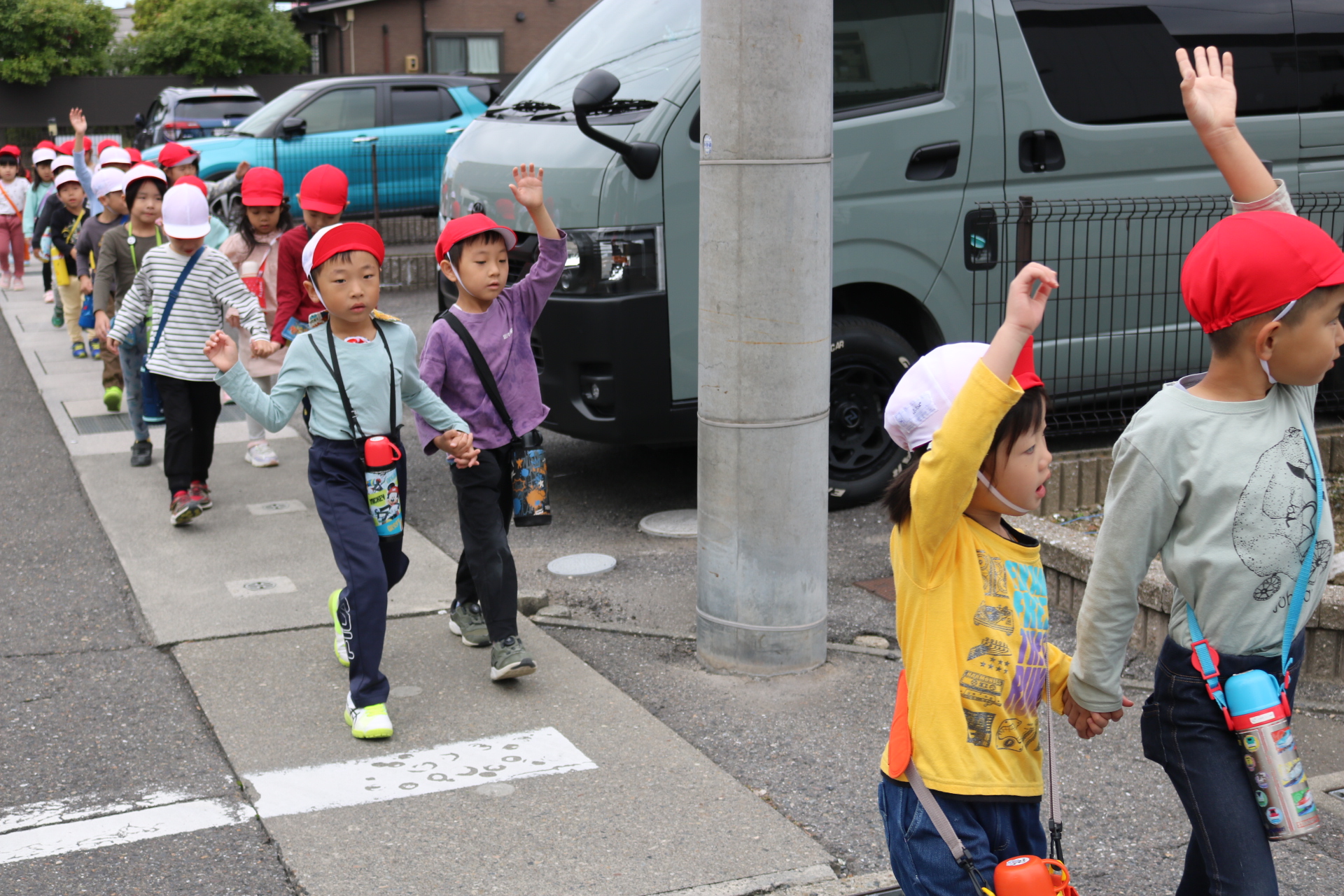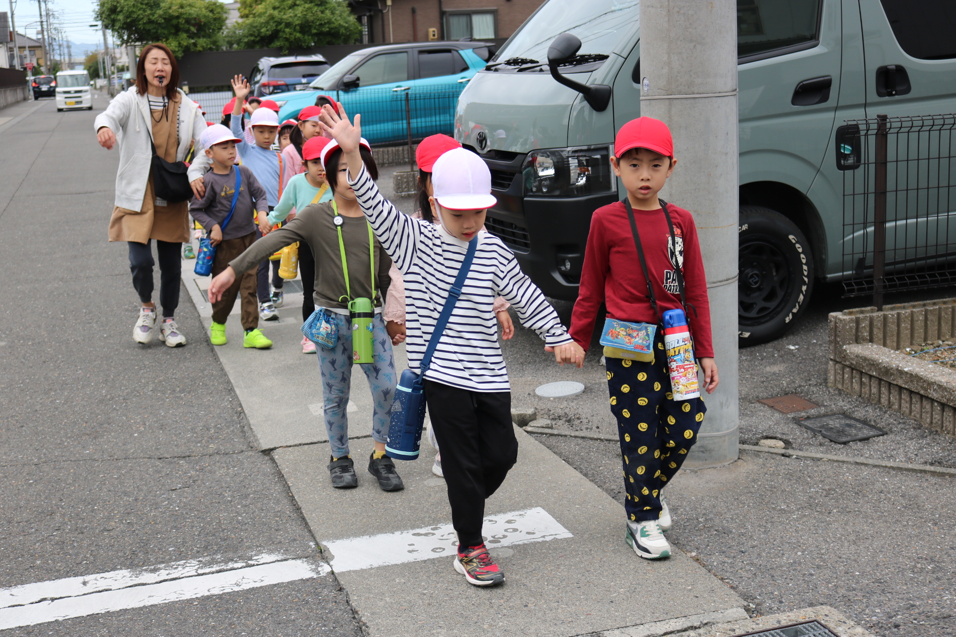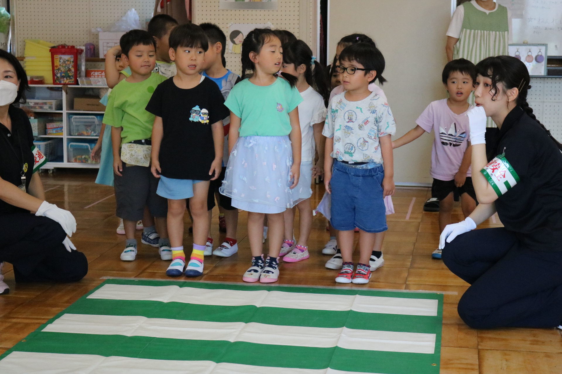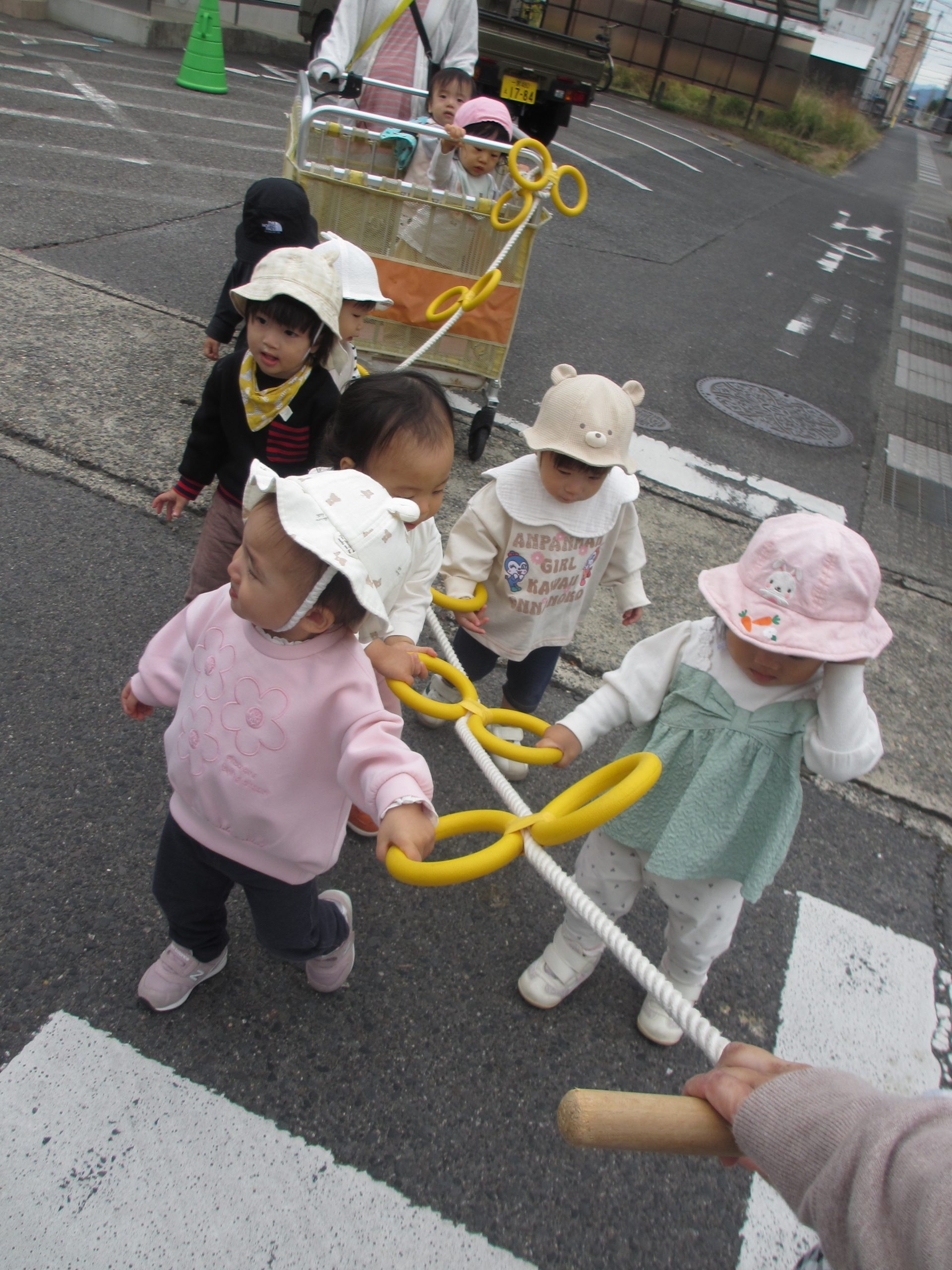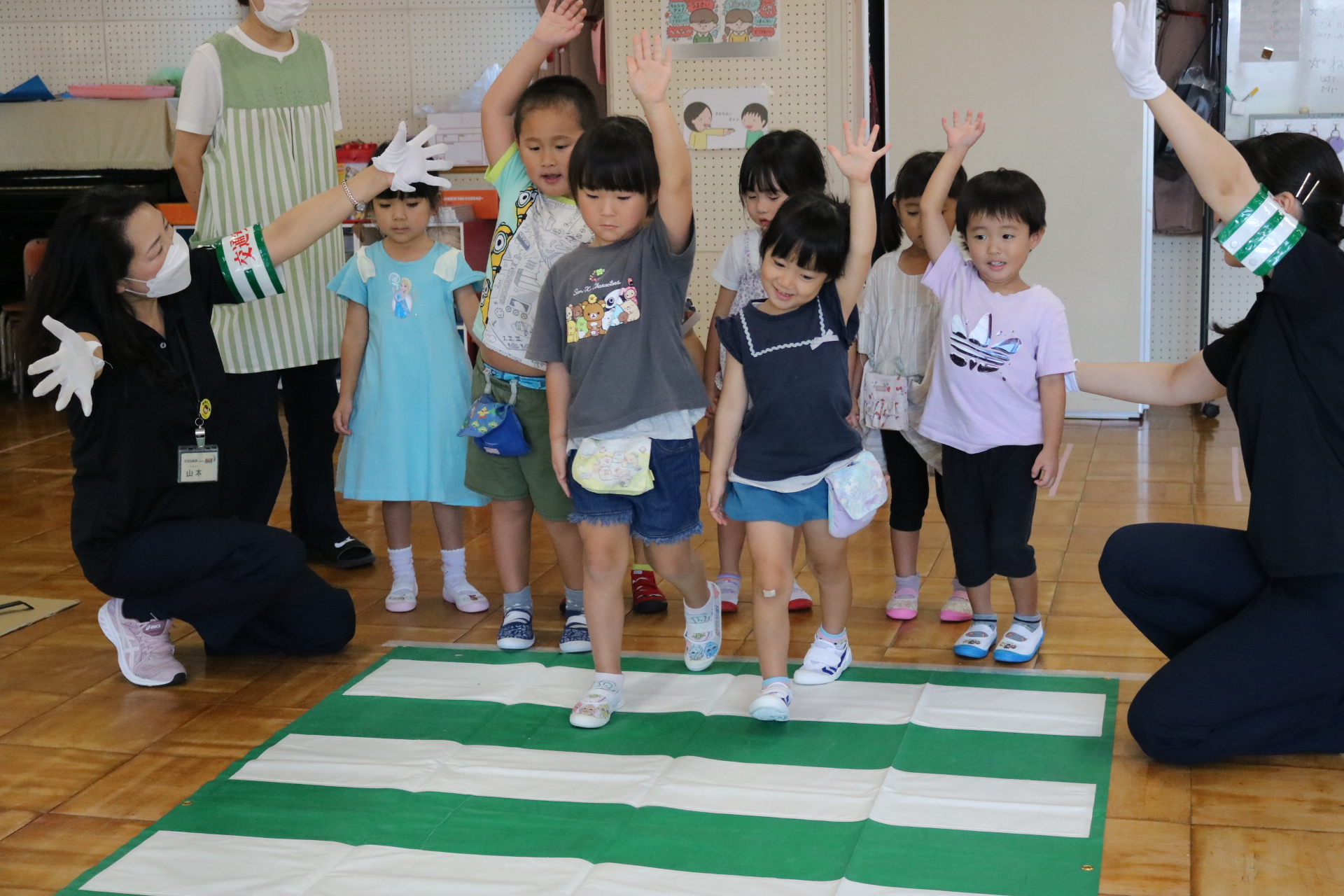 交通安全教室で交通ルールについての話を聞きました。横断歩道を歩く模擬練習もしましたよ😊