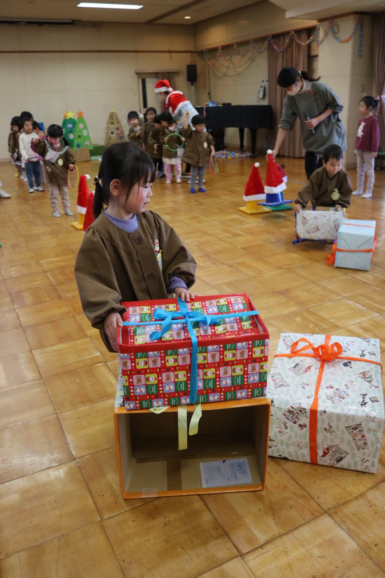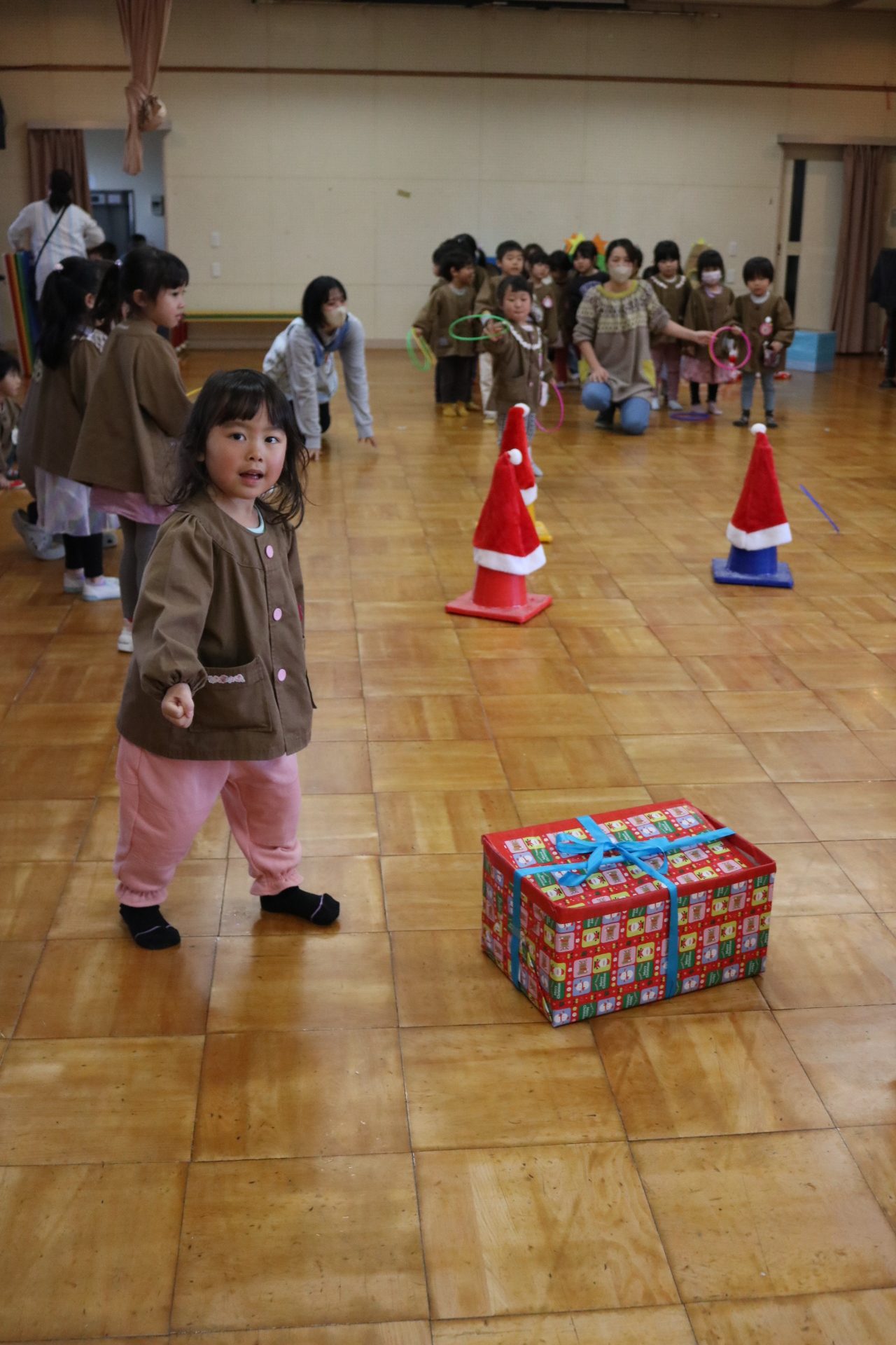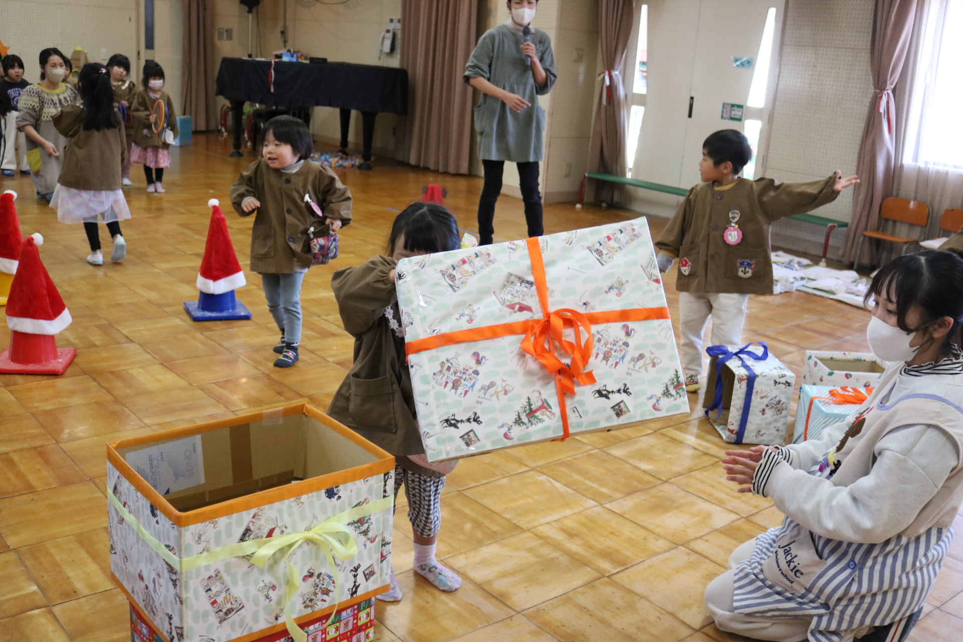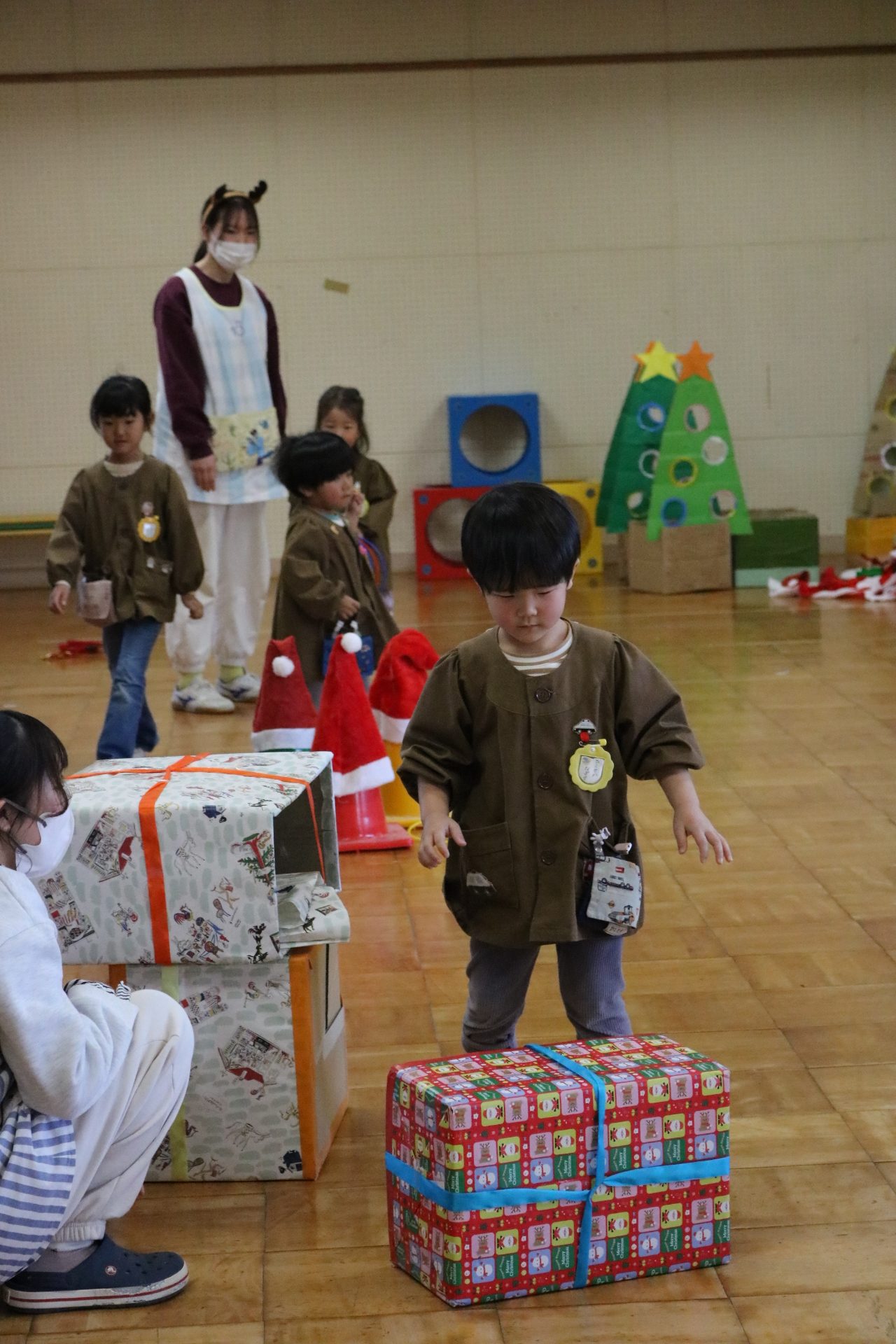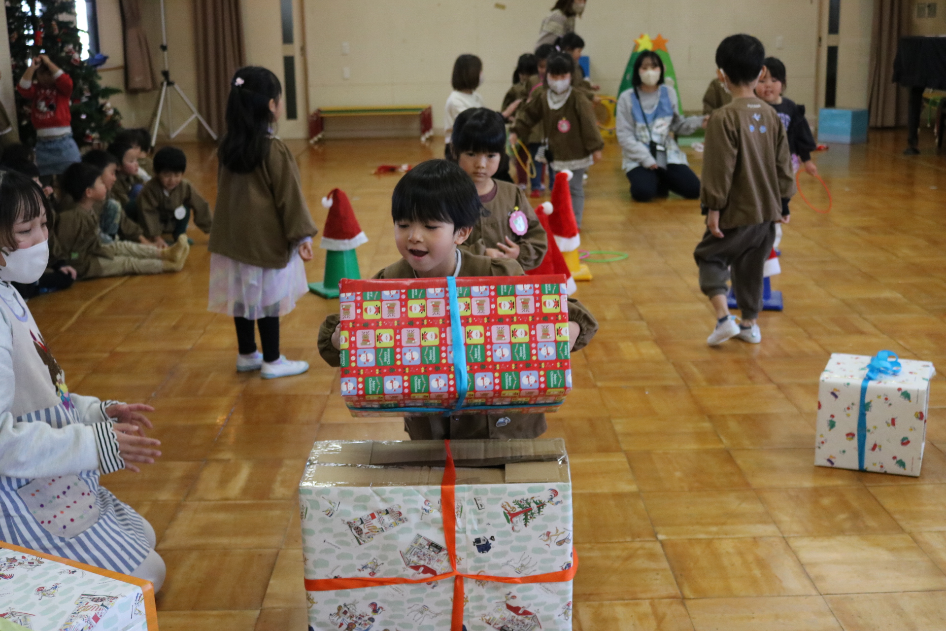 可愛い衣装に可愛い踊り🎵サンタさんからプレゼントももらえて喜ぶ子どもたちでした😊