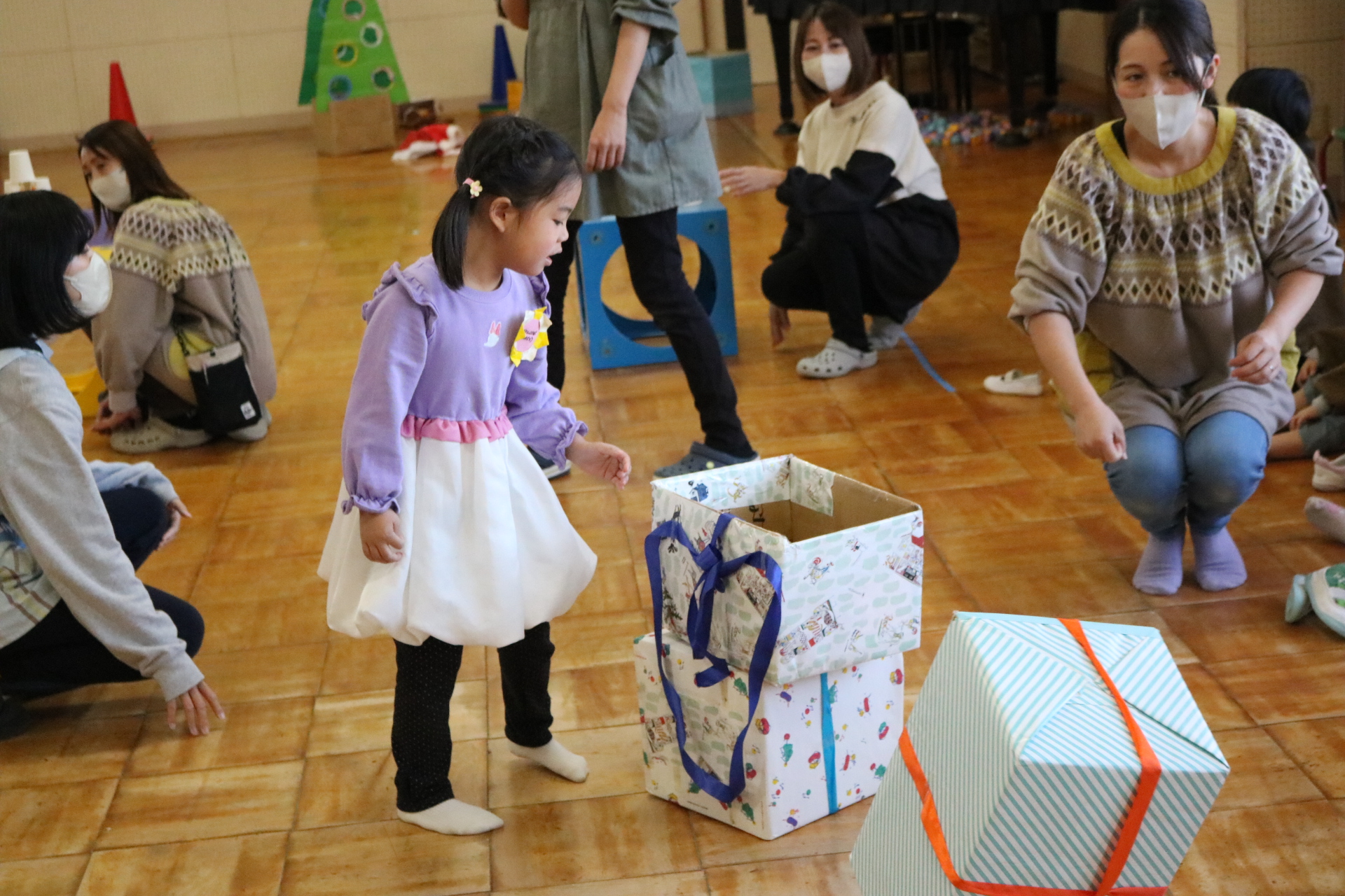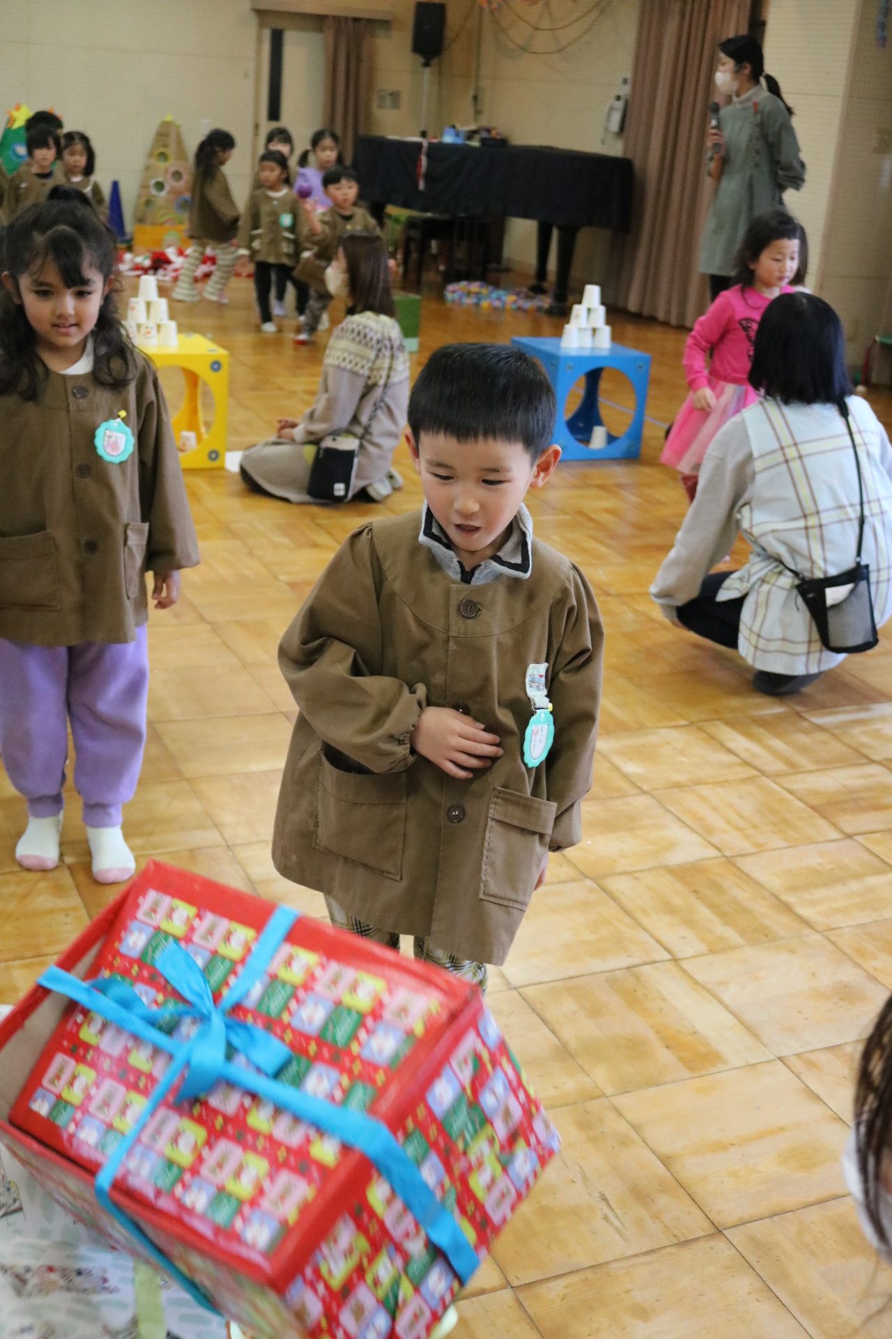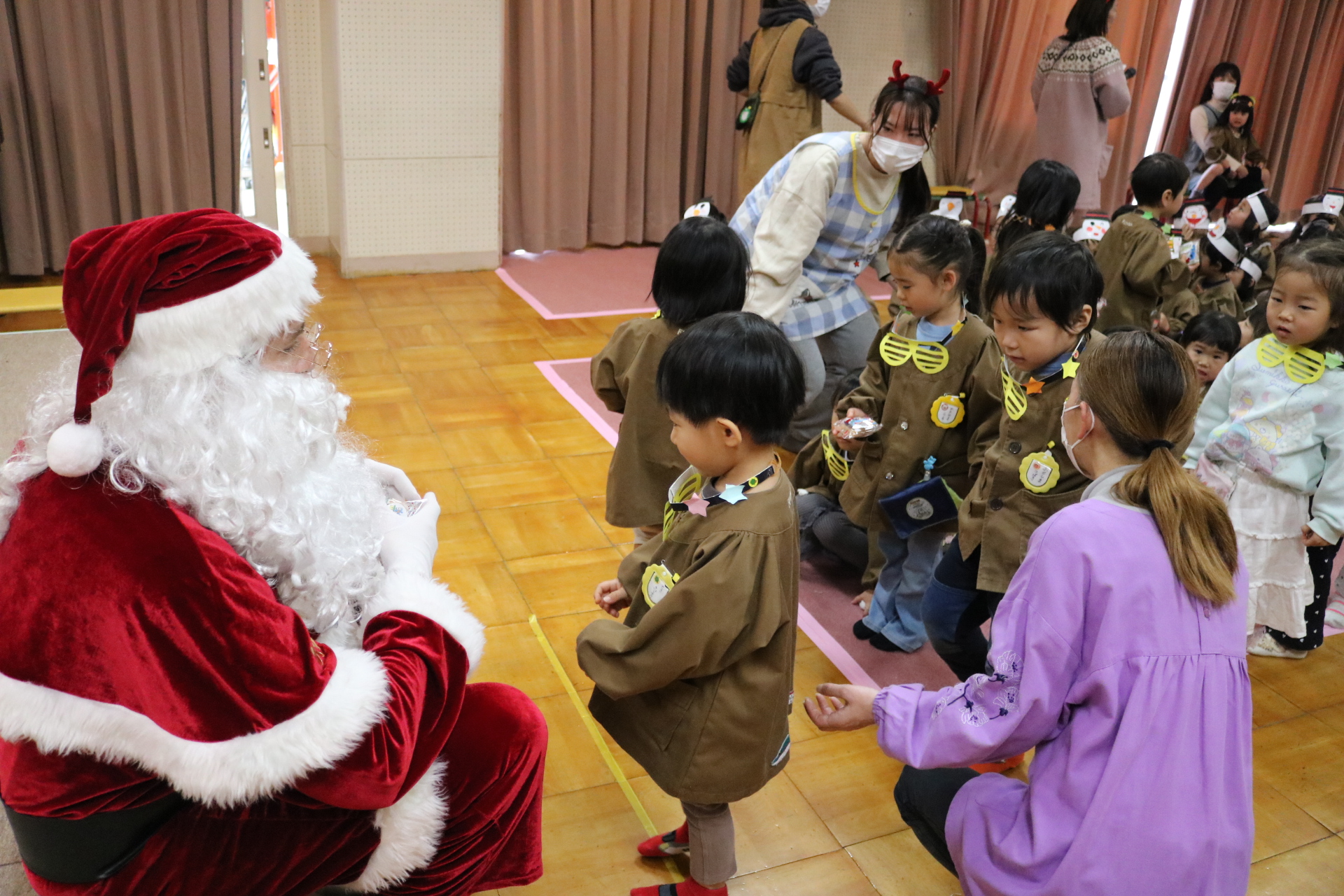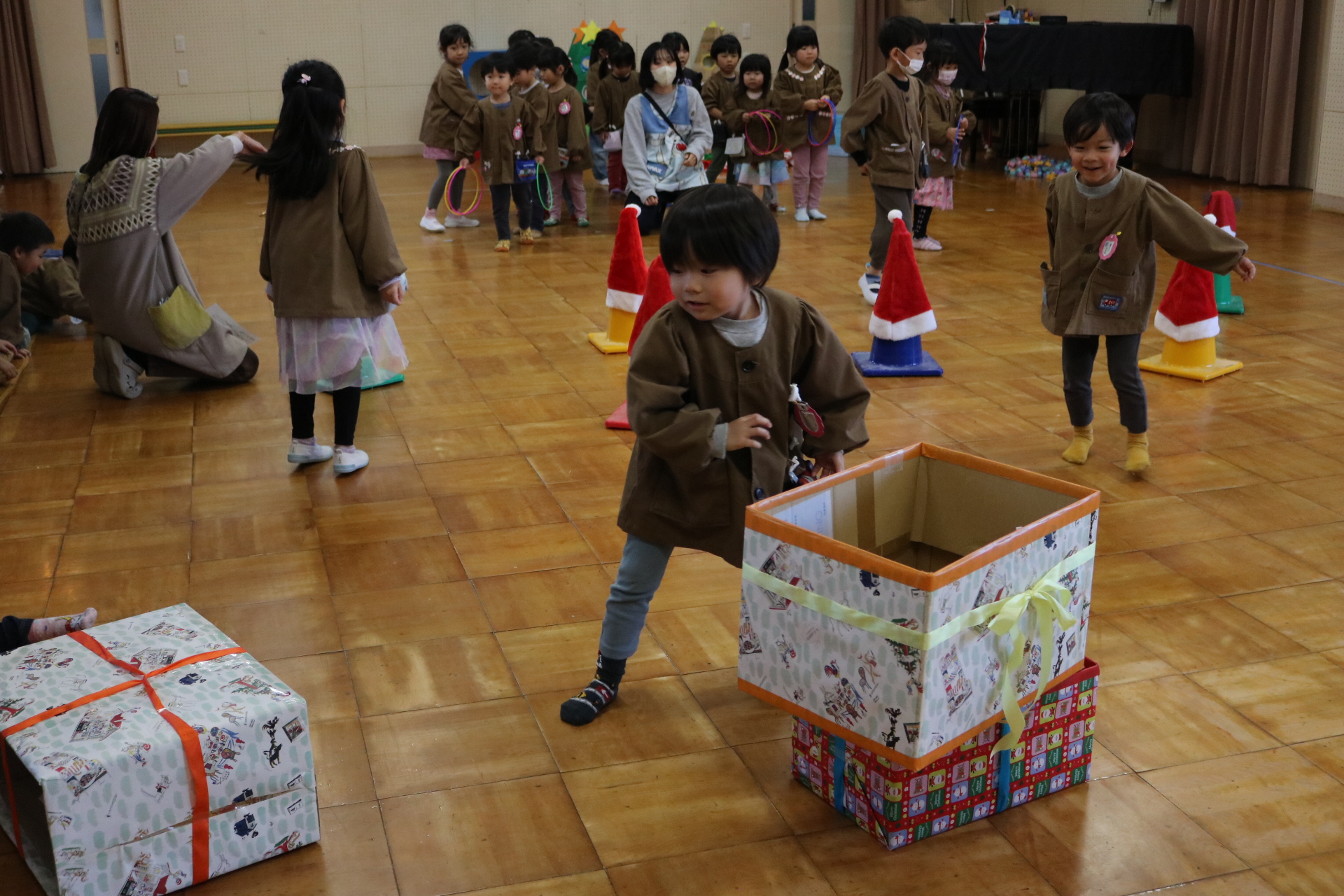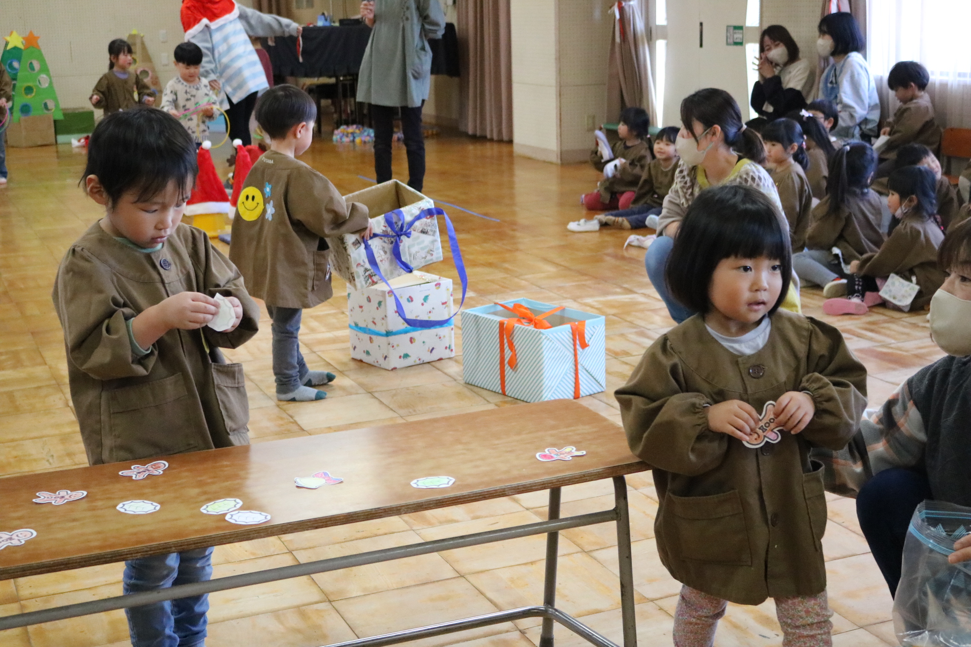可愛い衣装に可愛い踊り🎵サンタさんからプレゼントももらえて喜ぶ子どもたちでした😊