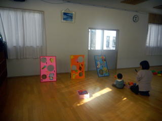 穴の中へボールが投げ入れるゲームです。他には手作りボーリング、お絵描きコーナーもあります