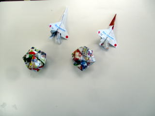 より子ども達にプレゼントをいただきました。 紙で折ったブルーインパルスとボールです。たくさんいただきありがとうございました。